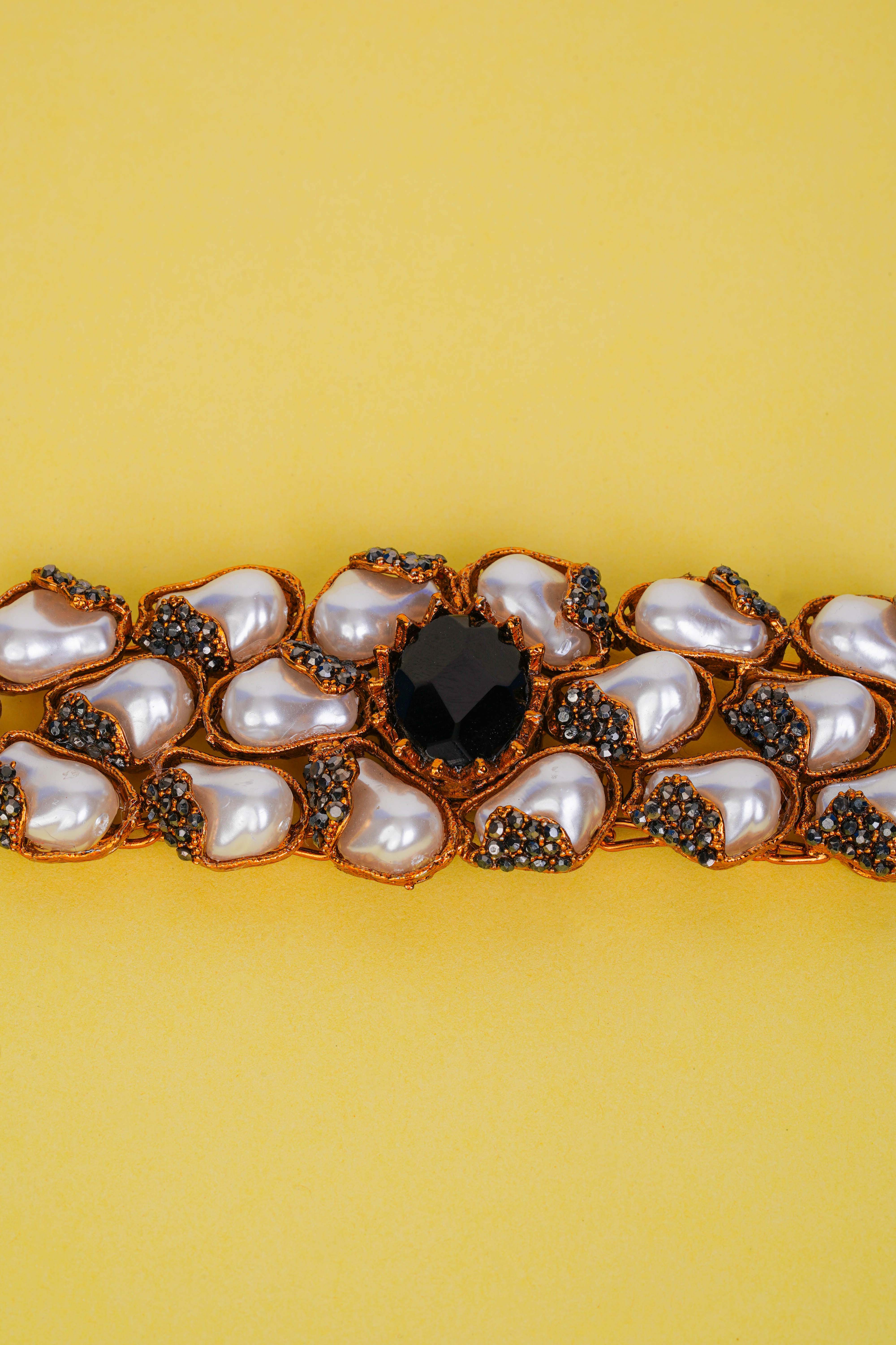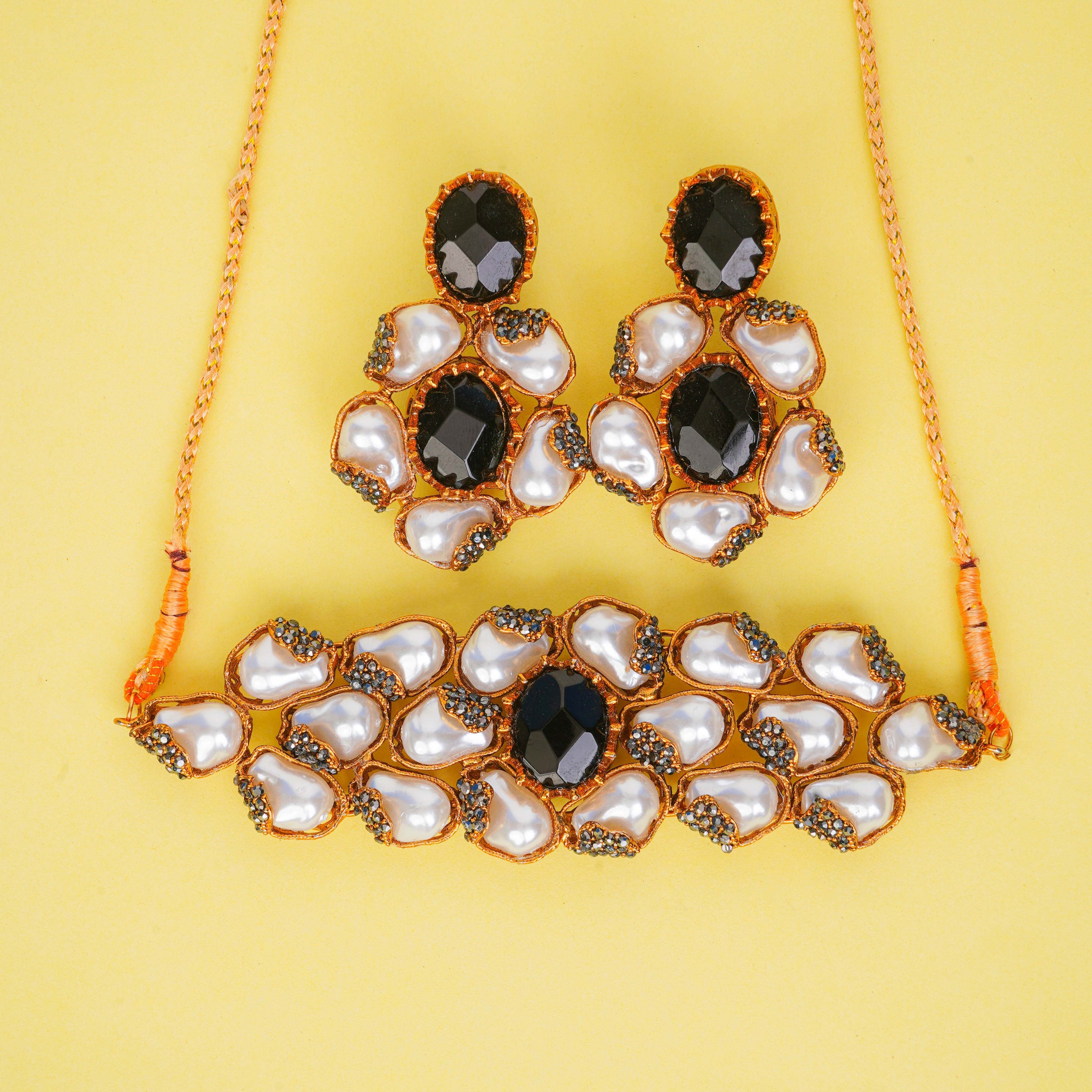 Drape yourself in timeless sophistication with the Noir Elegance Pearl Necklace Set. This exquisite piece features bold black stones surrounded by lustrous pearls and shimmering gunmetal crystal accents, making it the perfect accessory for formal evenings, parties, or contemporary ethnic wear.