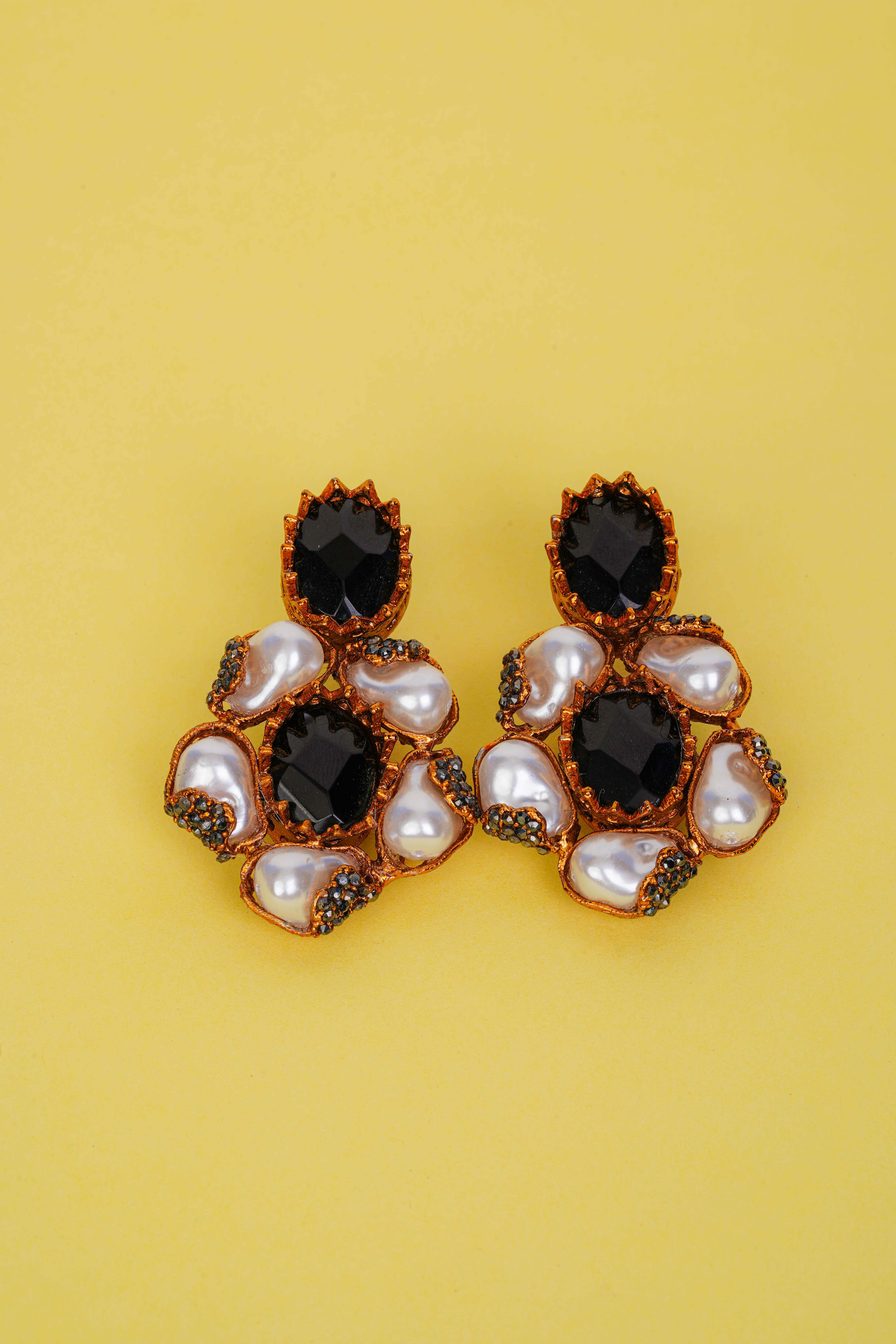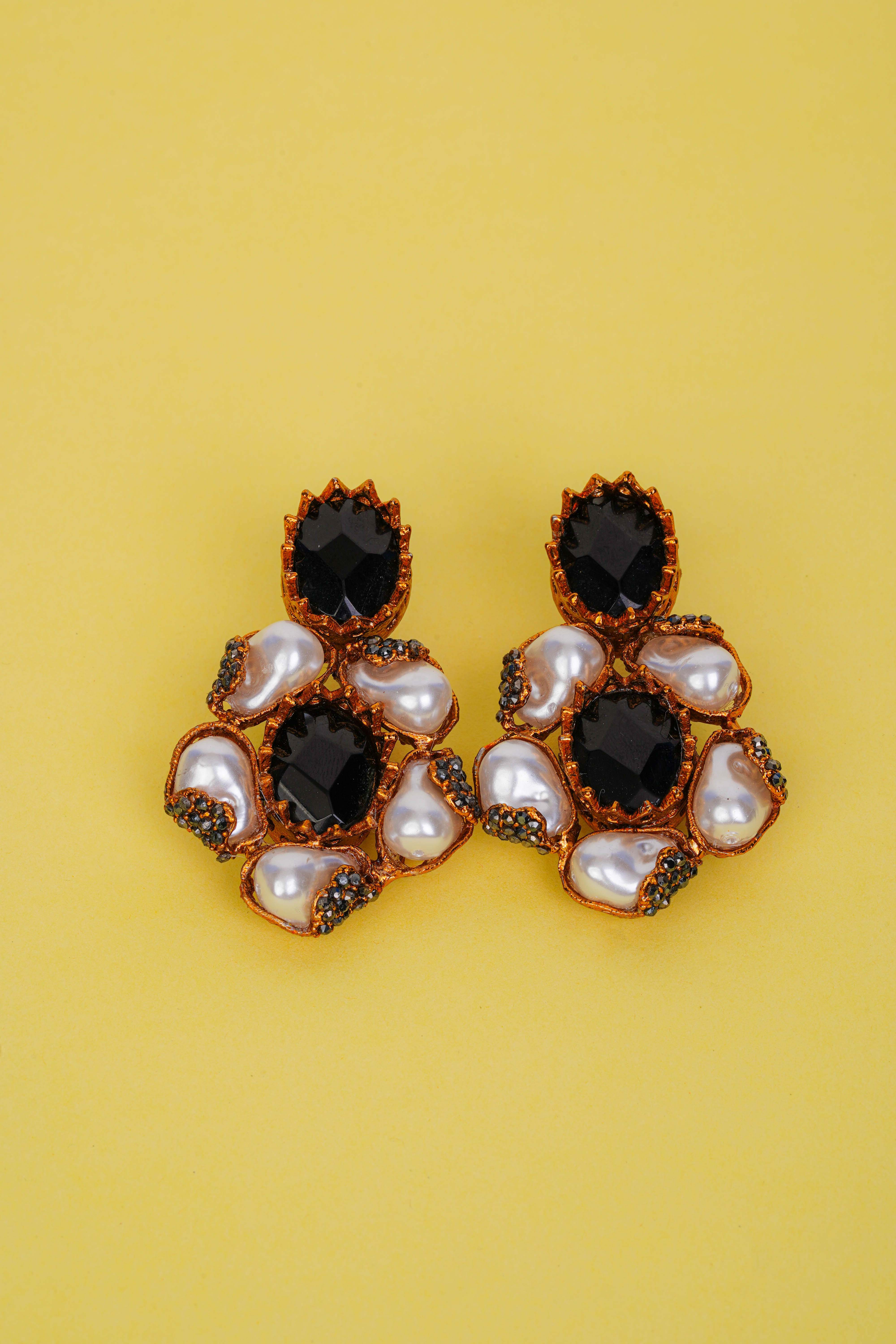 Pearls: Elegant white synthetic teardrop pearls create a harmonious balance with the deep black centers.