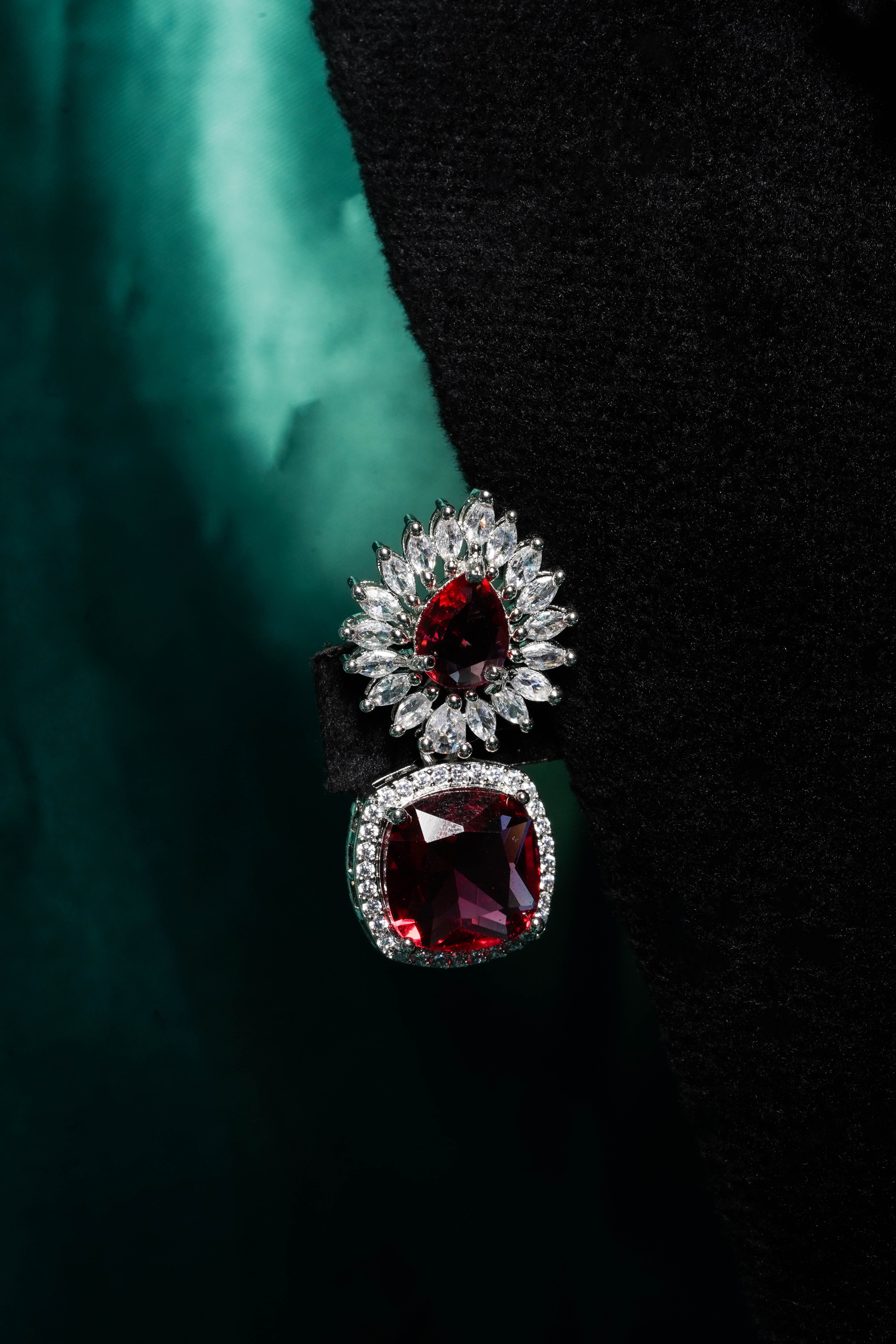Features a vivid red gemstone centerpiece in cushion and pear cuts.