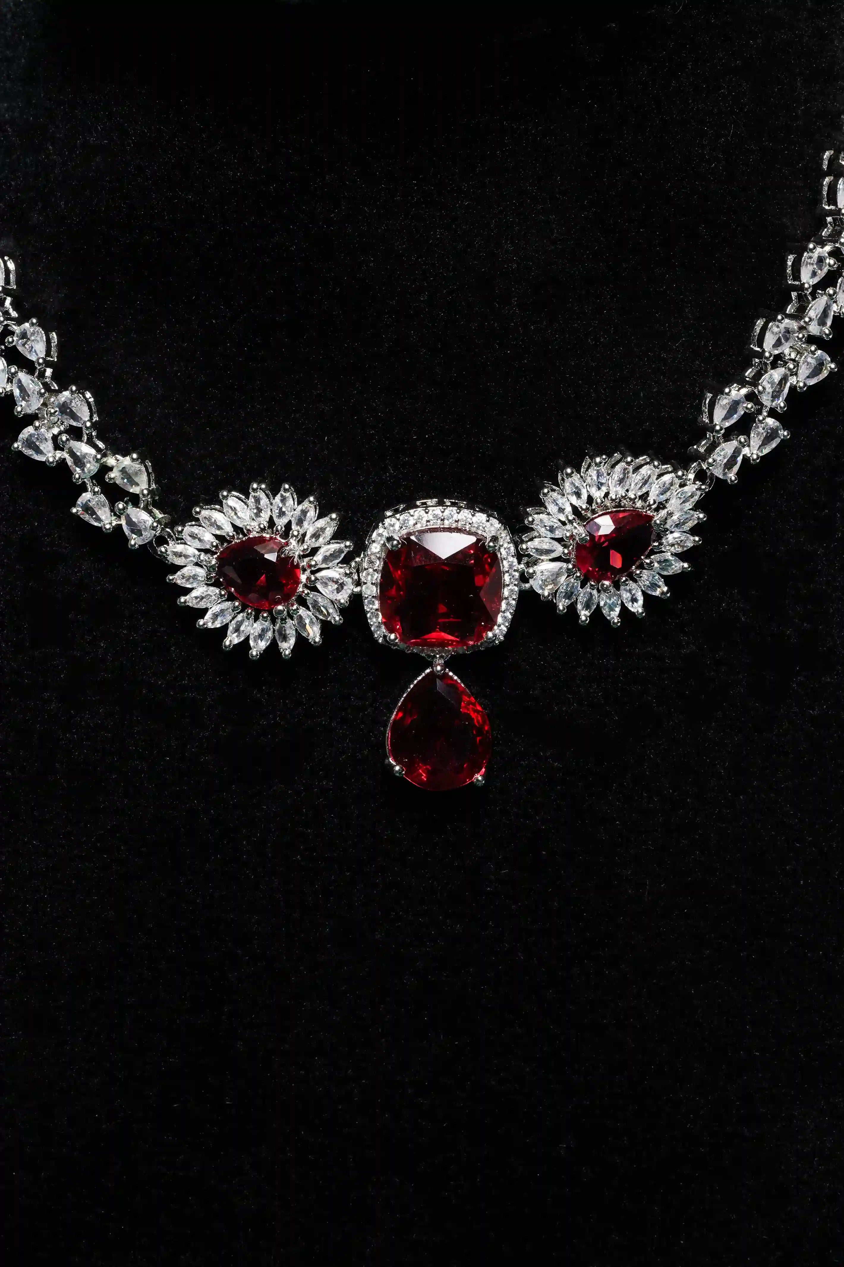 The Crimson Blossom Necklace Set is a masterpiece of elegance, crafted to captivate with its deep ruby-red stones and sparkling crystal embellishments. The design blends floral-inspired motifs with luxurious detailing, creating a regal look perfect for weddings, festive celebrations, or formal evenings.