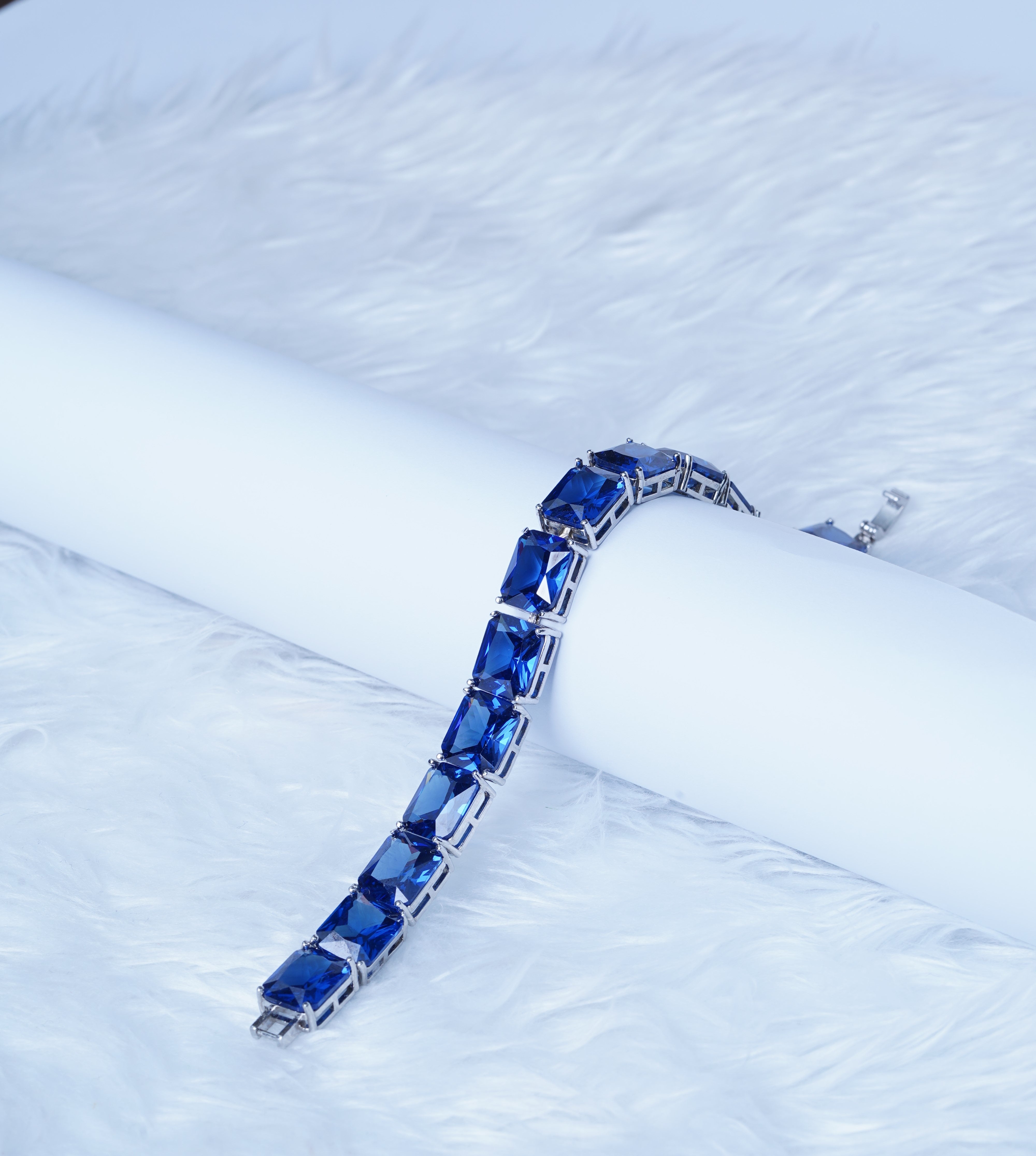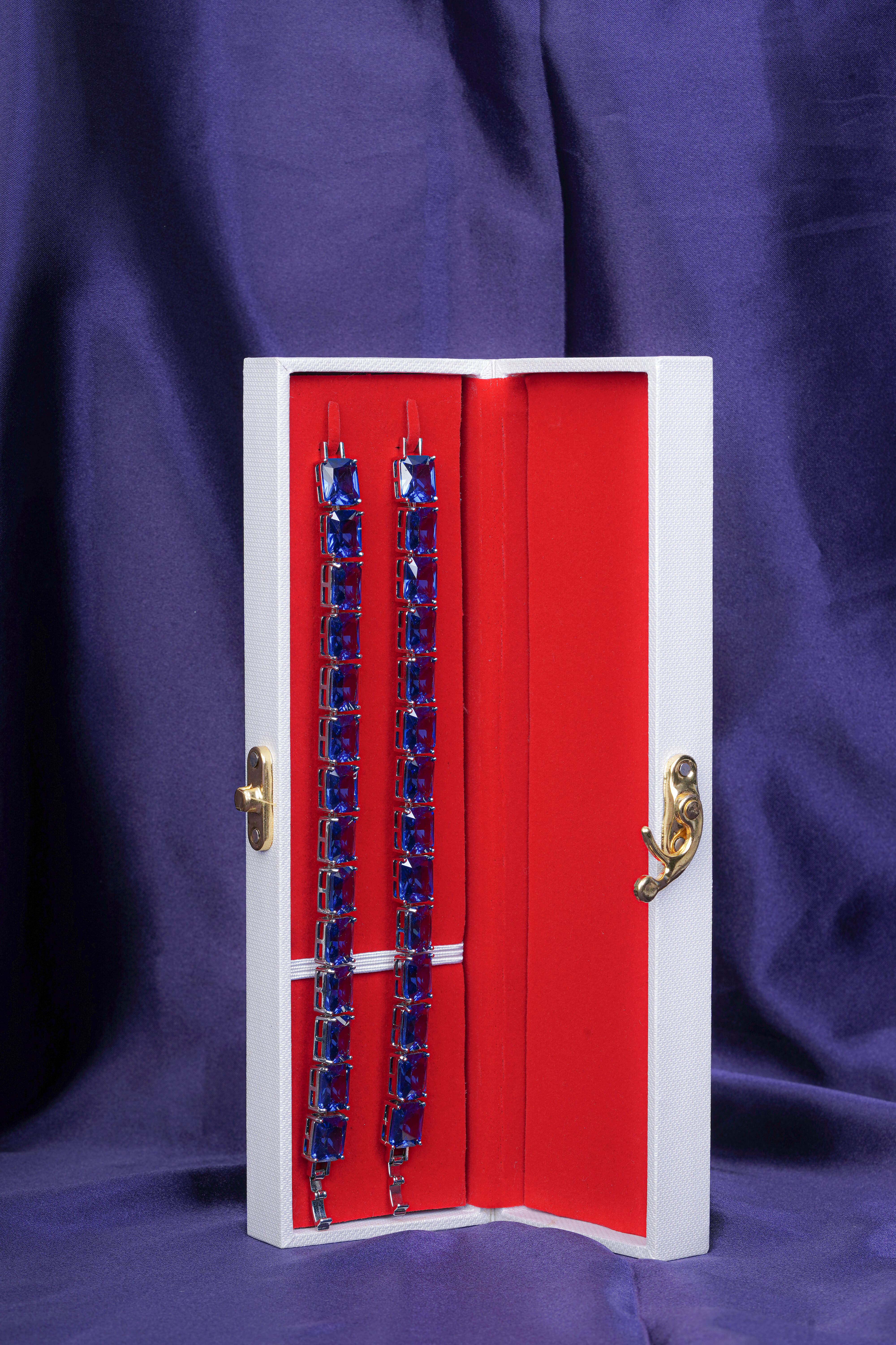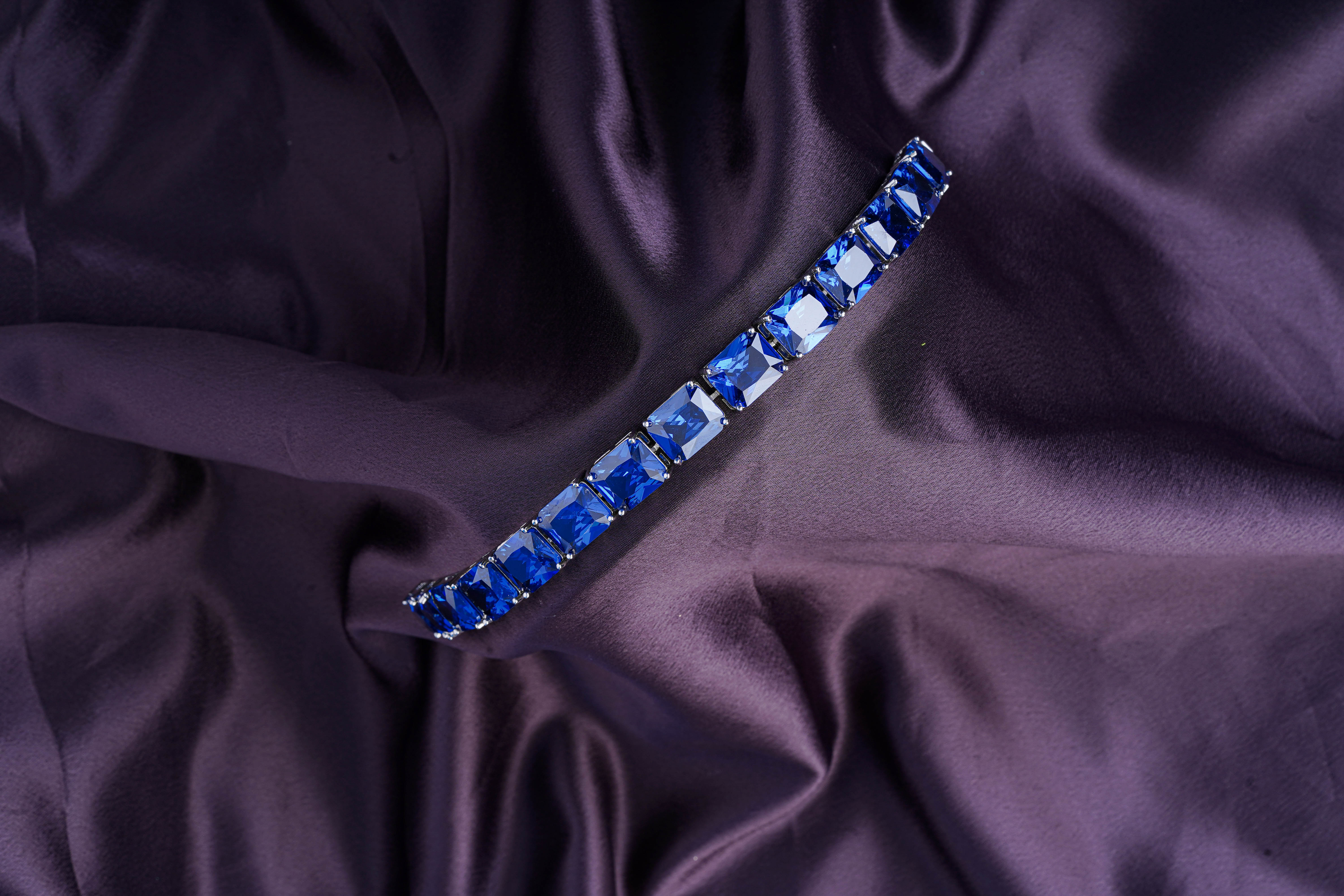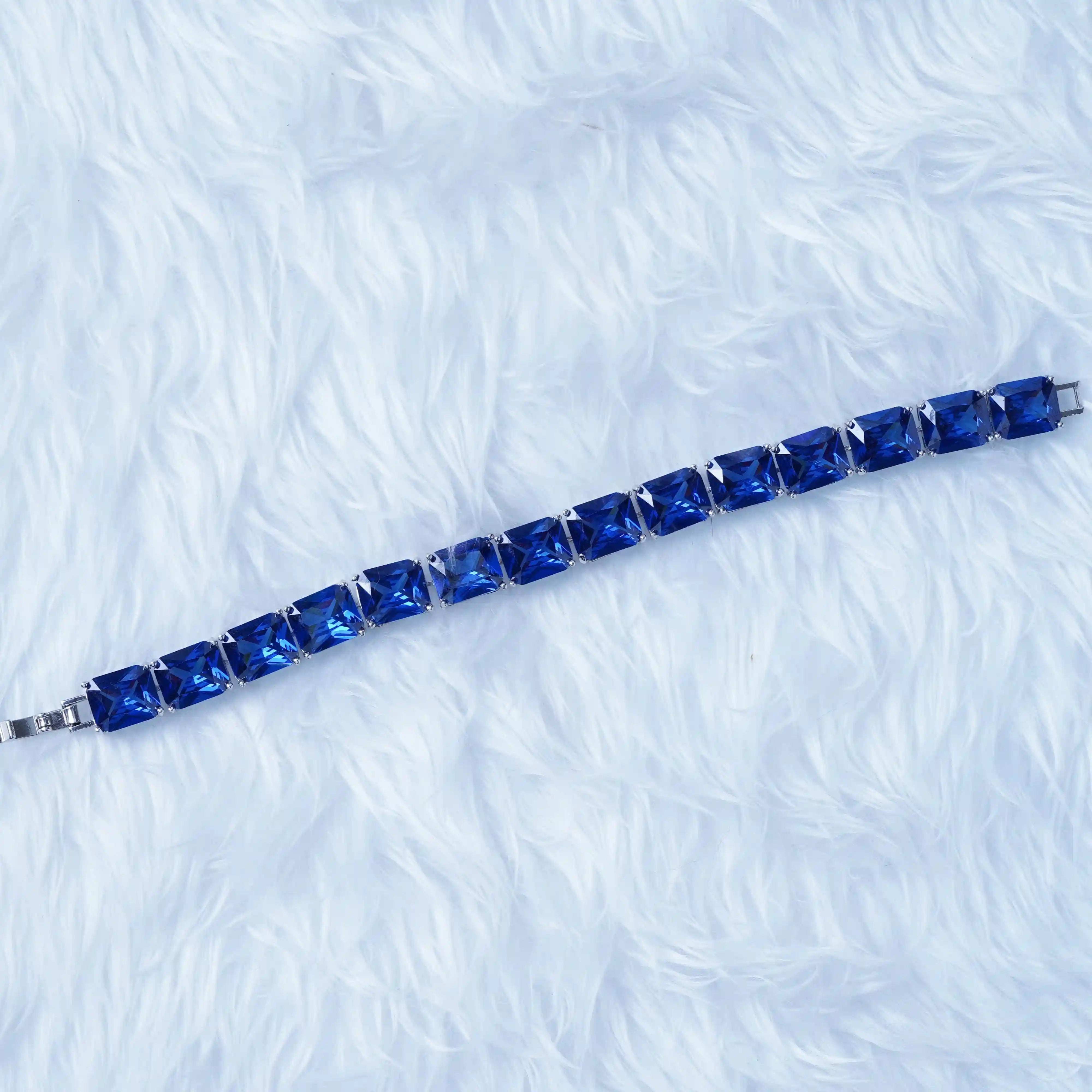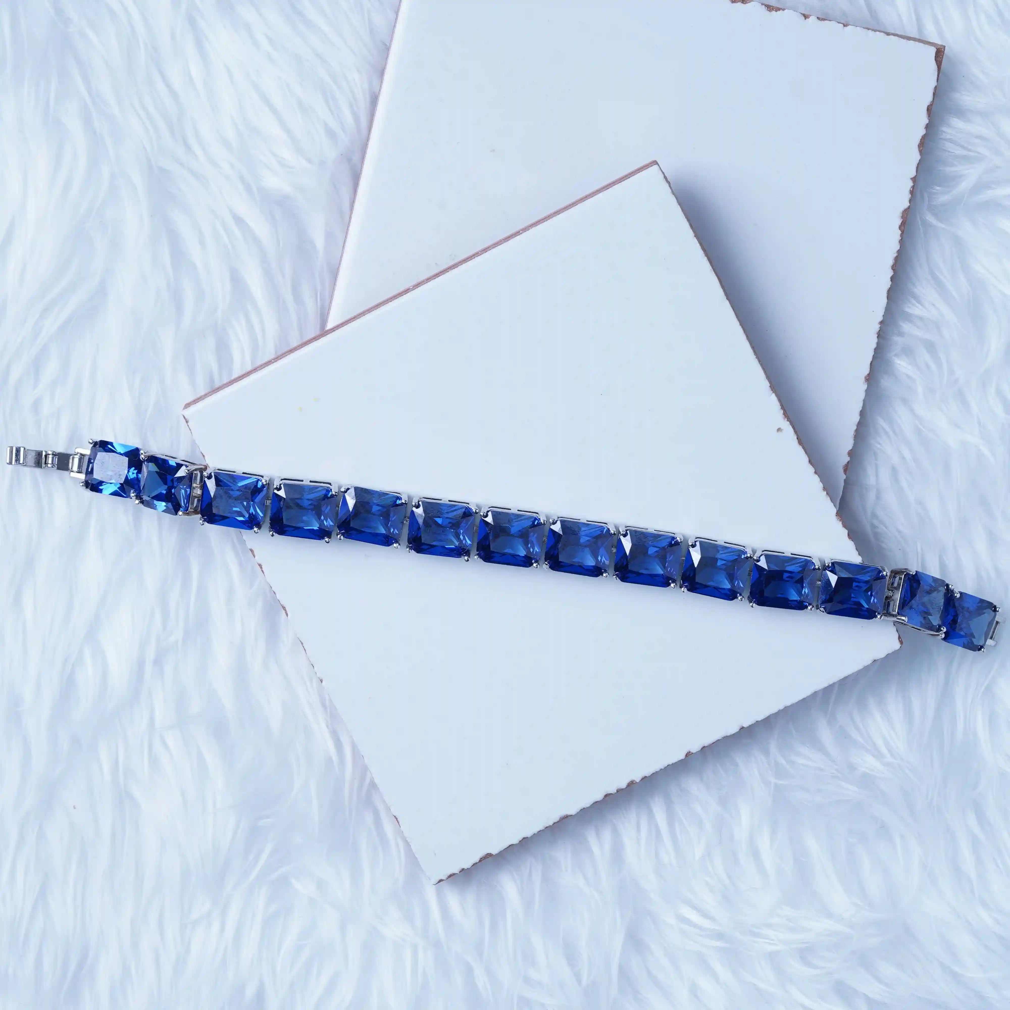 Enhance your style with this stunning blue gemstone bracelet, a perfect blend of elegance and sophistication. Featuring emerald-cut blue stones set in a high-quality silver-plated frame, this bracelet radiates luxury and charm.