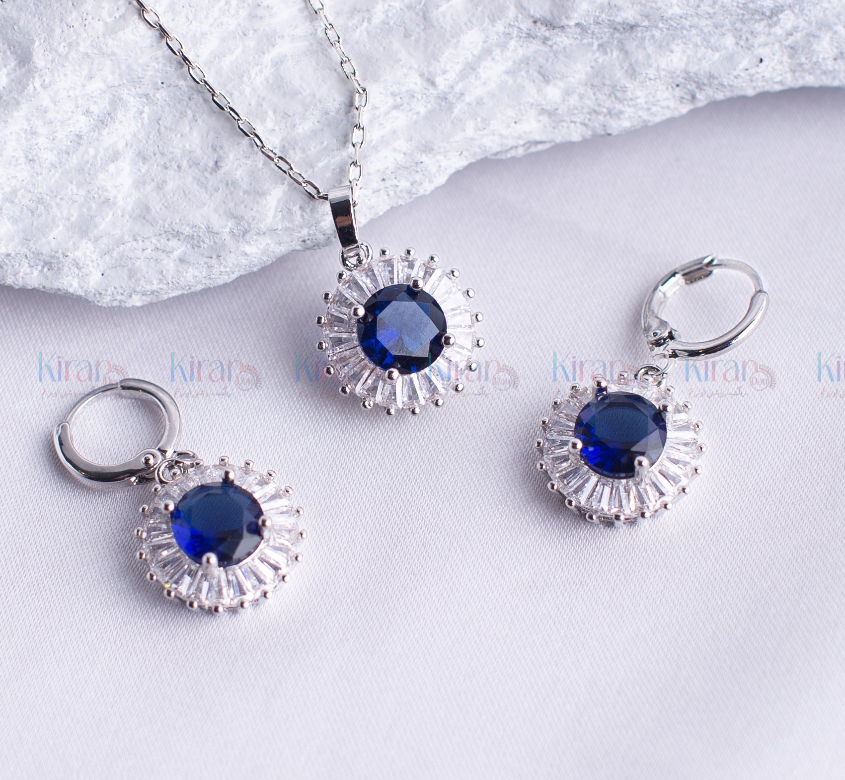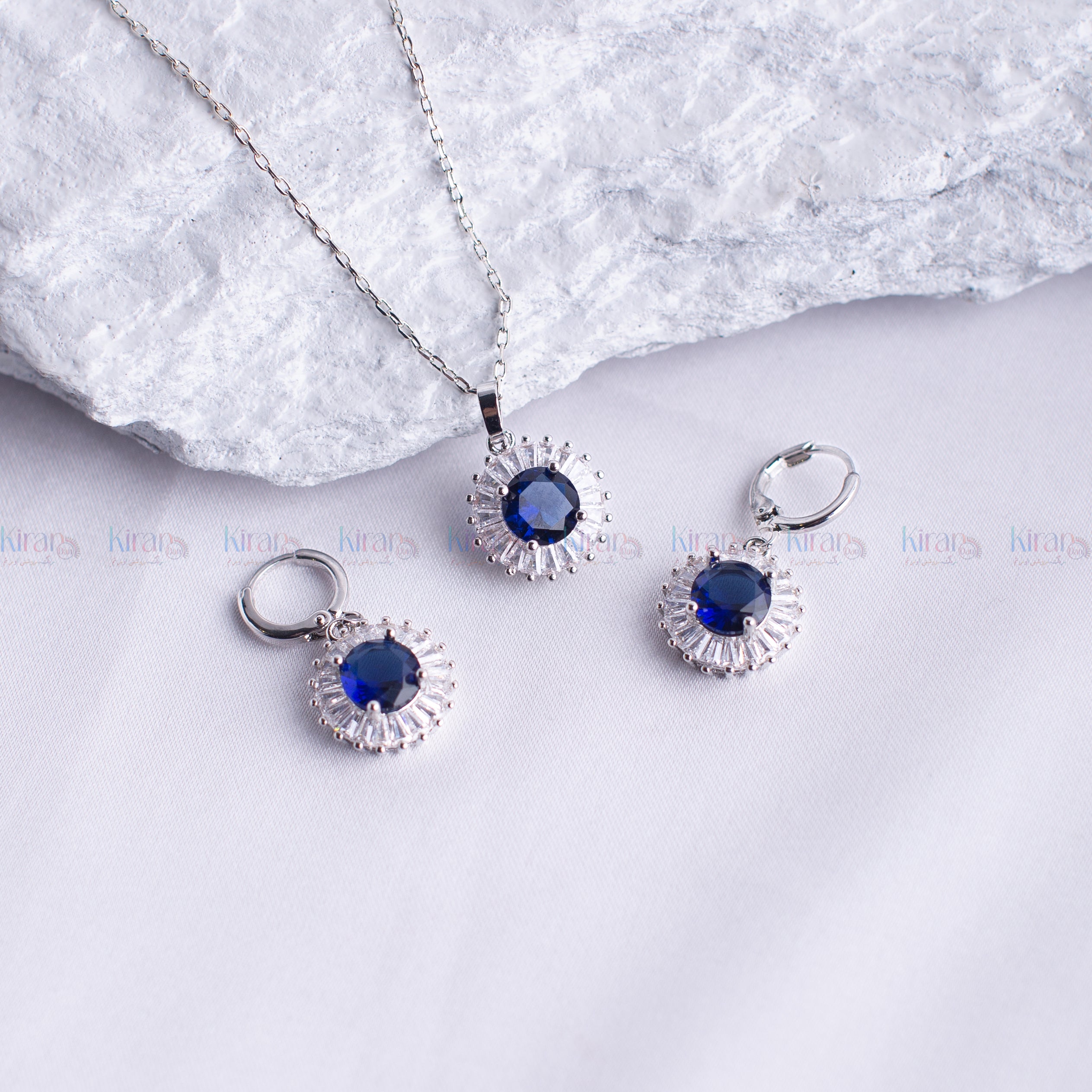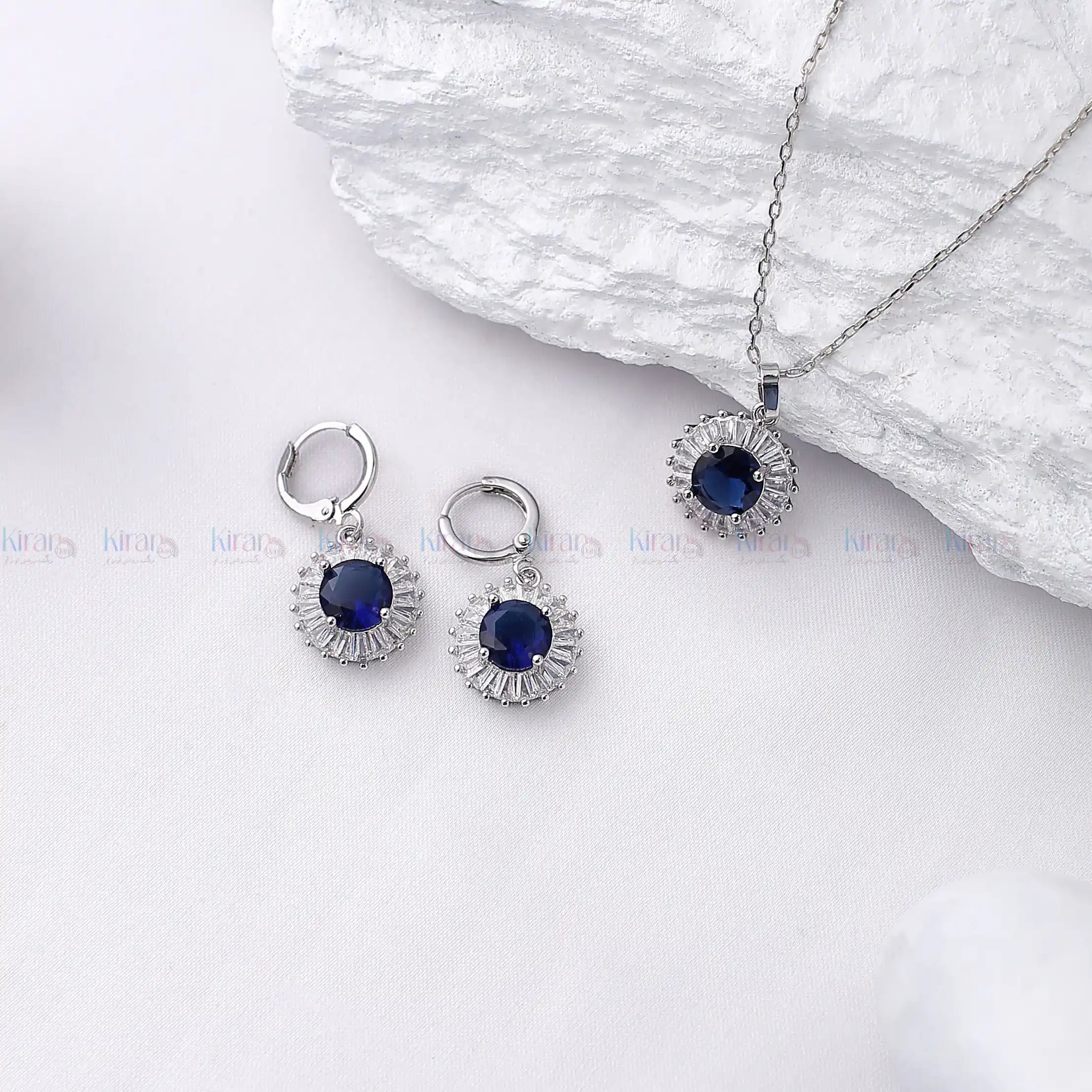 Add a touch of majestic elegance to your ensemble with the BLUE MOON PENDENT Set—a brilliant trio of refined luxury and classic charm. This pendant and earring set features a striking deep sapphire-blue round-cut stone at the center of each piece, radiating an air of sophistication and royalty.