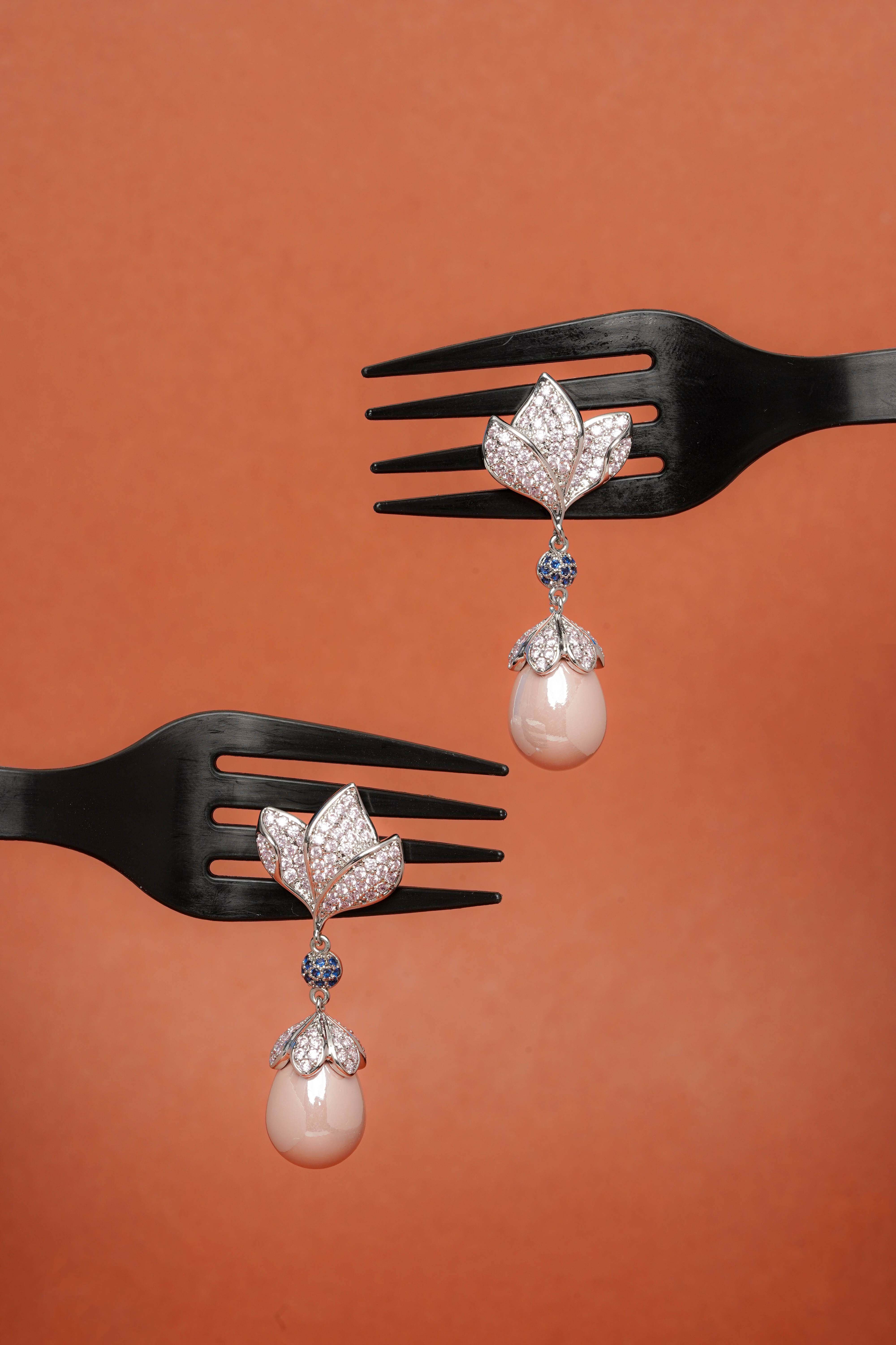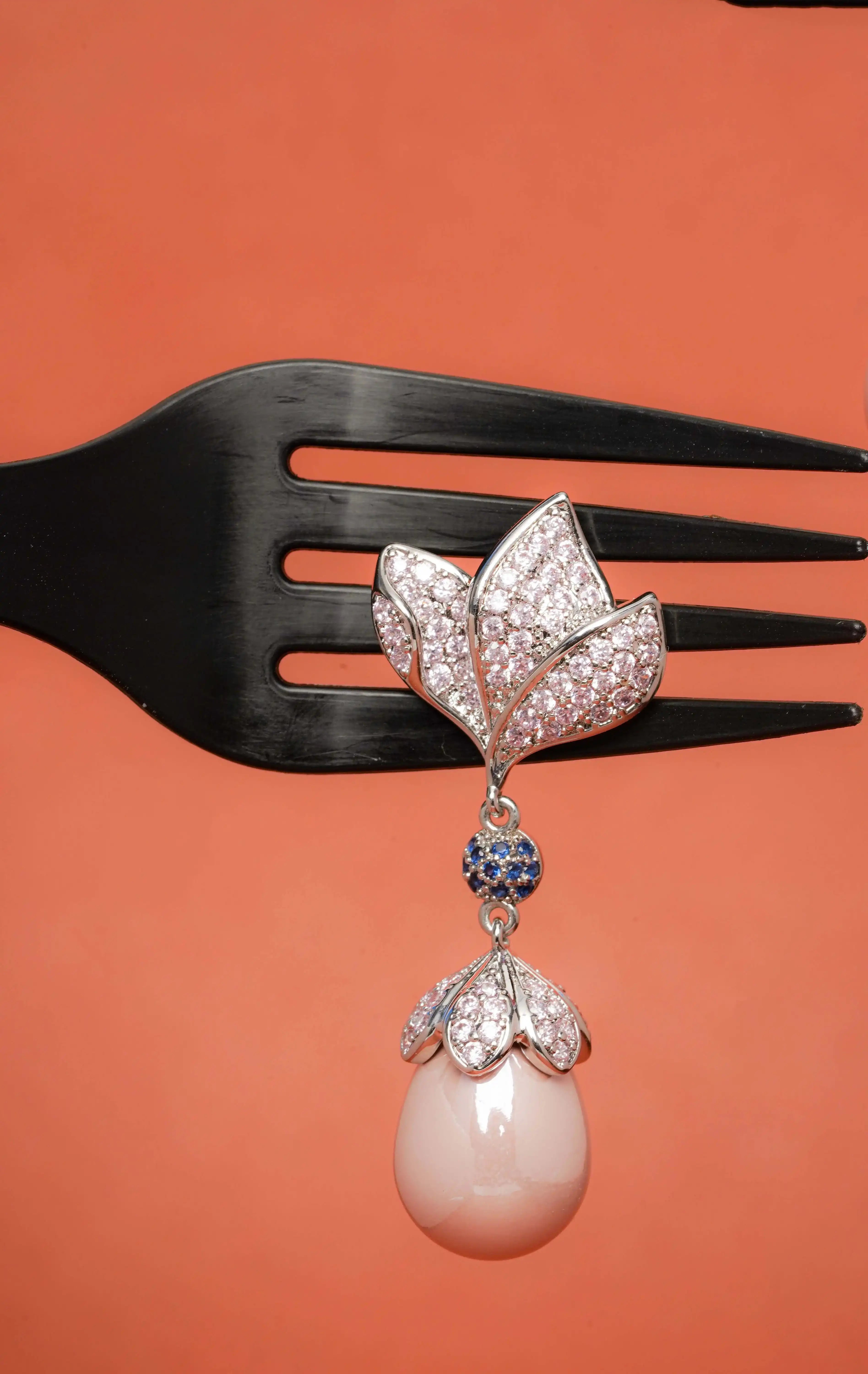 Suspended below, a lustrous blush-pink pearl adds a whisper of femininity, while the subtle touch of sapphire-blue accents lends a refined contrast. Crafted in a gleaming silver tone, this design embodies timeless grace — a perfect balance between modern glamour and classic allure.