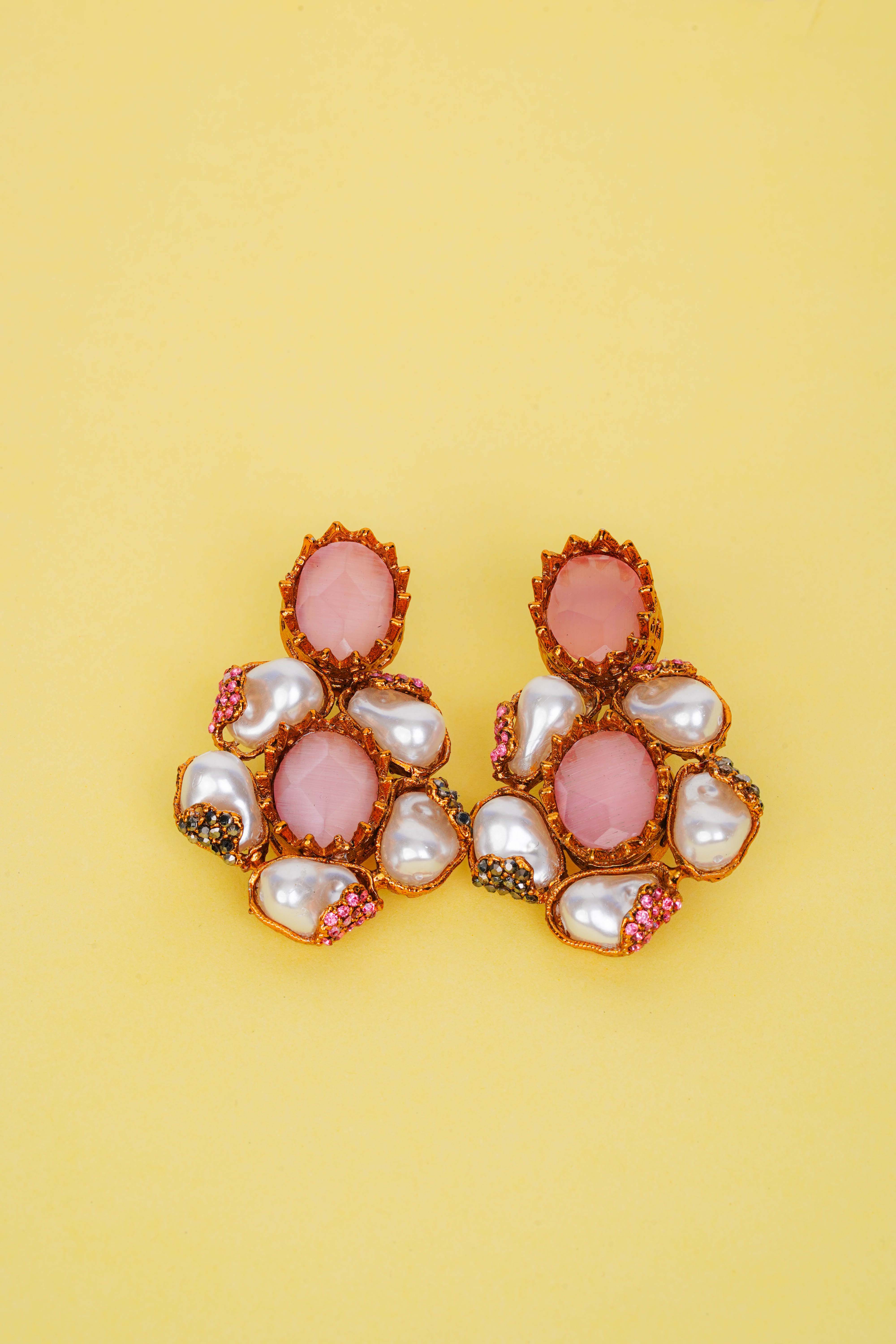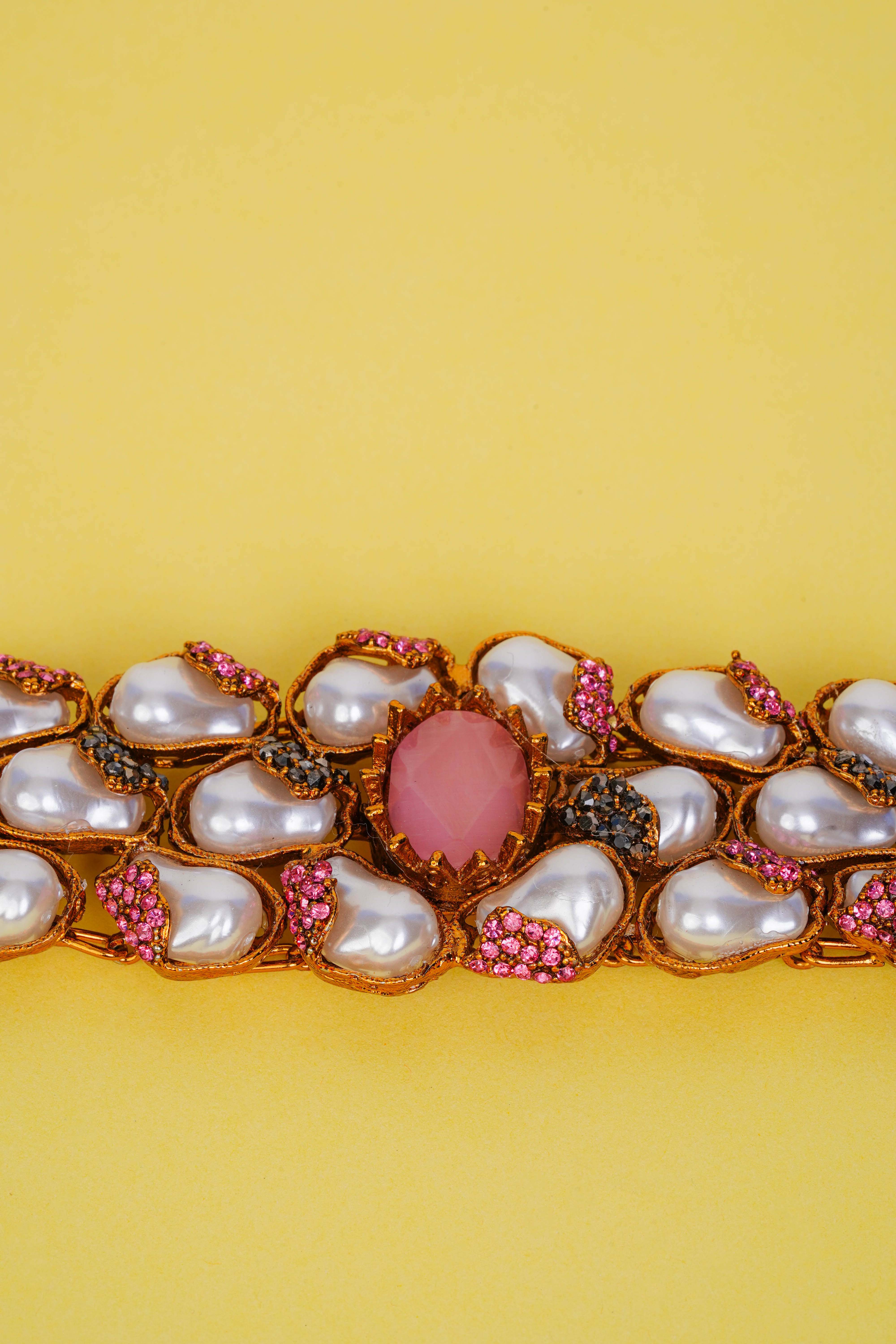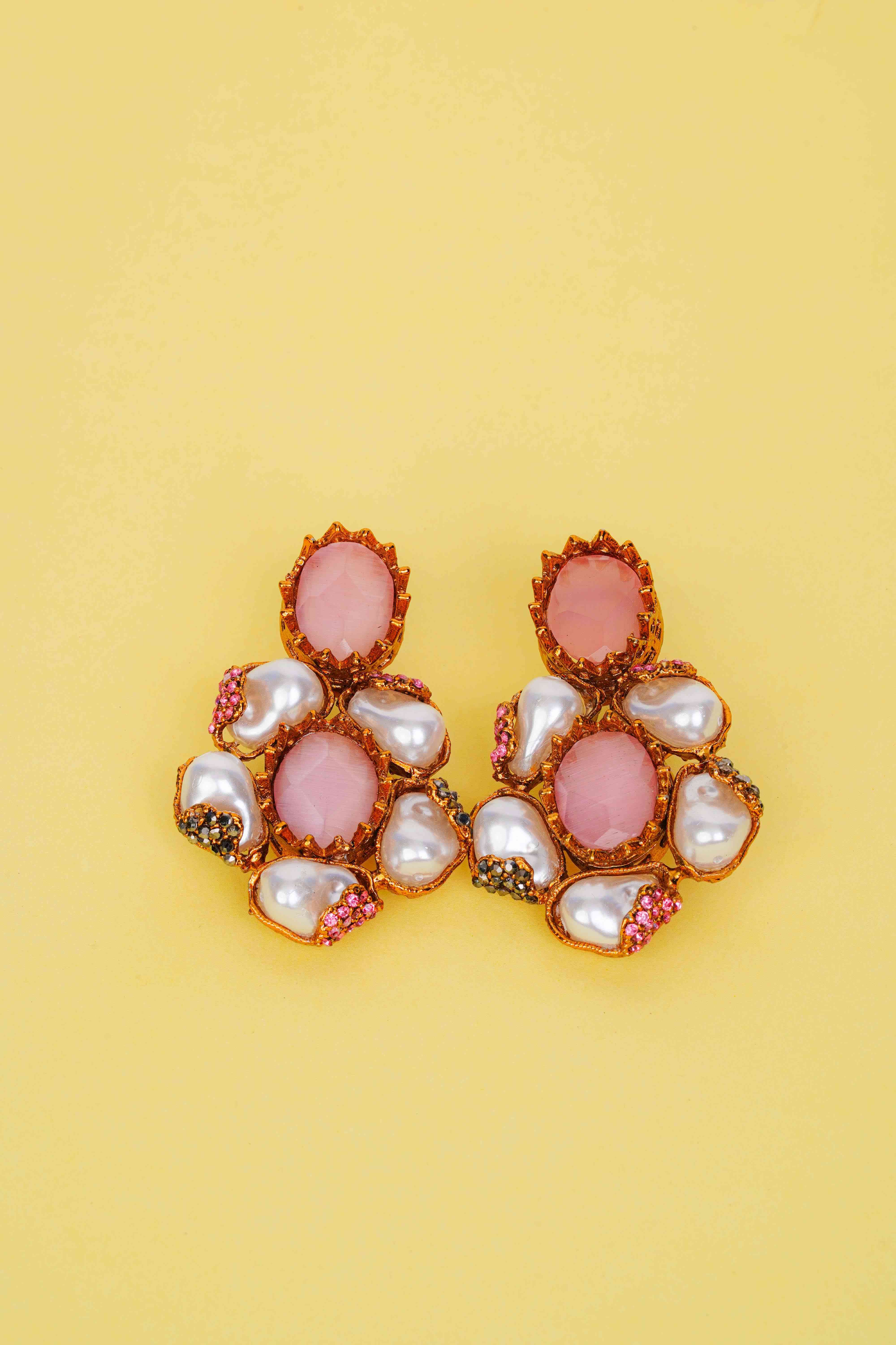 Accents: Teardrop-shaped synthetic pearls, paired with glittering clusters of pink and gunmetal grey crystals, provide dimension and sparkle.