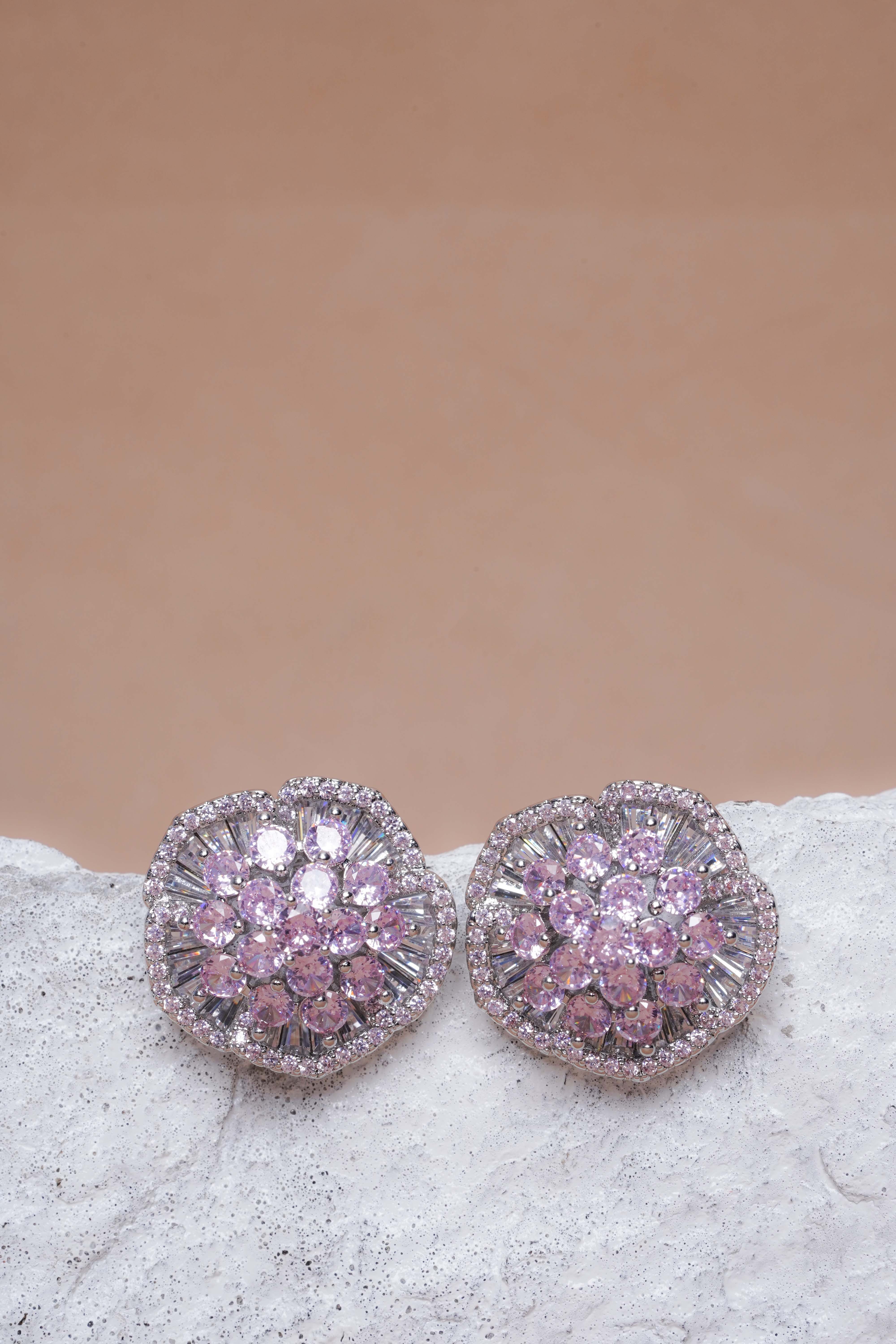 Soft, sparkling, and irresistibly graceful — our Blush Radiance studs embody the essence of modern femininity. Crafted in a stunning floral silhouette, these earrings feature delicate blush-pink stones encircled by a halo of shimmering crystals that capture light from every angle.