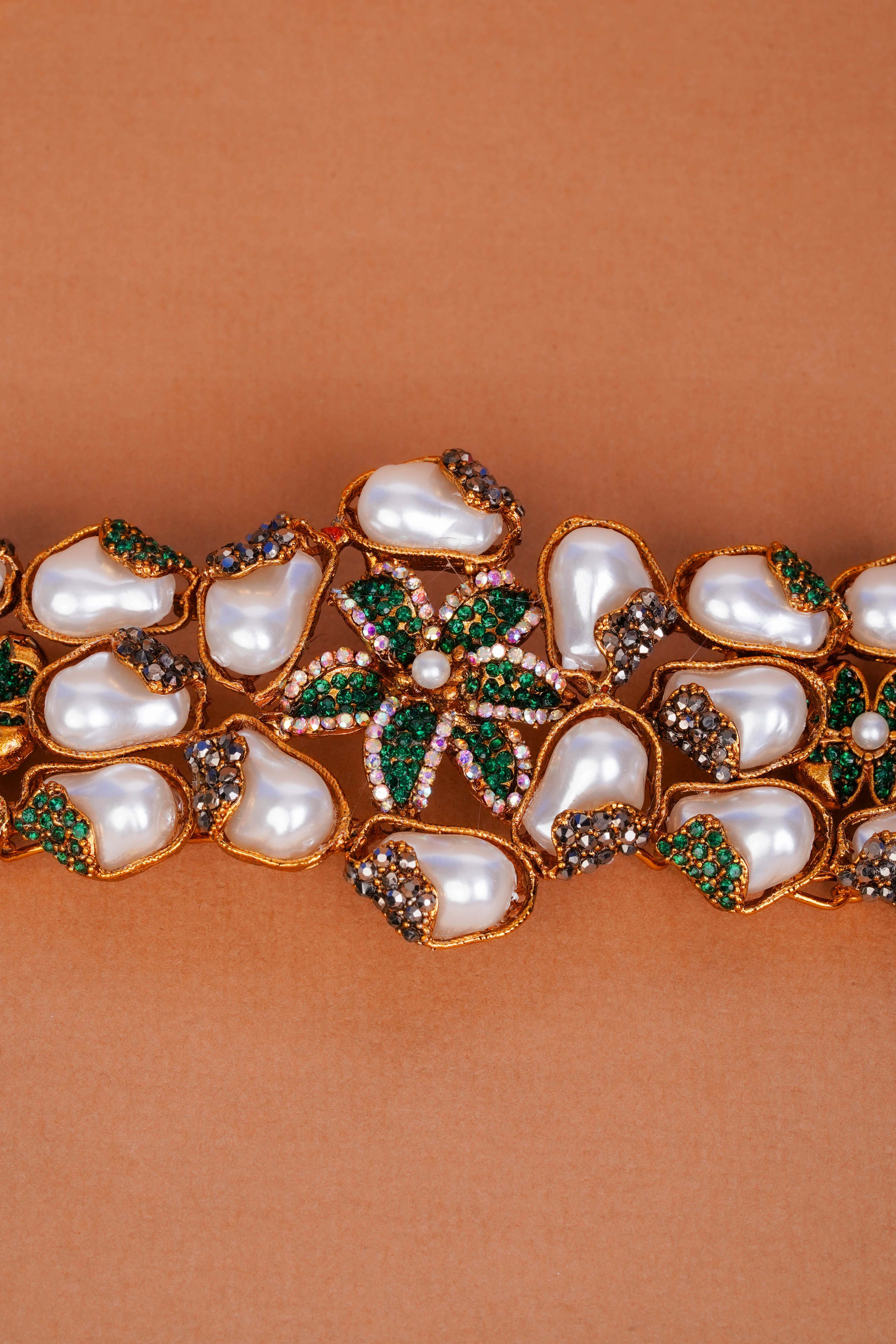 Pearl Embellishments: Hand-set synthetic pearls in teardrop shapes provide a luminous contrast against the green and antique crystal accents.