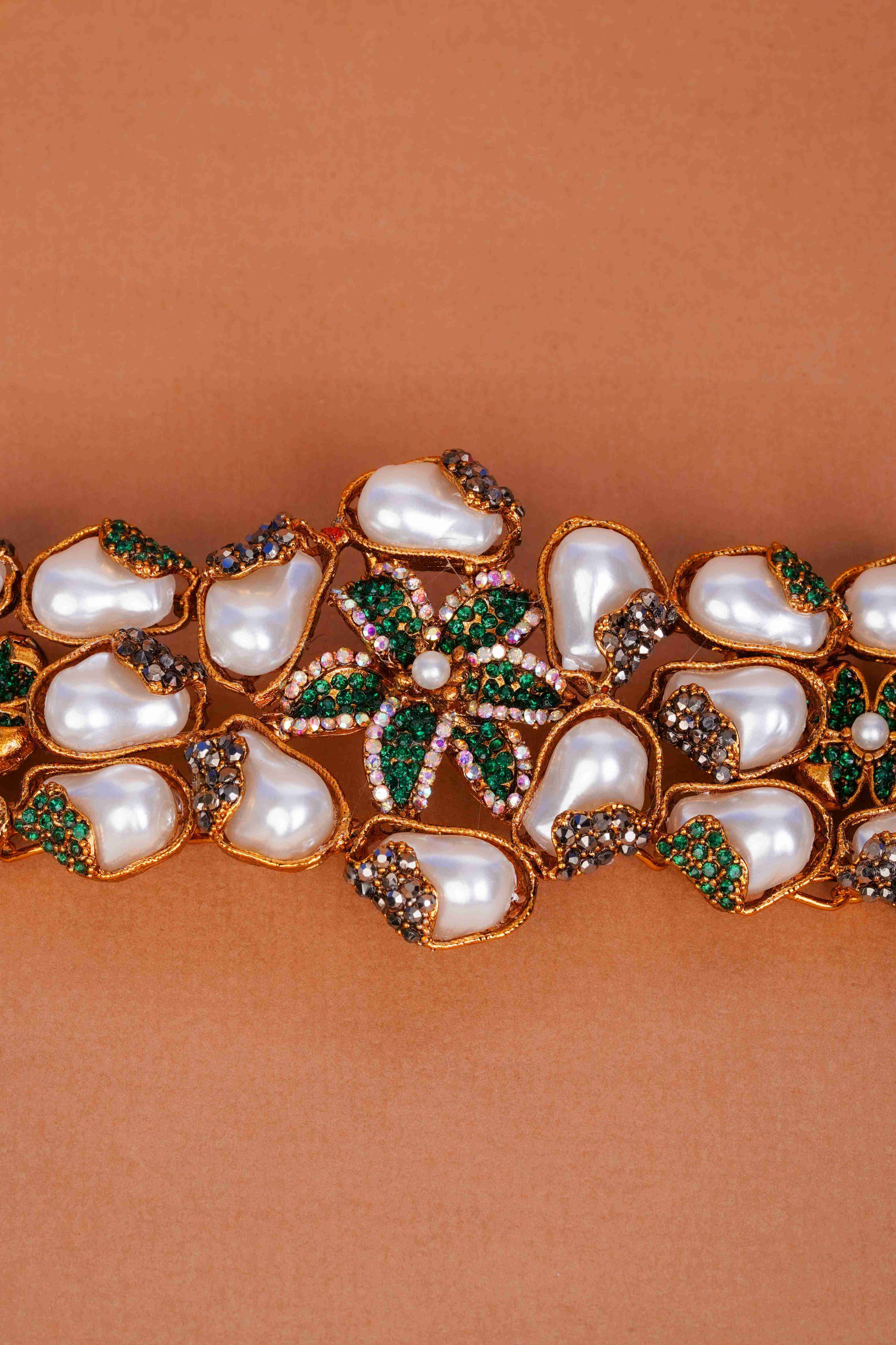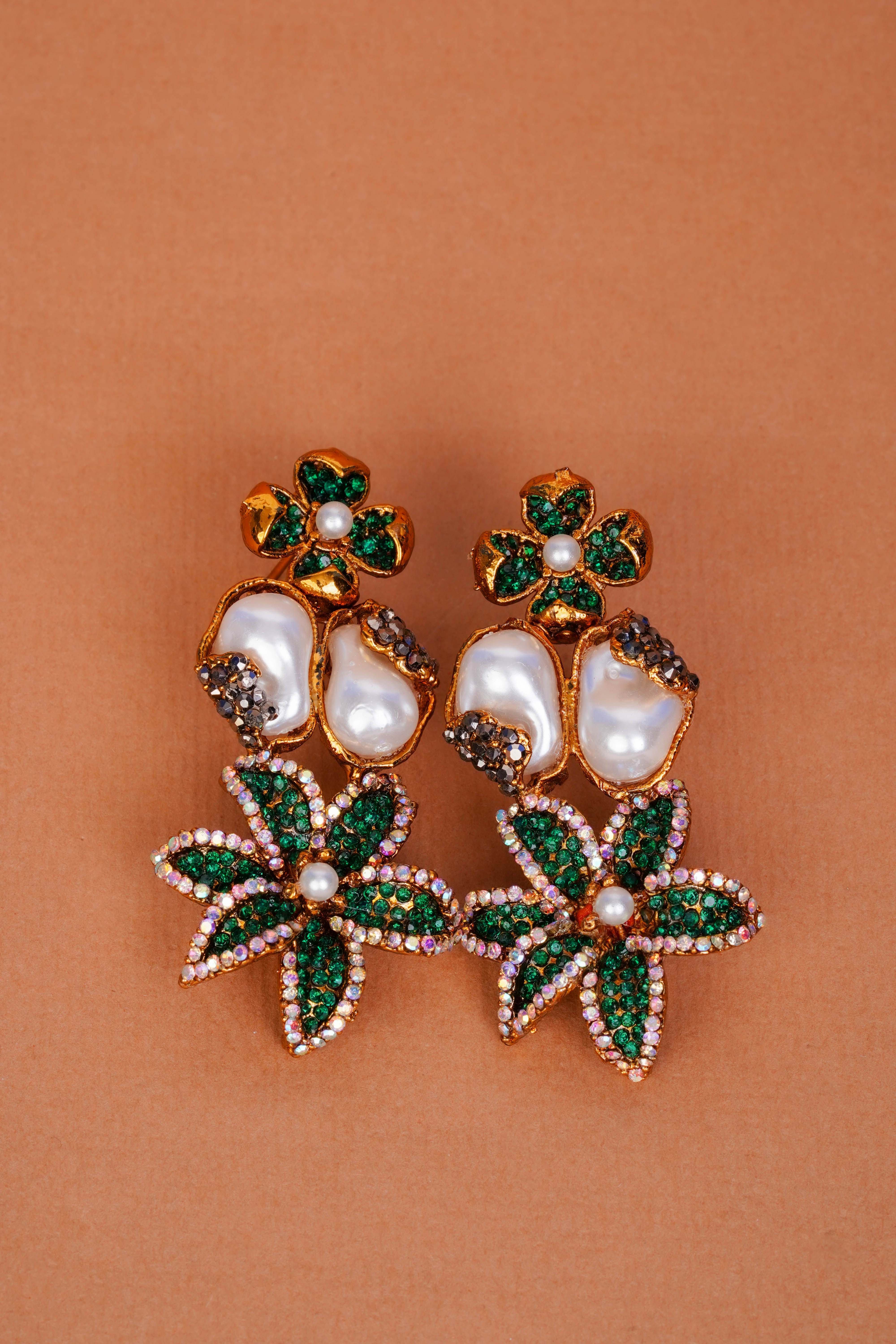 Floral Motifs: Delicate flower designs with emerald green crystal petals and pearl centers add a nature-inspired elegance to the overall design.