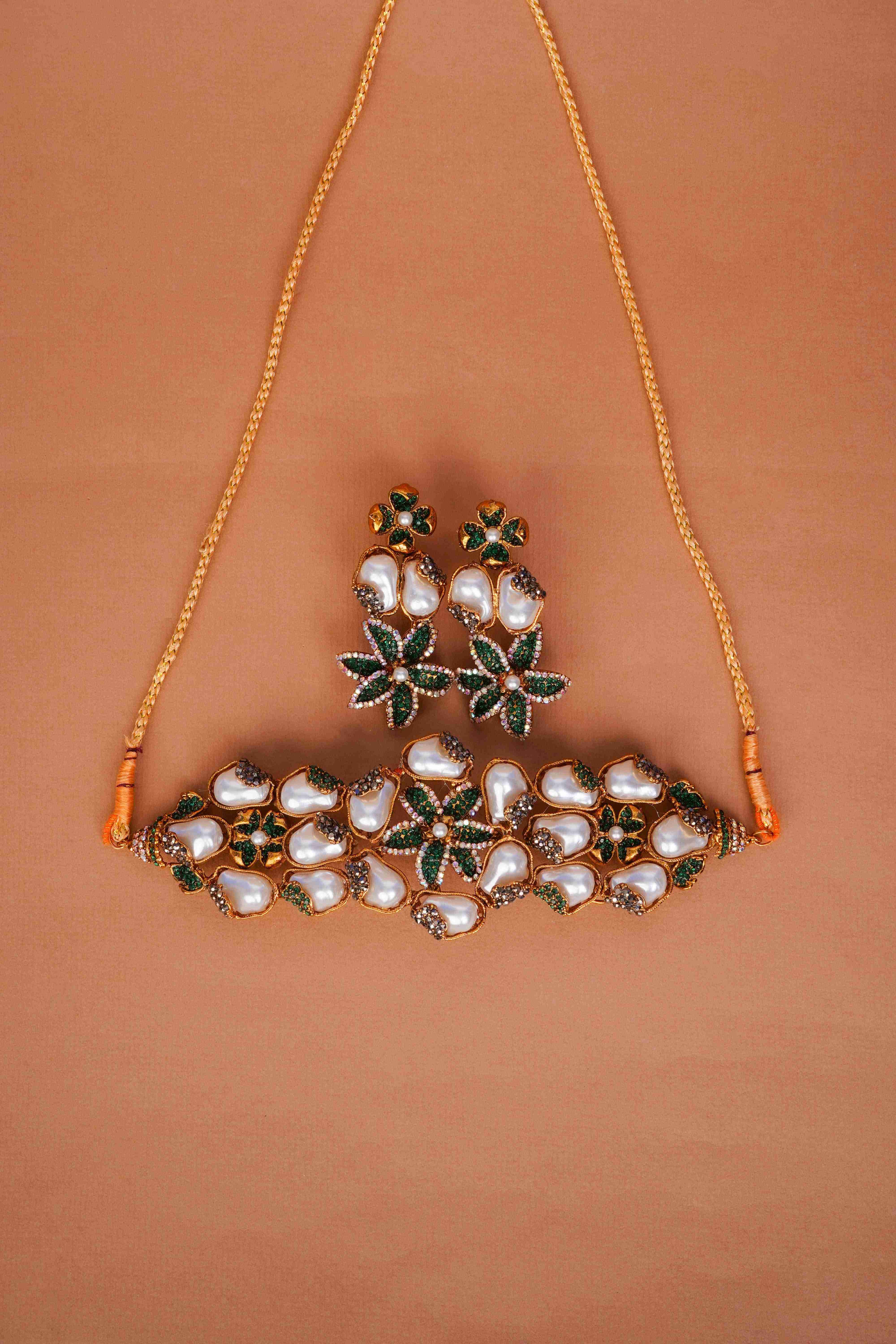 Inspired by the elegance of a blooming garden, the Emerald Petal Pearl Necklace Set is a captivating blend of natural charm and luxurious design. Featuring vivid green floral accents, glowing pearls, and intricate detailing, this handcrafted set is perfect for festive wear, traditional ceremonies, and bridal events.