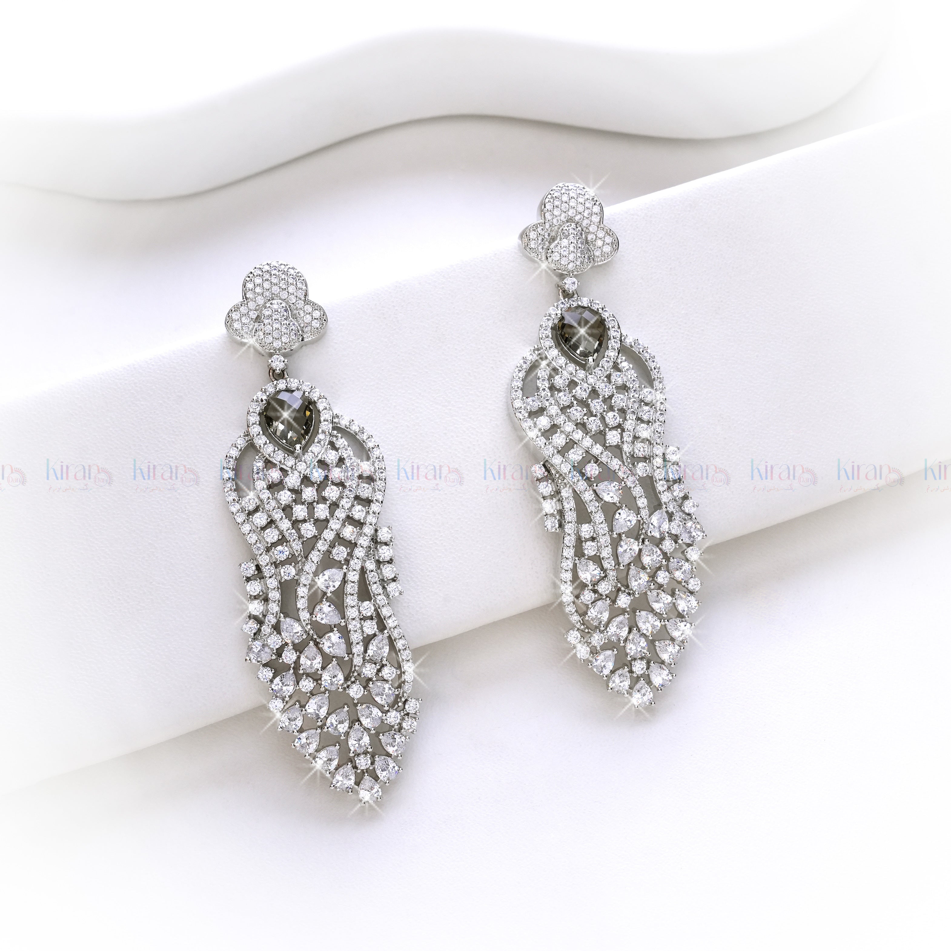 Crafted in luminous Silver White plating, the earrings feature a flowing, feather-like silhouette adorned with hundreds of micro-set, dazzling white cubic zirconia stones that shimmer with every movement. At the heart of the design lies a captivating pear-cut Grey gem, intricately carved with a crisscross pattern, adding a royal touch of depth and mystique.