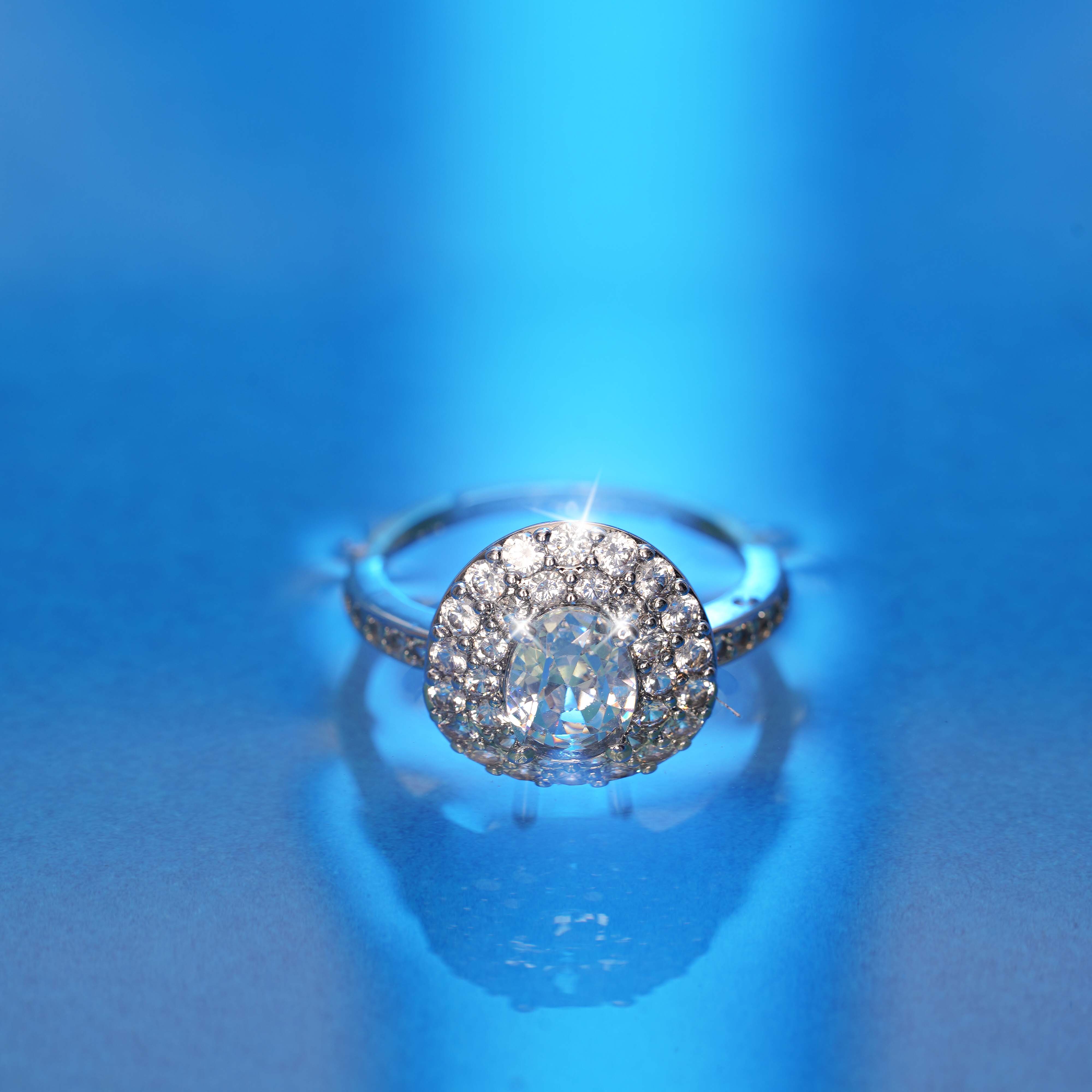 A masterpiece of timeless elegance, this ring showcases a captivating oval-cut sapphire at its center, radiating deep celestial blue hues. Encircled by a dazzling halo of brilliant-cut diamonds, the gemstone’s brilliance is magnified, creating a breathtaking display of light and fire. The diamond-studded band adds an extra layer of luxury, seamlessly blending sophistication with modern allure.