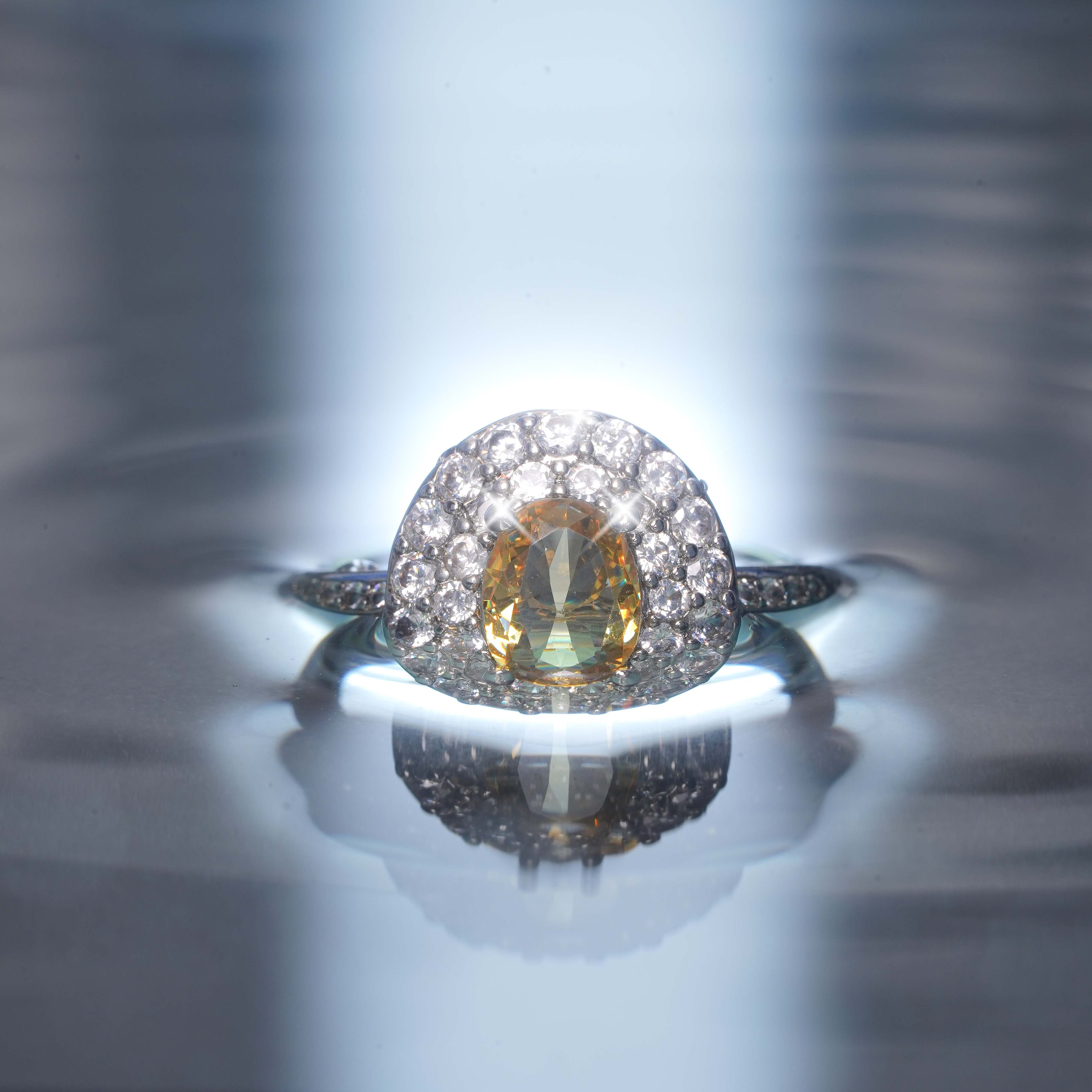 A masterpiece of timeless elegance, this ring showcases a captivating oval-cut sapphire at its center, radiating deep celestial blue hues. Encircled by a dazzling halo of brilliant-cut diamonds, the gemstone’s brilliance is magnified, creating a breathtaking display of light and fire. The diamond-studded band adds an extra layer of luxury, seamlessly blending sophistication with modern allure.