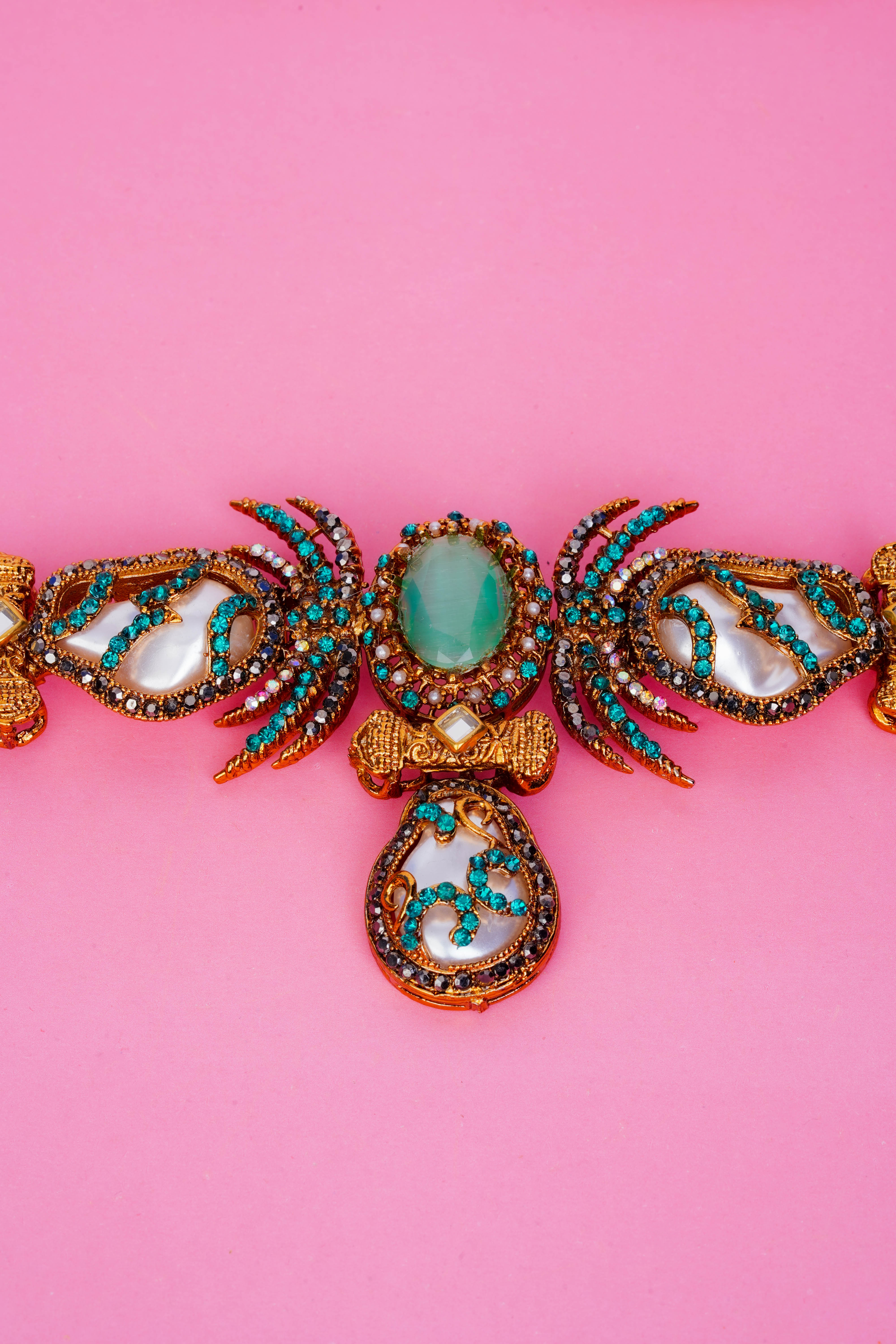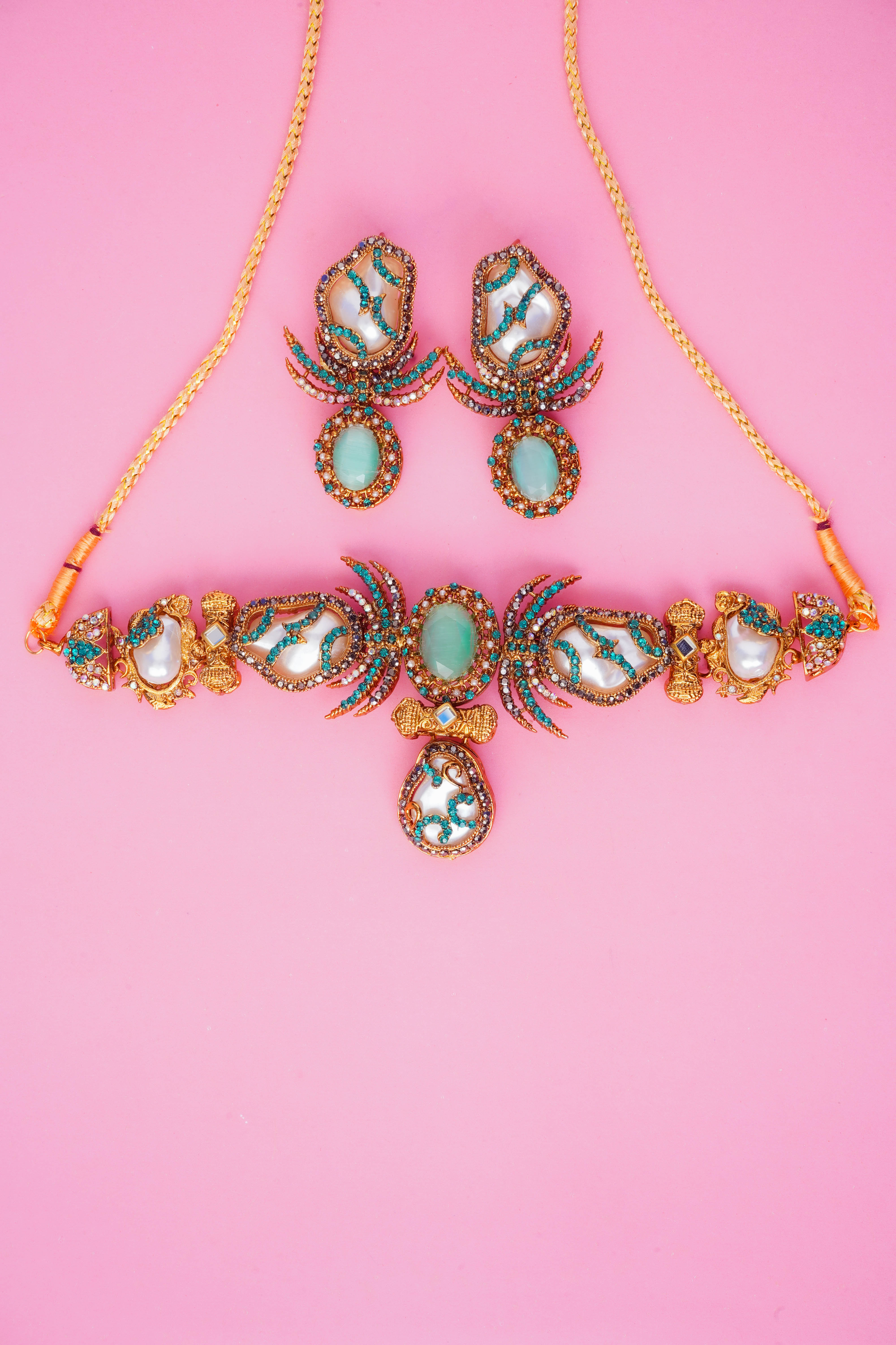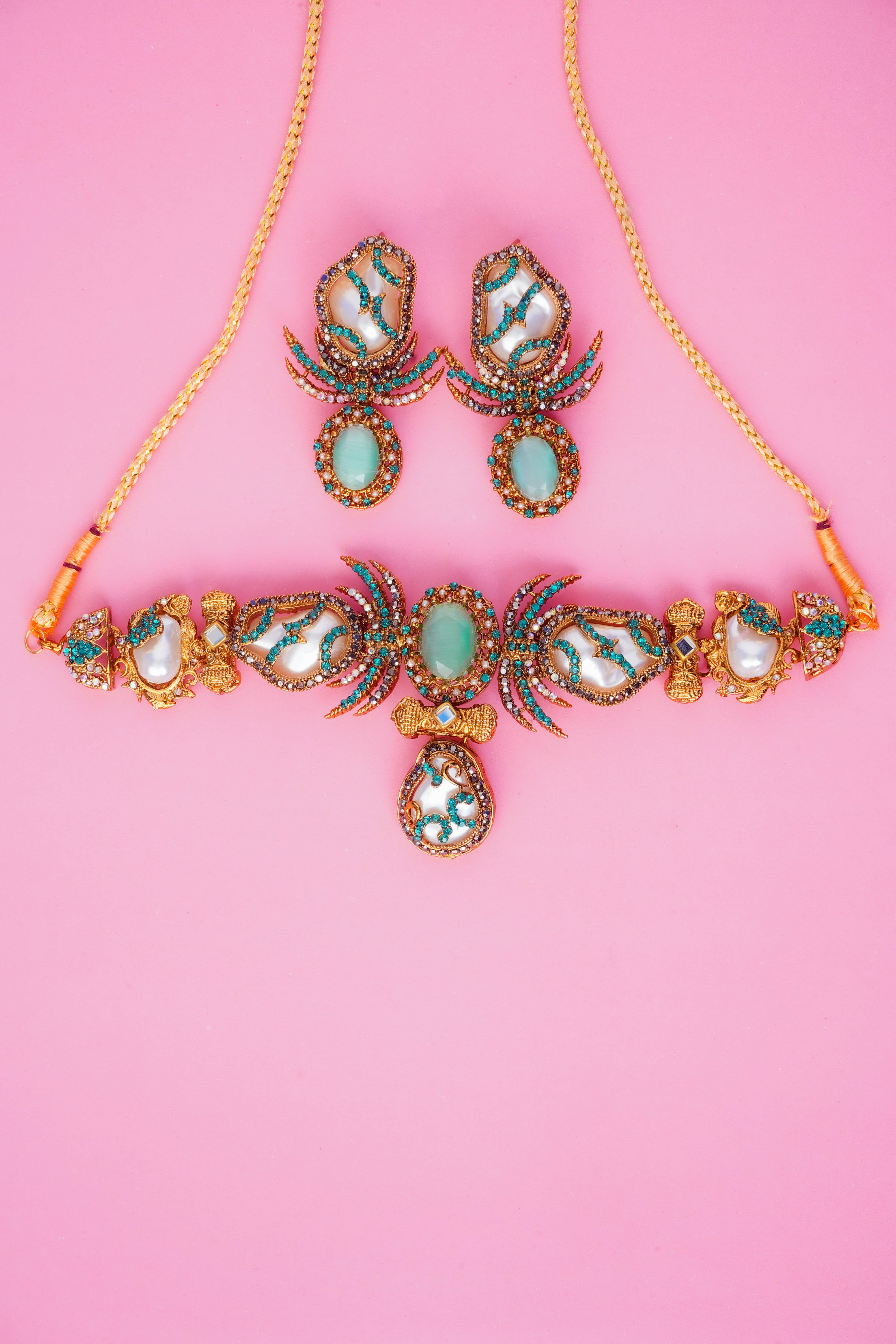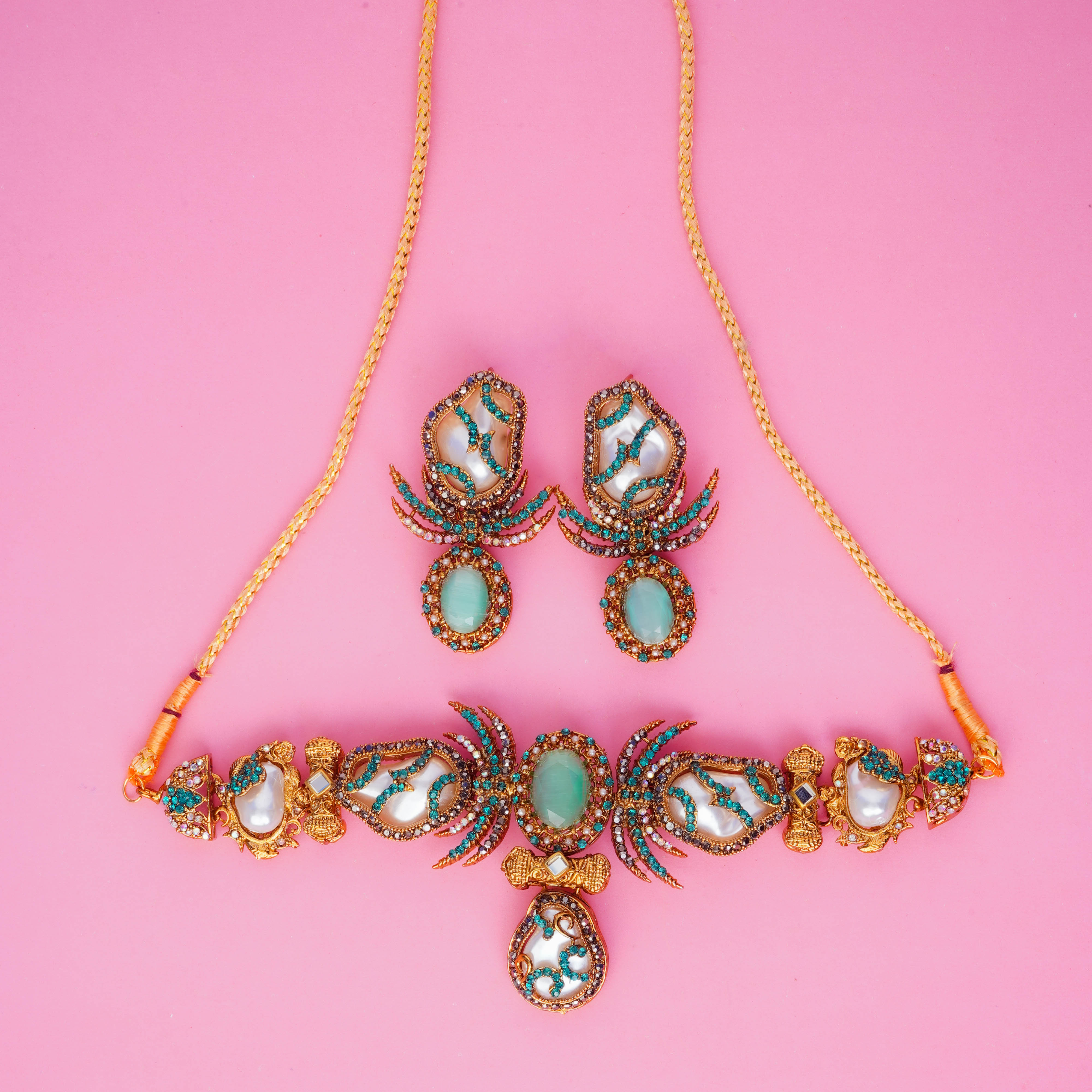 Transport yourself into a world of magical elegance with the Mystic Aqua Necklace Set, a captivating blend of aquatic charm and Mughal-inspired grandeur. Crafted with glistening sea-green crystals, rich baroque pearls, and multi-toned enamel work, this regal choker-style necklace and matching earrings bring together fantasy and tradition.