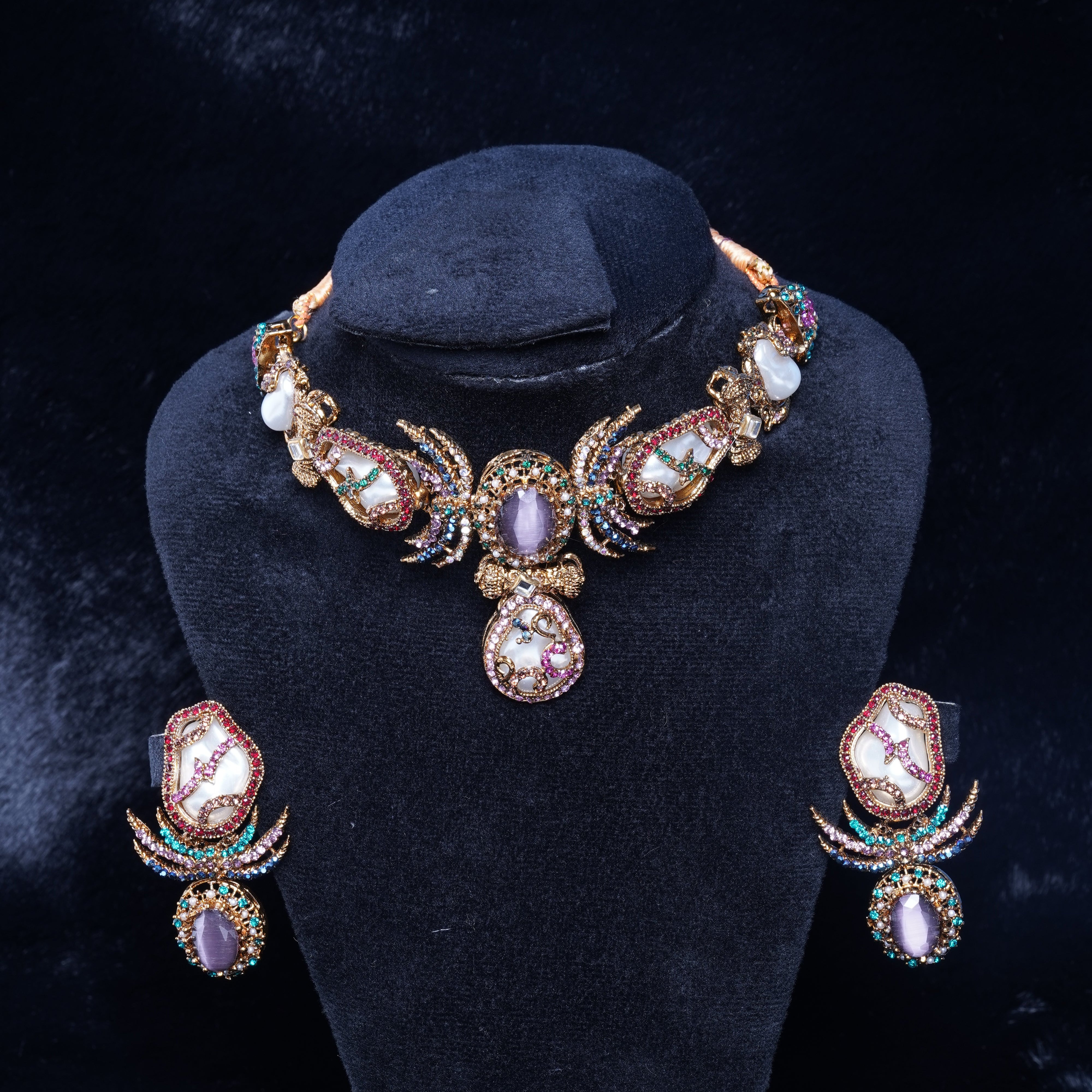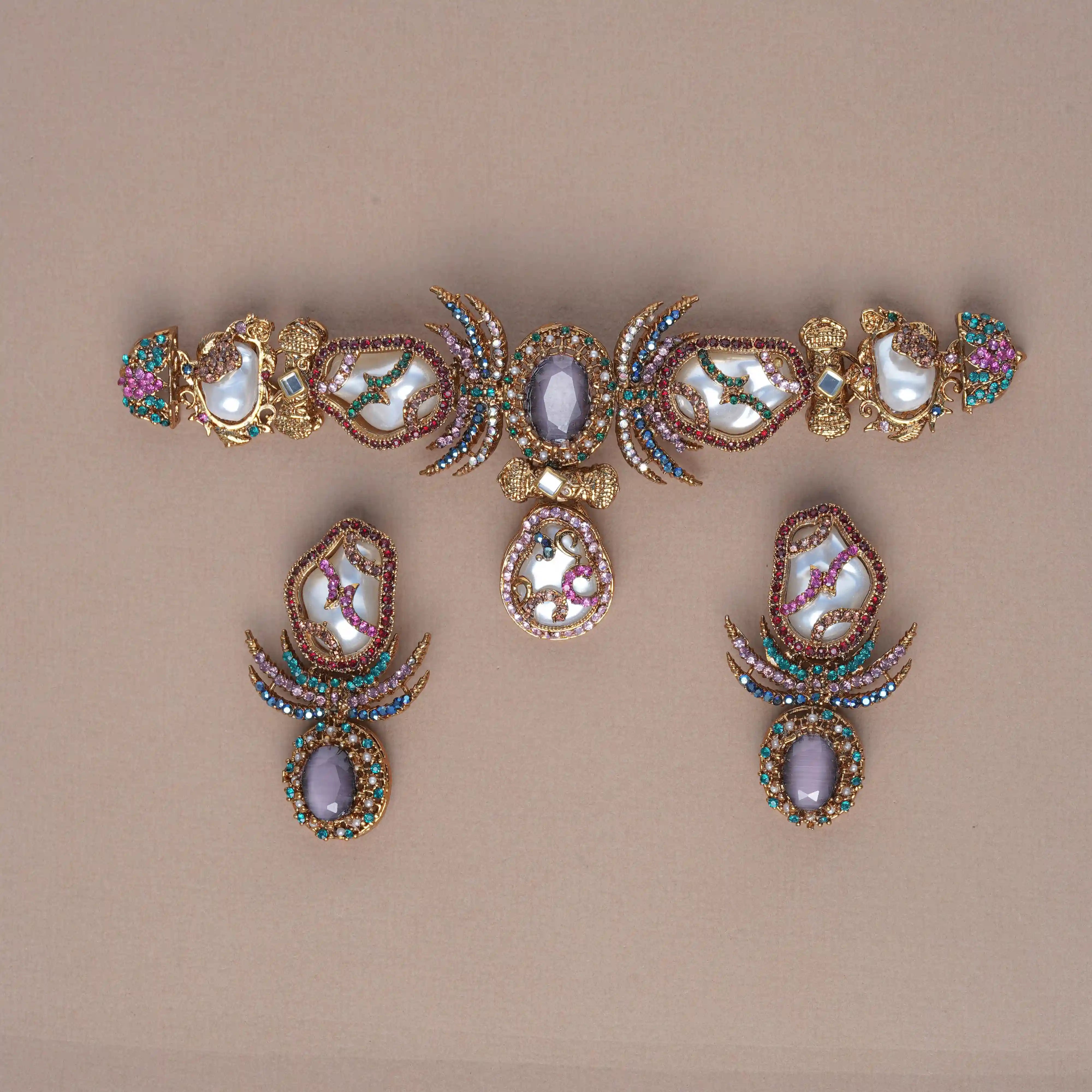 Embrace the divine allure of royal craftsmanship with the Mystic Moonlight Necklace Set , a statement choker necklace set that blends celestial symbolism, intricate detailing, and luxurious materials into a breathtaking piece of wearable art.