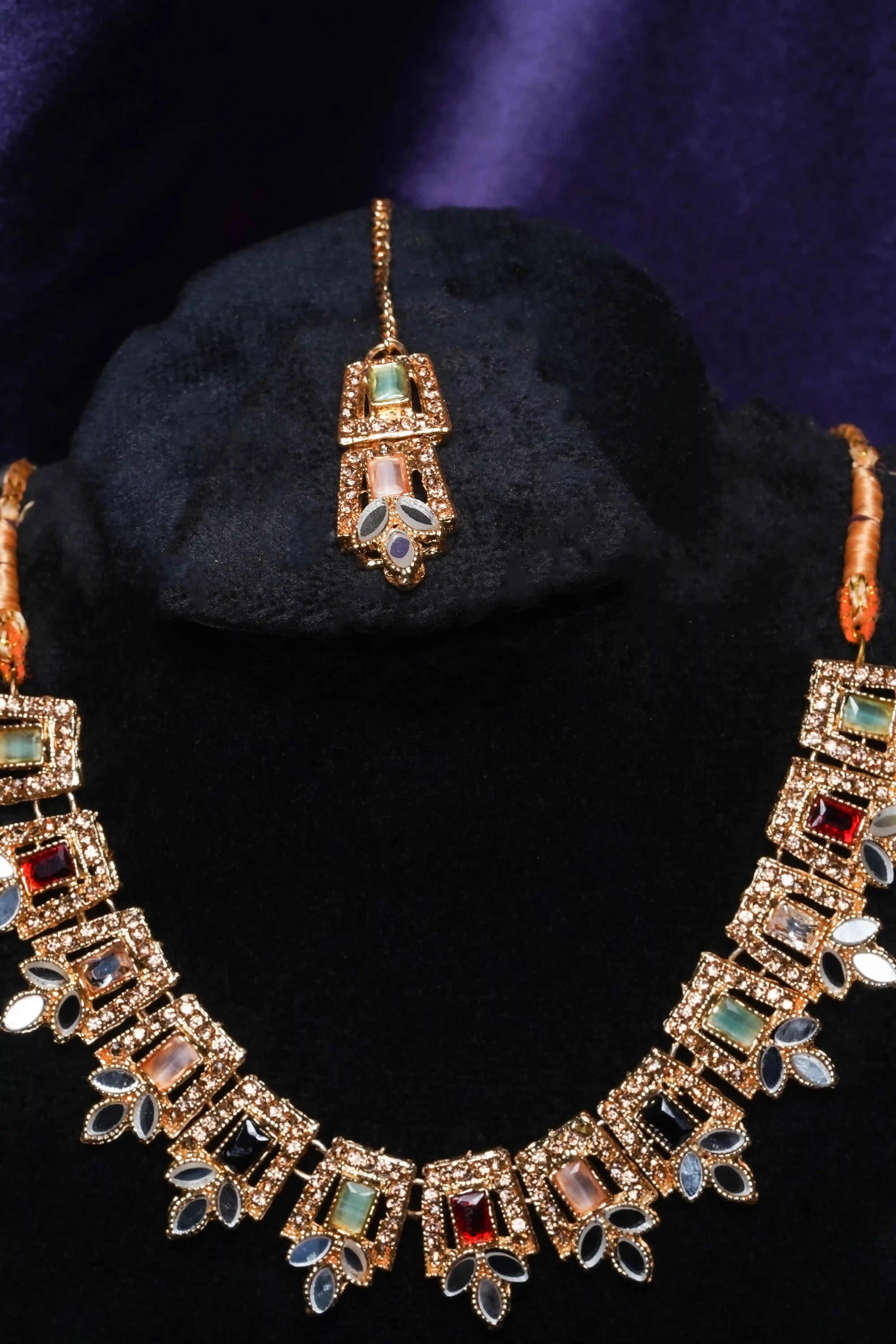 – Maang tikka matches perfectly, with identical rectangular gemstone center and leaf tips