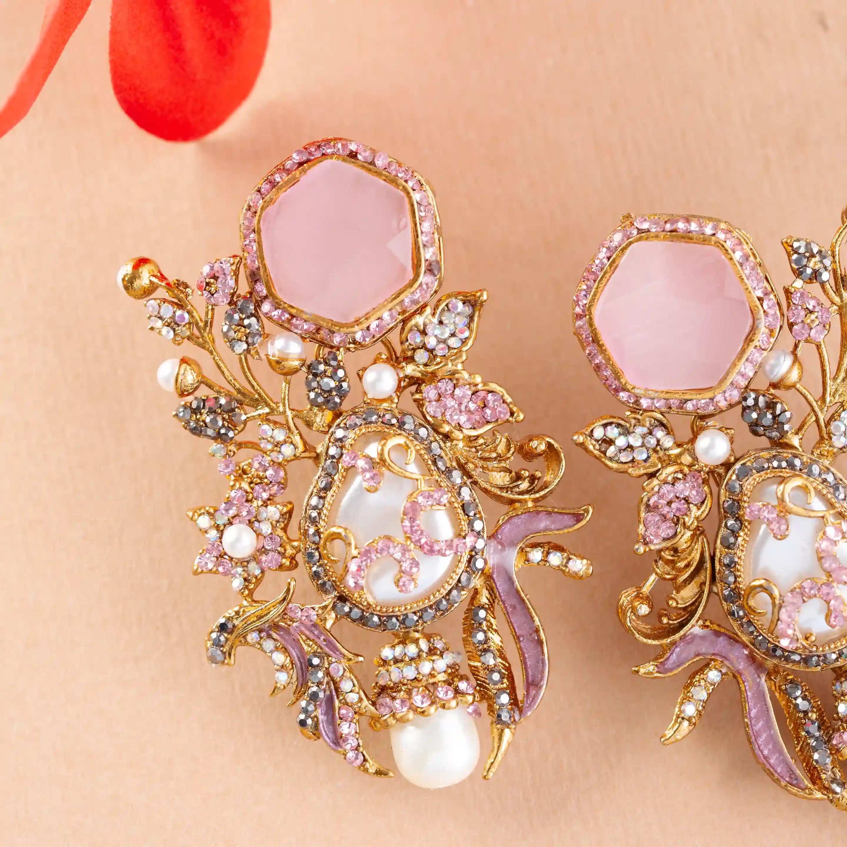 Lower Drop Detail: A pristine teardrop pearl dangles from the base, crowned with a pink stone dome that adds regal flair and elegant movement to the design.
