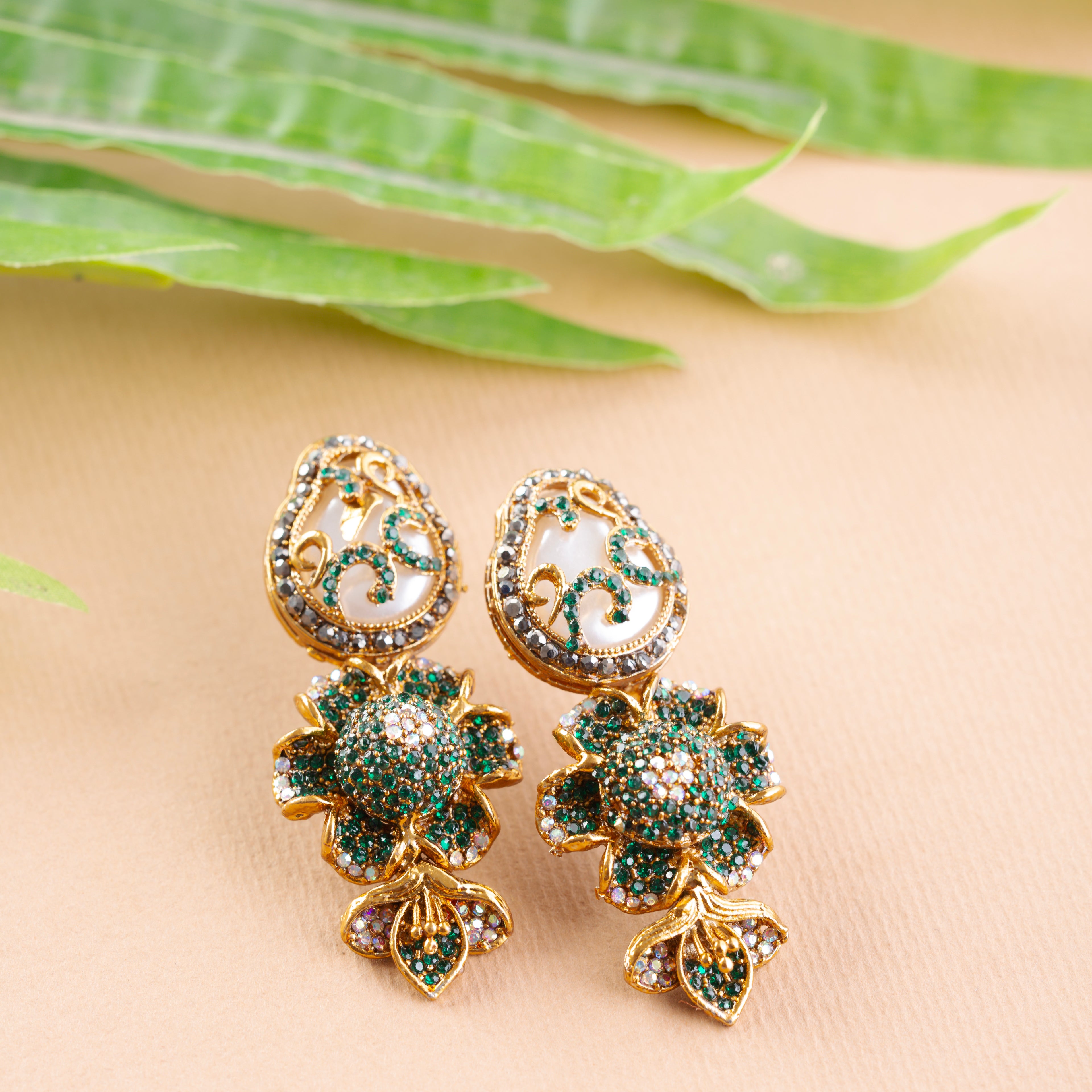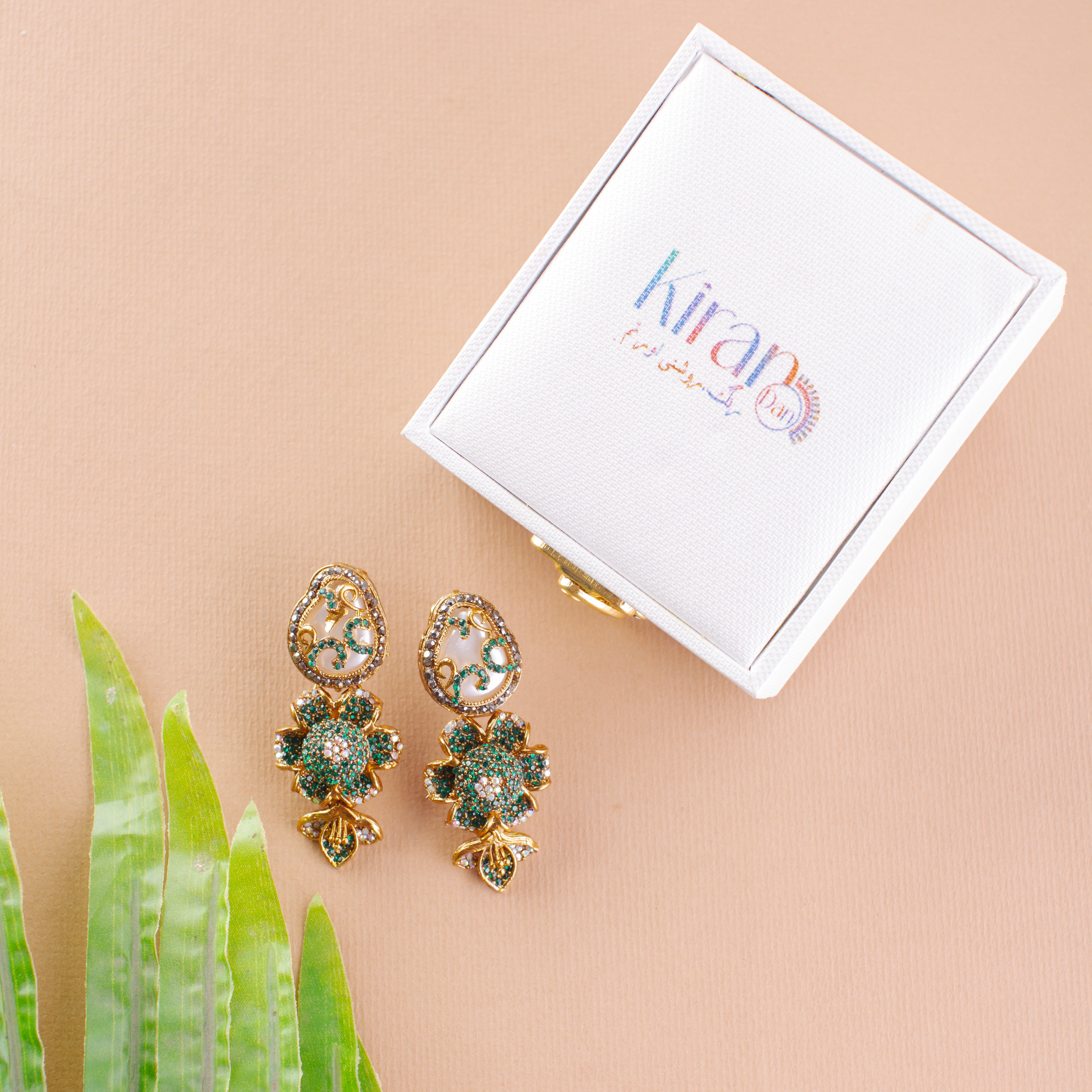 Inspired by the serenity of lush palace gardens, the Royal Garden Bloom earrings fuse traditional elegance with vibrant floral artistry. These earrings are crafted for women who appreciate vintage luxury with a fresh, nature-inspired twist. The dual-element design combines a regal pearl-top motif with a bold, blossoming flower drop, making it a perfect statement piece.