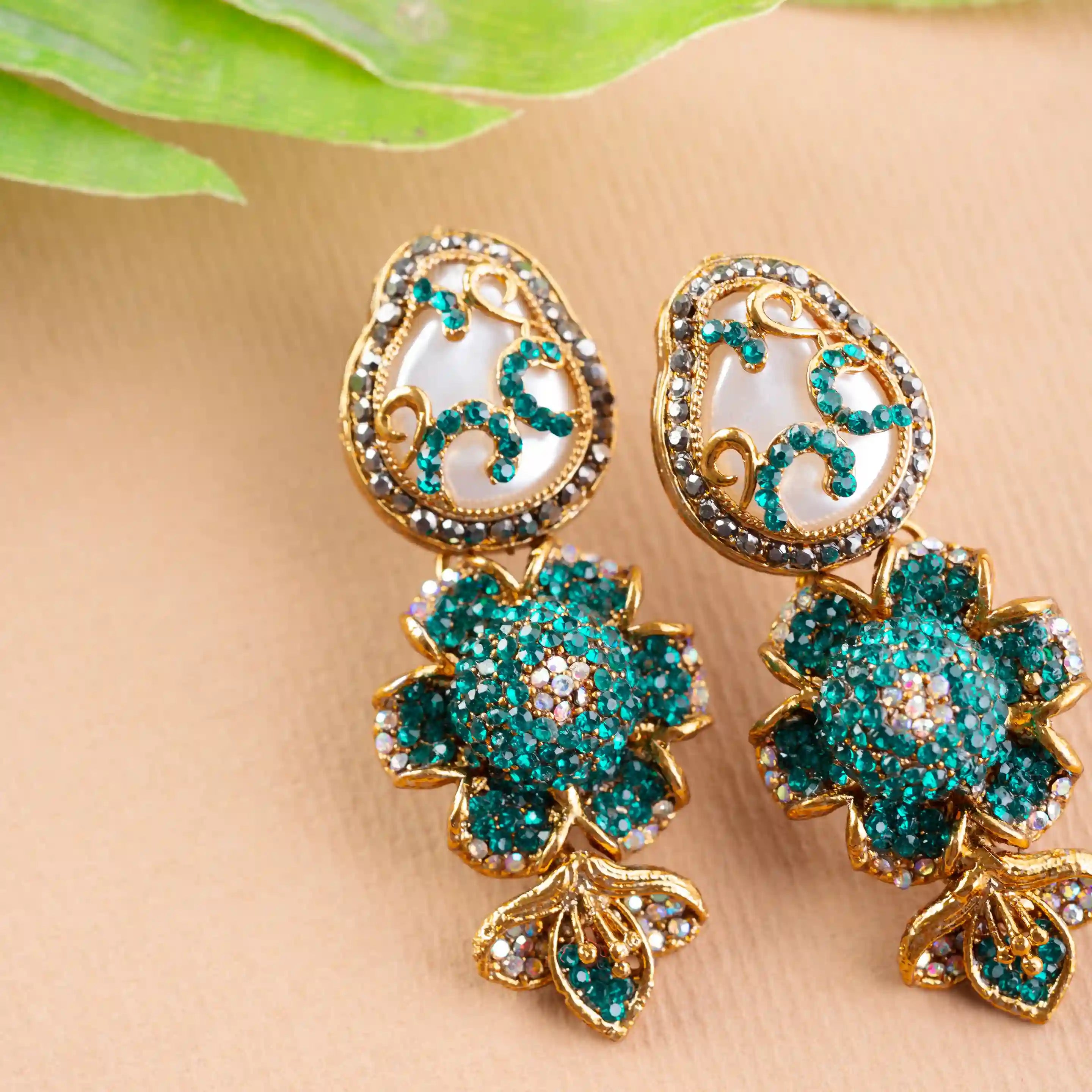Floral Drop Design: Suspended from the top is a three-dimensional floral element, meticulously encrusted with emerald green and iridescent white crystals. Each petal sparkles individually, while the center glistens with clustered brilliance, creating a lush bloom effect.