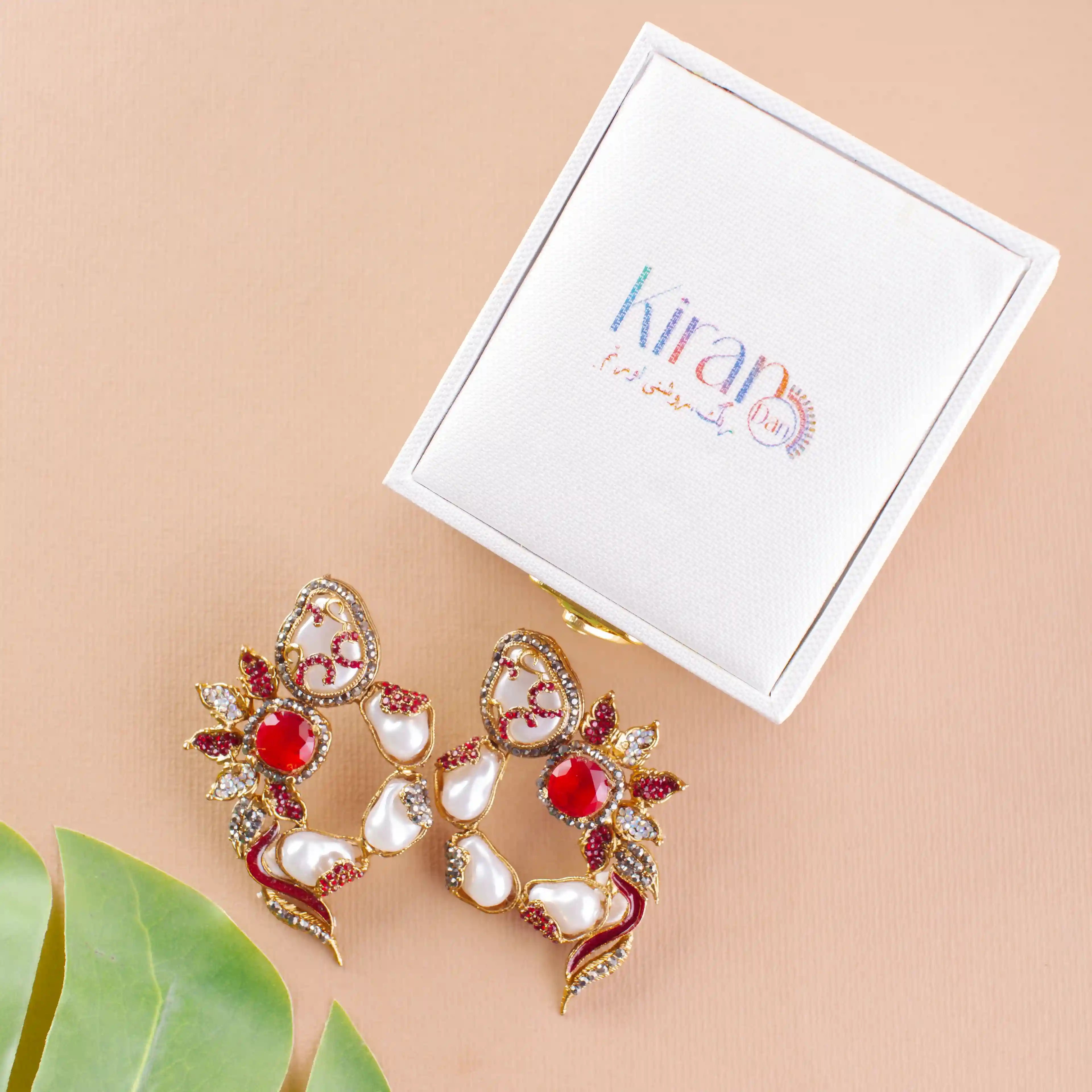 Crescent Flow: The earrings curve into a semi-hoop shape, made up of alternating lustrous pearl beads and encrusted red crystal elements. This flowing layout creates a draped illusion with elegant symmetry.