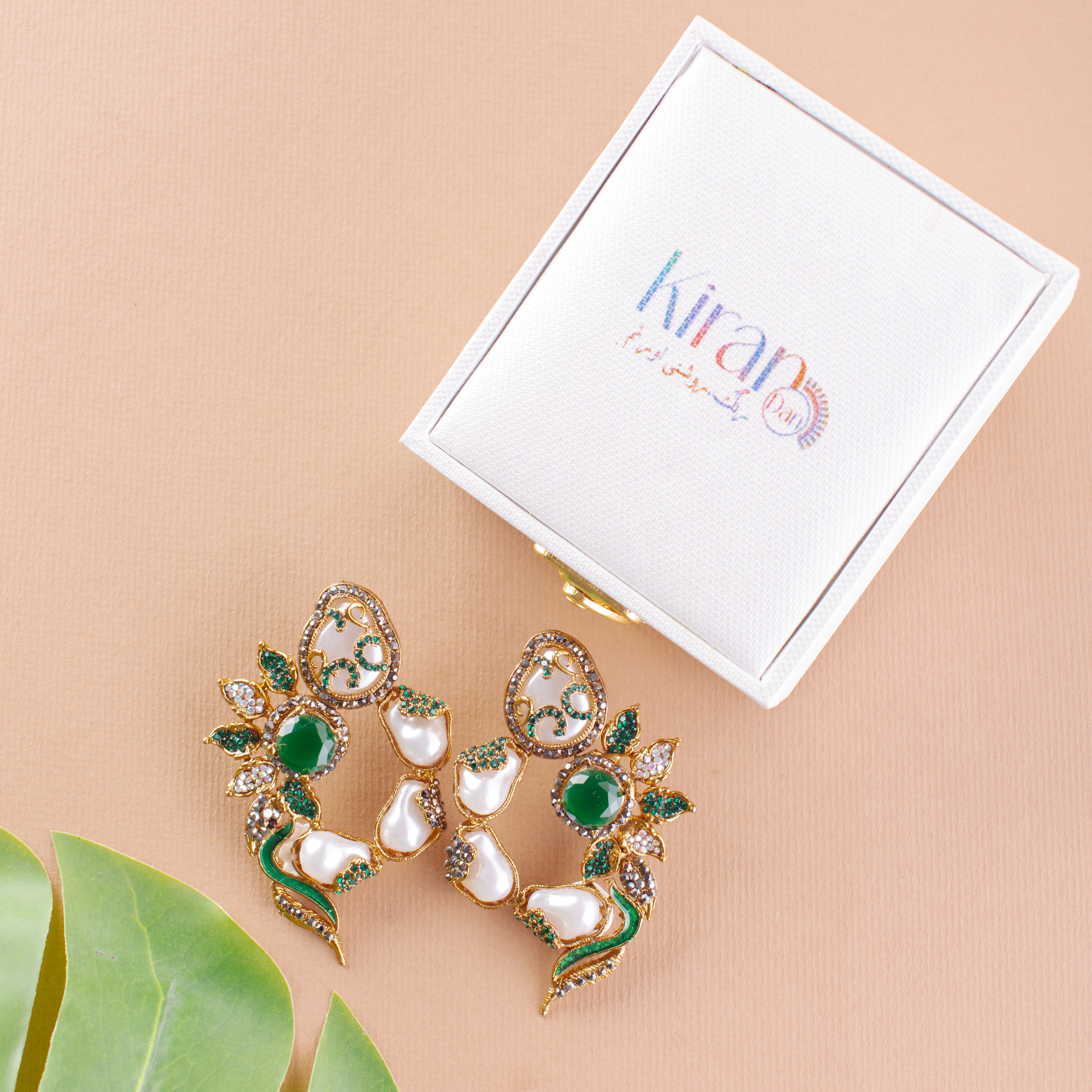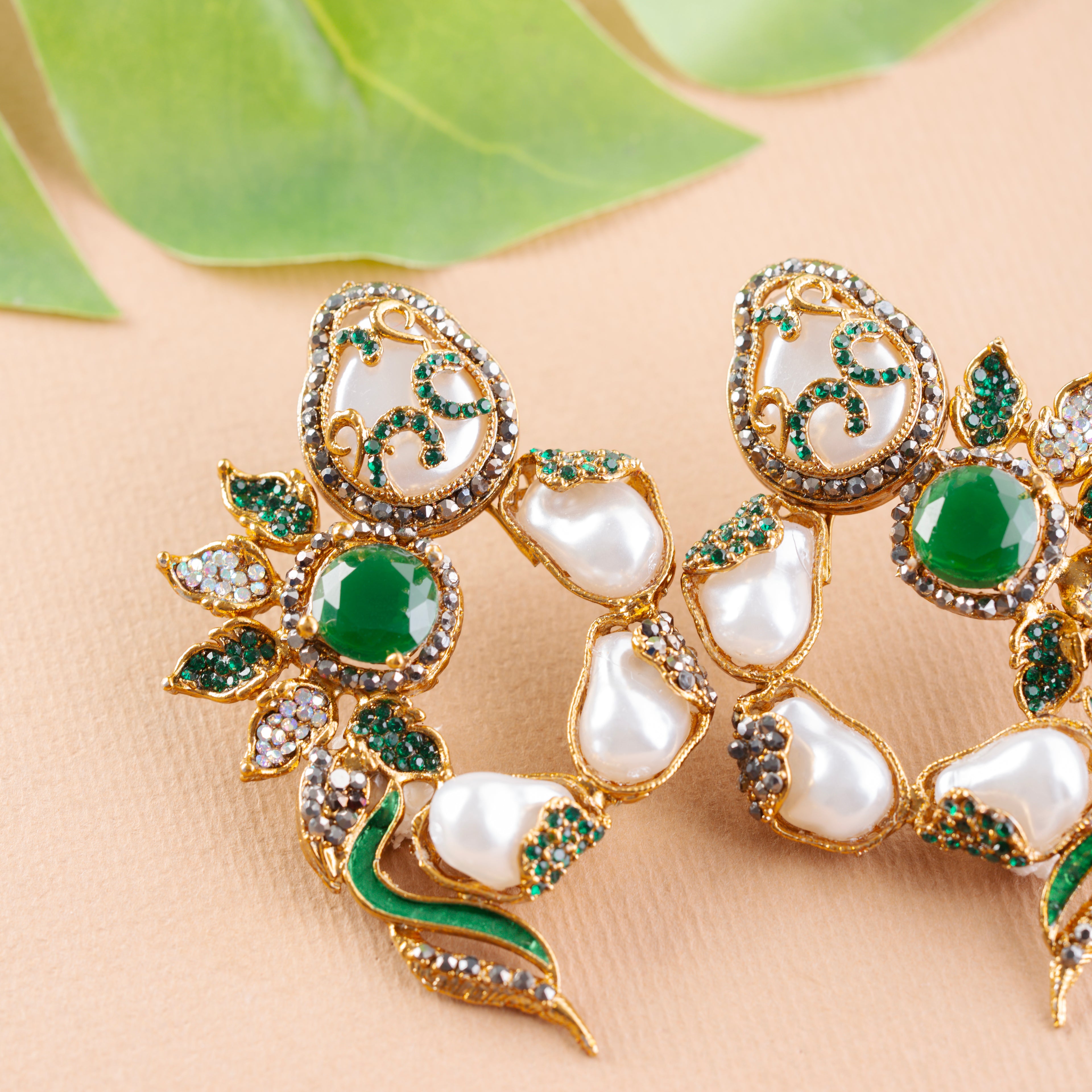 • Pearl Teardrop Tops: At the top sits a faux pearl cabochon in a teardrop shape, delicately bordered with micro silver-grey crystals and overlaid with emerald green swirl motifs in intricate gold filigree.