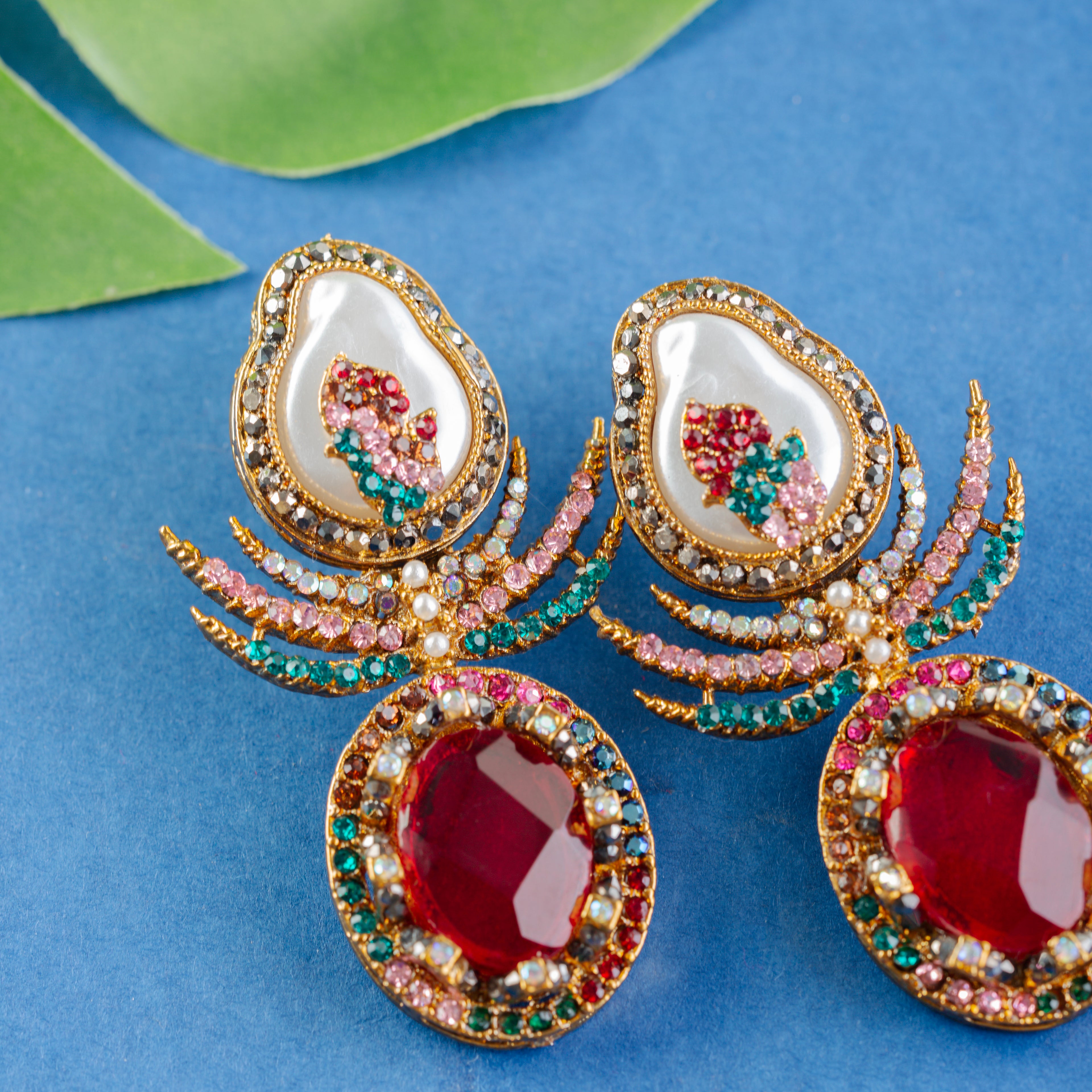 • Pearl Embellished Top: The upper part of each earring features a pear-shaped faux pearl cabochon, bordered with tiny champagne crystals and adorned with a miniature floral motif crafted in emerald green, ruby red, and pink stones. This intricate detailing brings elegance and softness to the bold base.