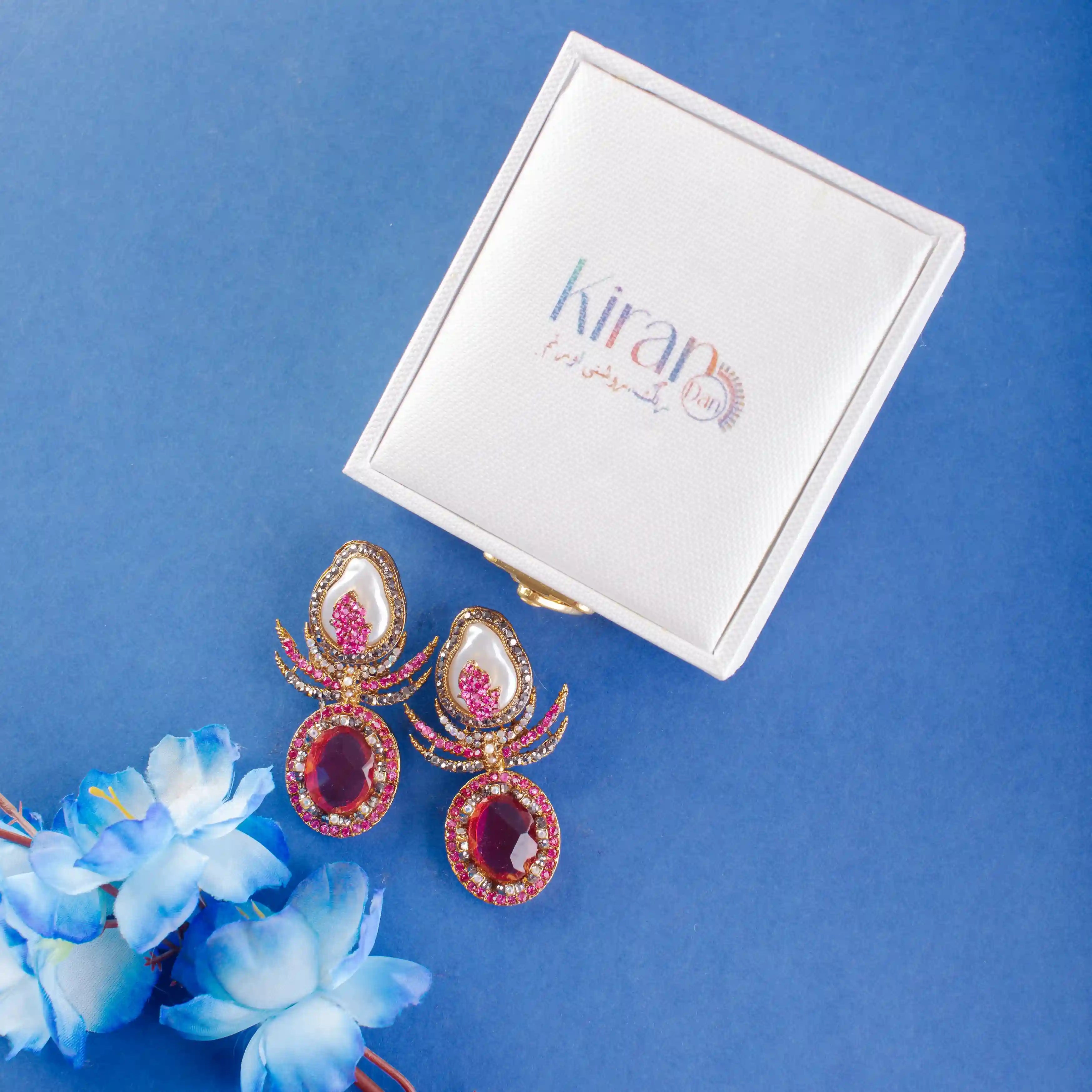 The Crimson Crown earrings are a stunning homage to royal opulence and intricate craftsmanship. Featuring bold ruby stones, radiant pearl accents, and multicolor crystal flourishes, these earrings are designed to make a powerful statement at weddings, receptions, and high-glamour occasions.