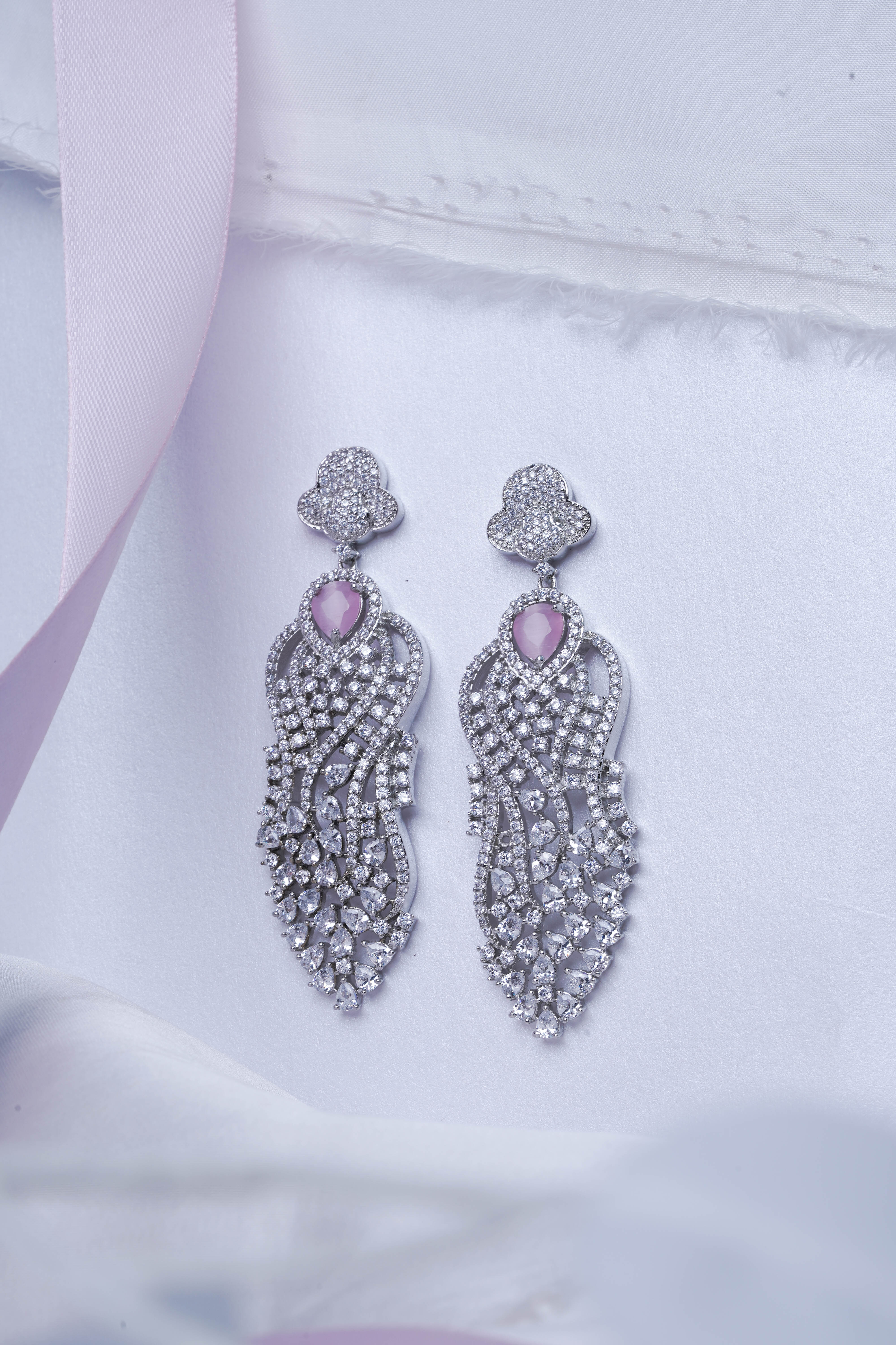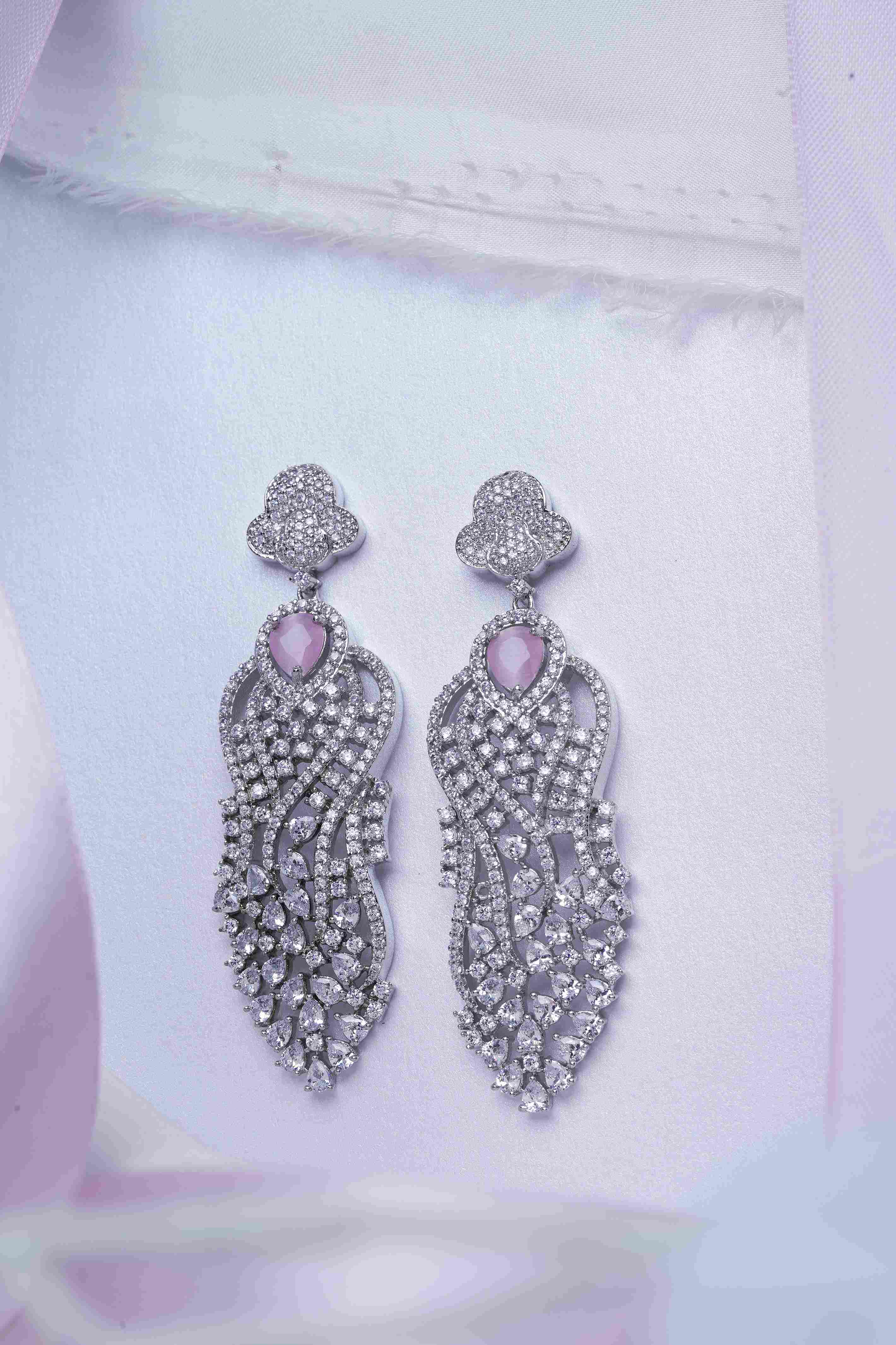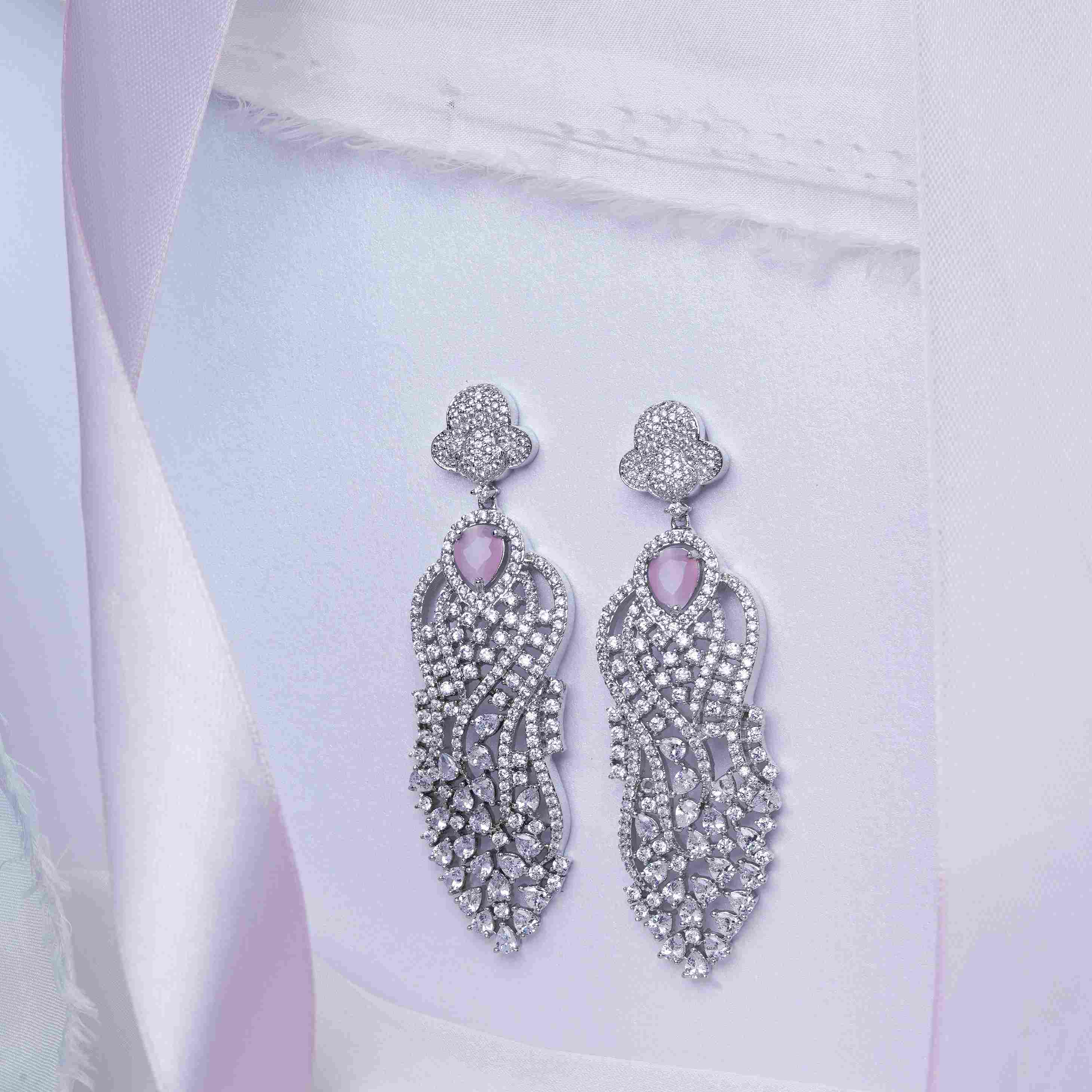 Crafted in luminous Silver White plating, the earrings feature a flowing, feather-like silhouette adorned with hundreds of micro-set, dazzling white cubic zirconia stones that shimmer with every movement. At the heart of the design lies a captivating pear-cut Pink gem, intricately carved with a crisscross pattern, adding a royal touch of depth and mystique.