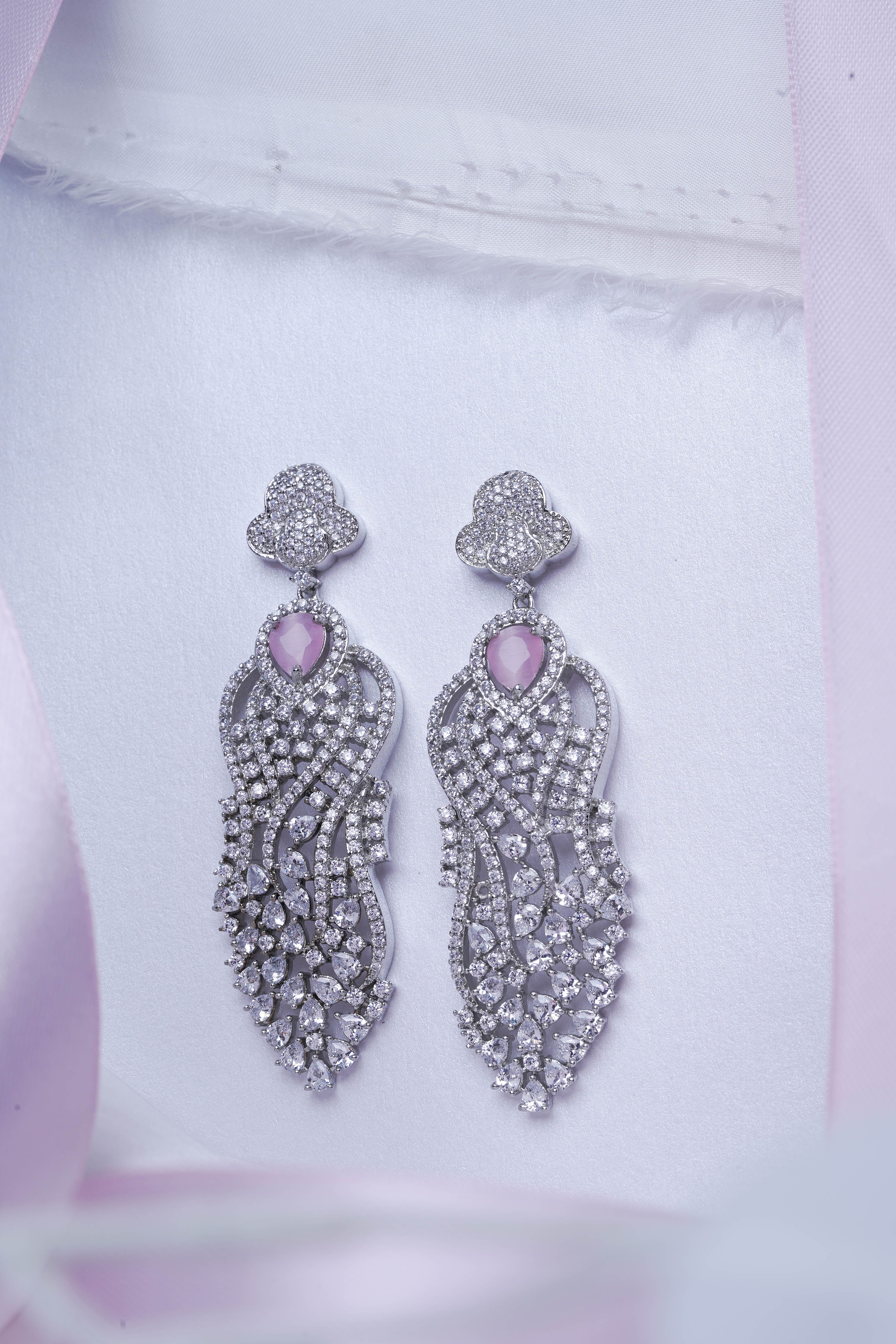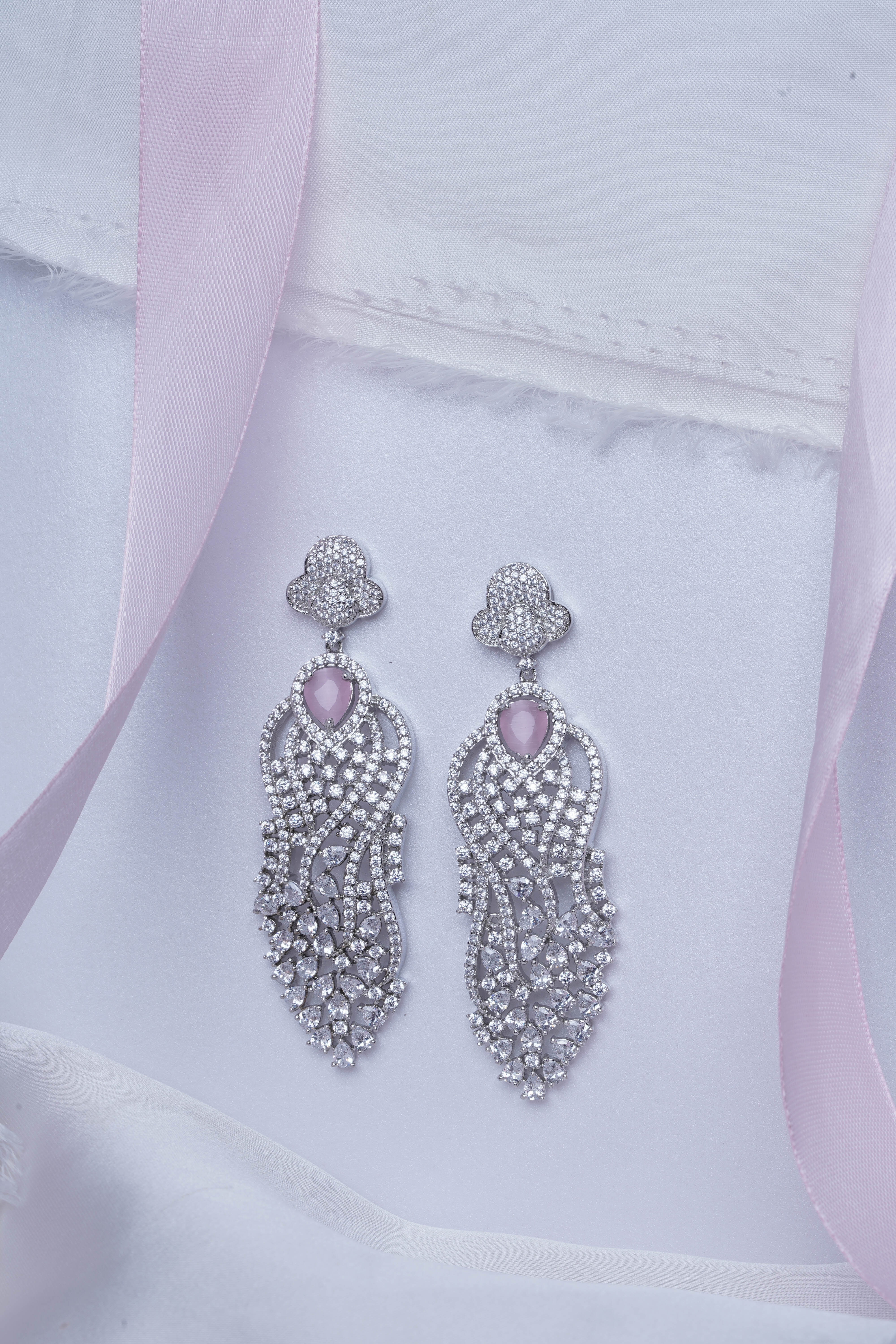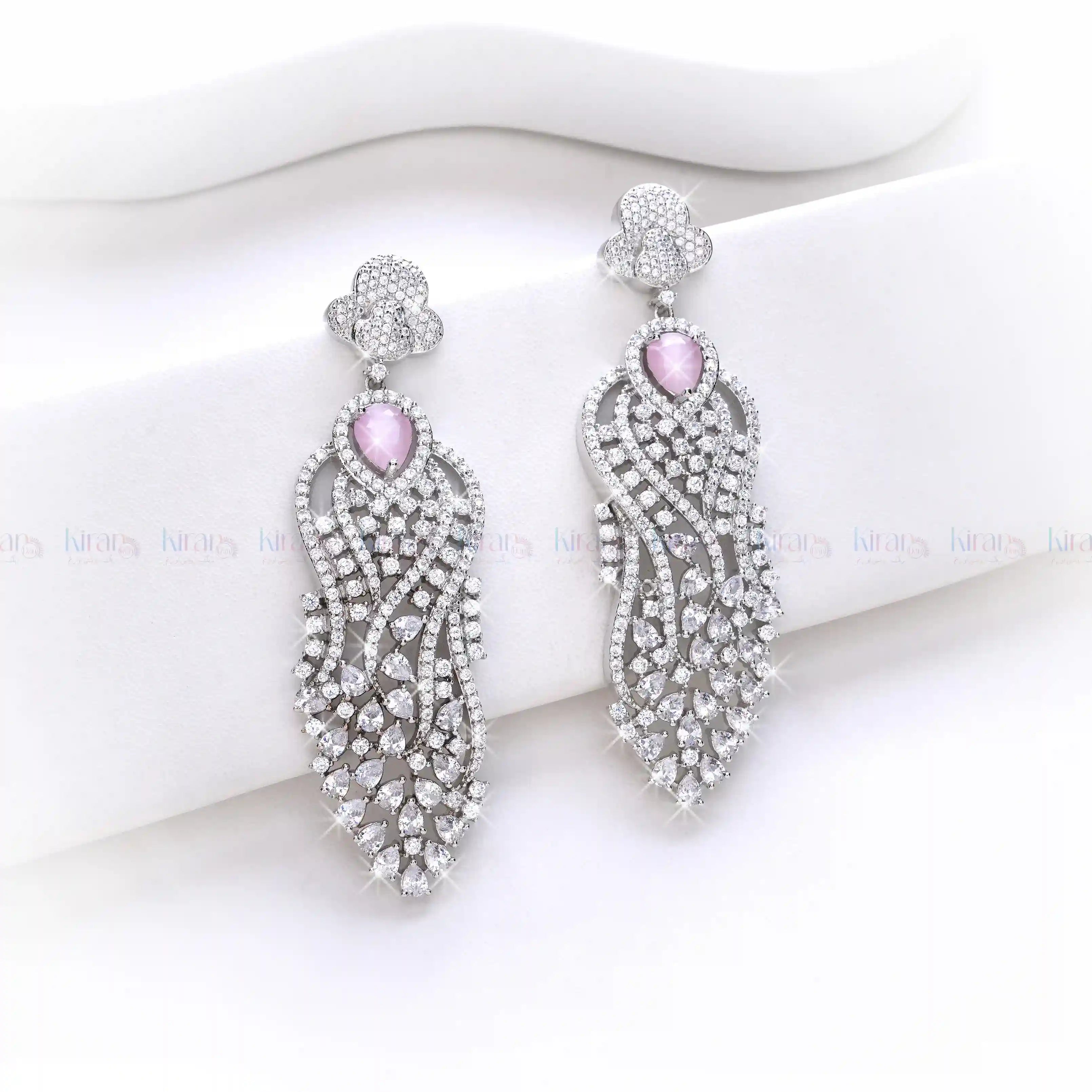 Crafted in luminous Silver White plating, the earrings feature a flowing, feather-like silhouette adorned with hundreds of micro-set, dazzling white cubic zirconia stones that shimmer with every movement. At the heart of the design lies a captivating pear-cut Pink gem, intricately carved with a crisscross pattern, adding a royal touch of depth and mystique.