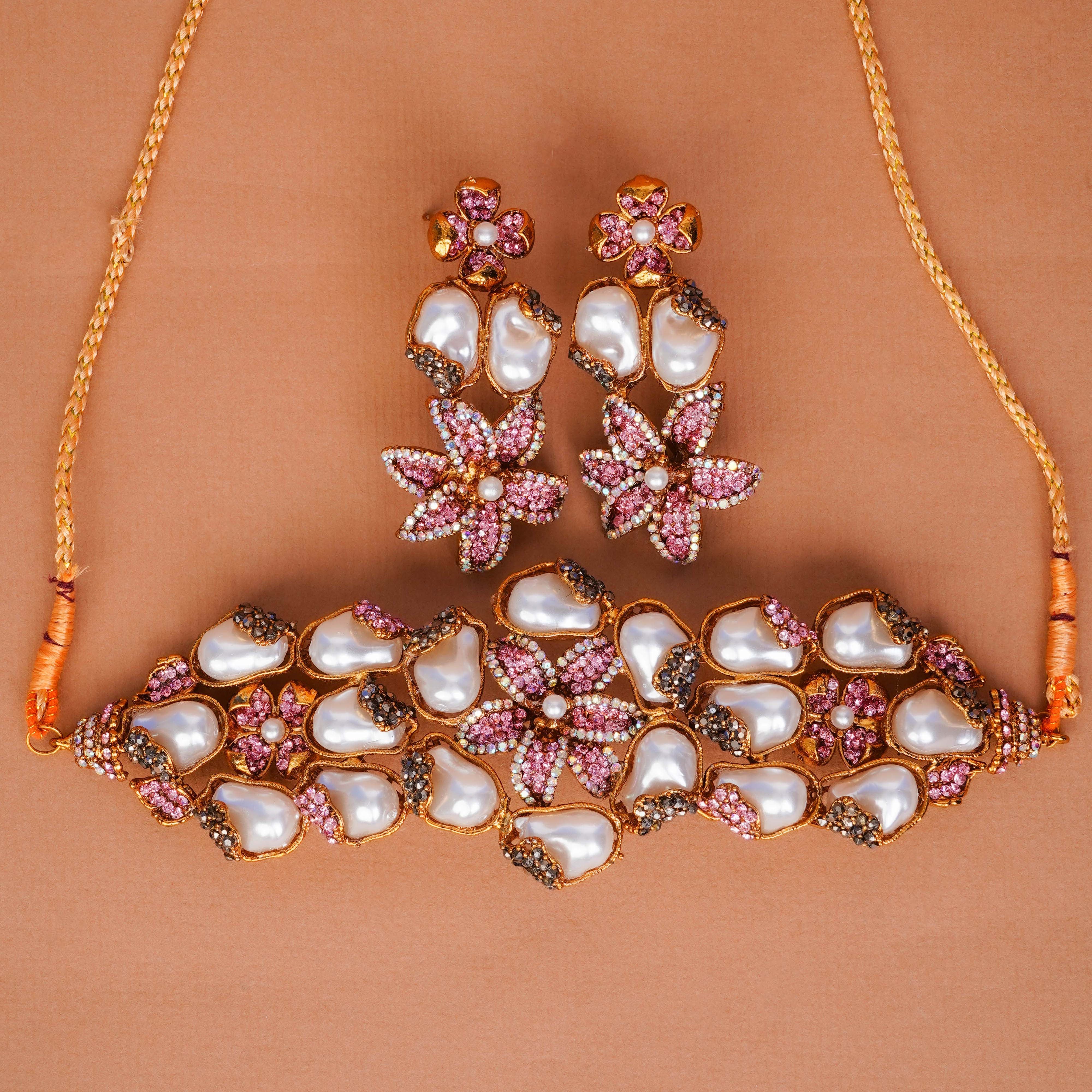 Floral Motifs: Dazzling pink crystal-studded flower designs form the heart of this statement set, symbolizing beauty and renewal.
