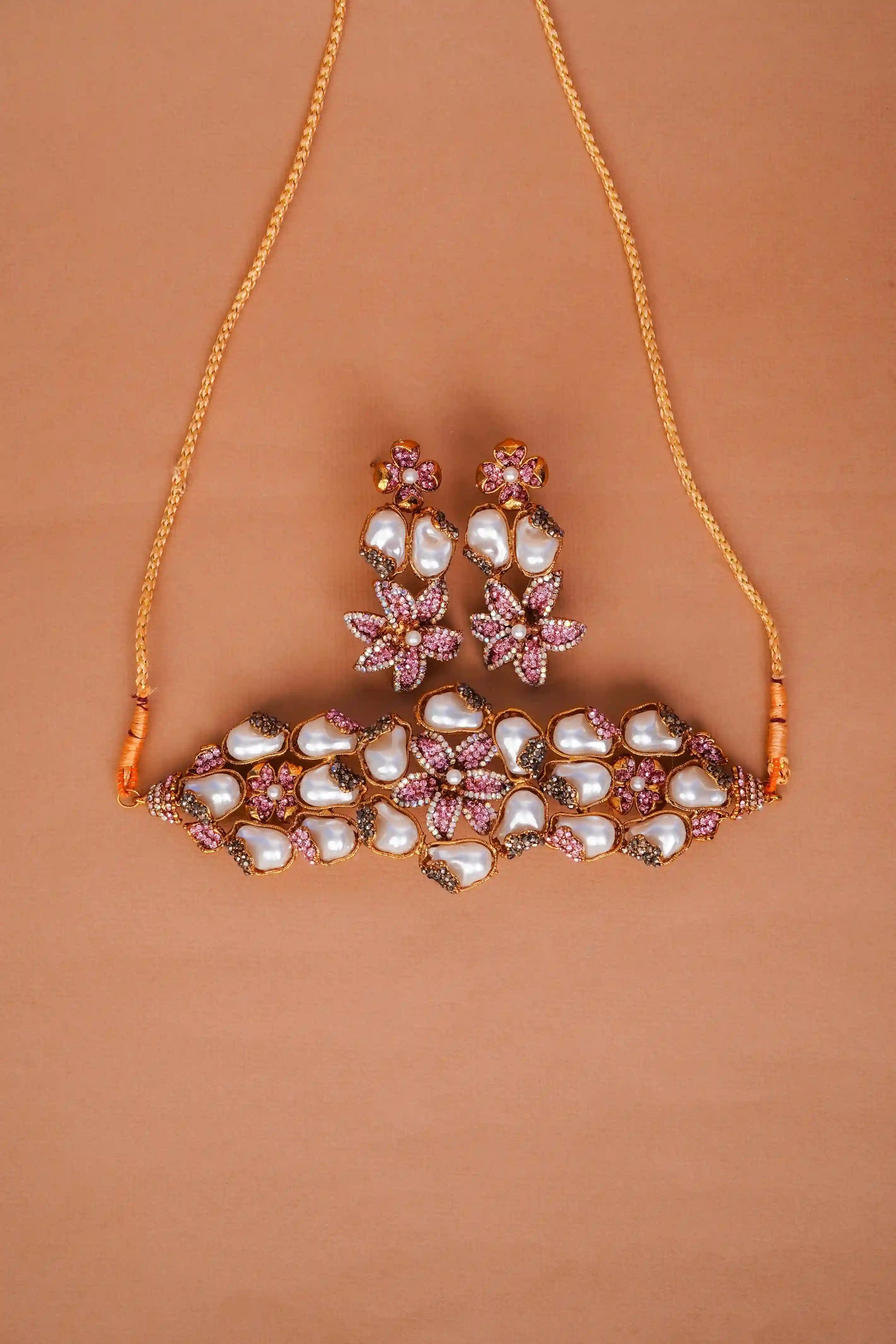 Turn heads with the ethereal charm of our Blossom Grace Pearl Necklace Set. Designed to enchant, this floral-themed set is a celebration of elegance, featuring delicately encrusted flower motifs, lustrous pearls, and intricate crystal accents. A perfect blend of feminine beauty and timeless craftsmanship, ideal for weddings, festive events, and cultural gatherings.