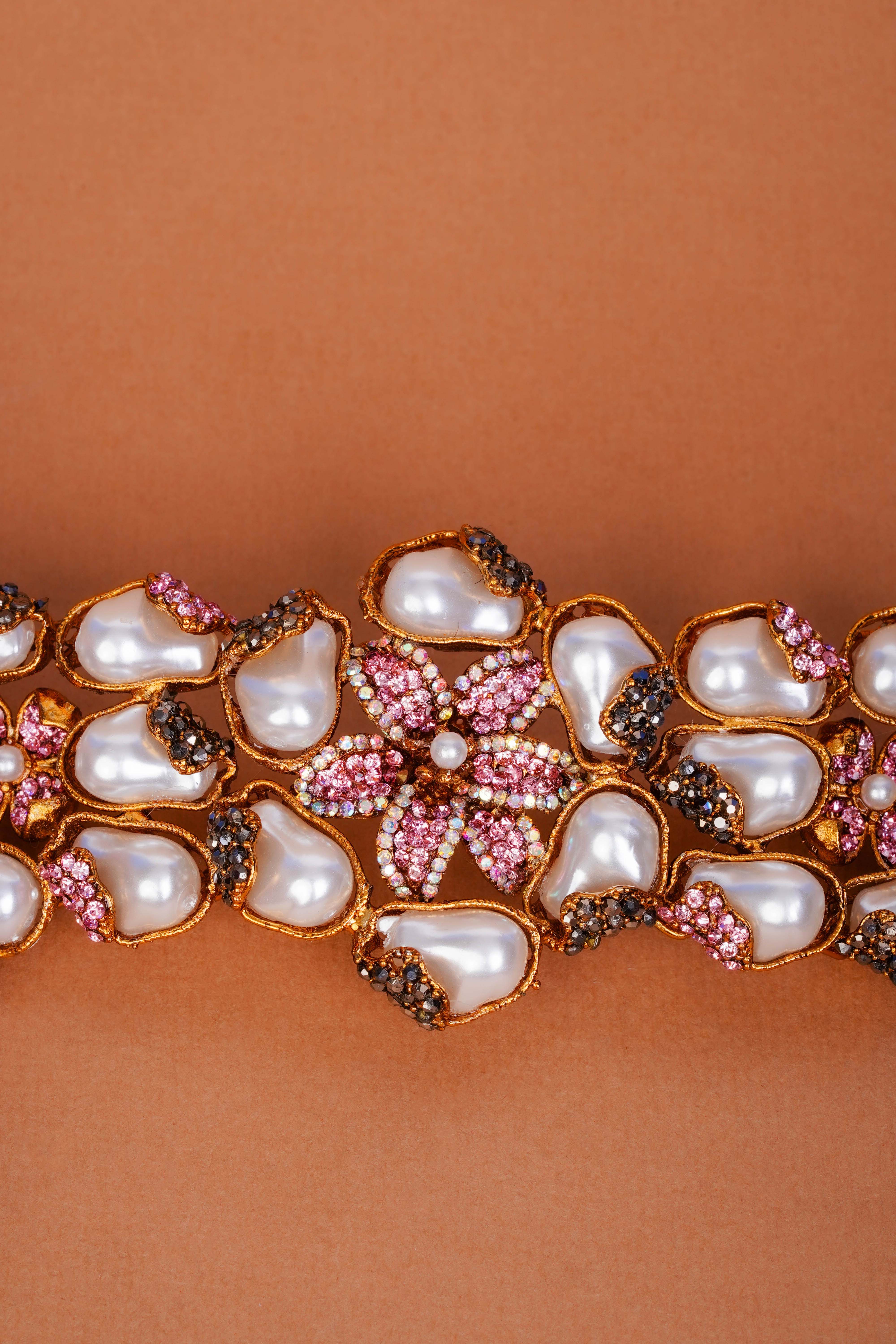 Pearl Accents: Hand-set white synthetic teardrop pearls add grace and classic sophistication to the bold floral look.