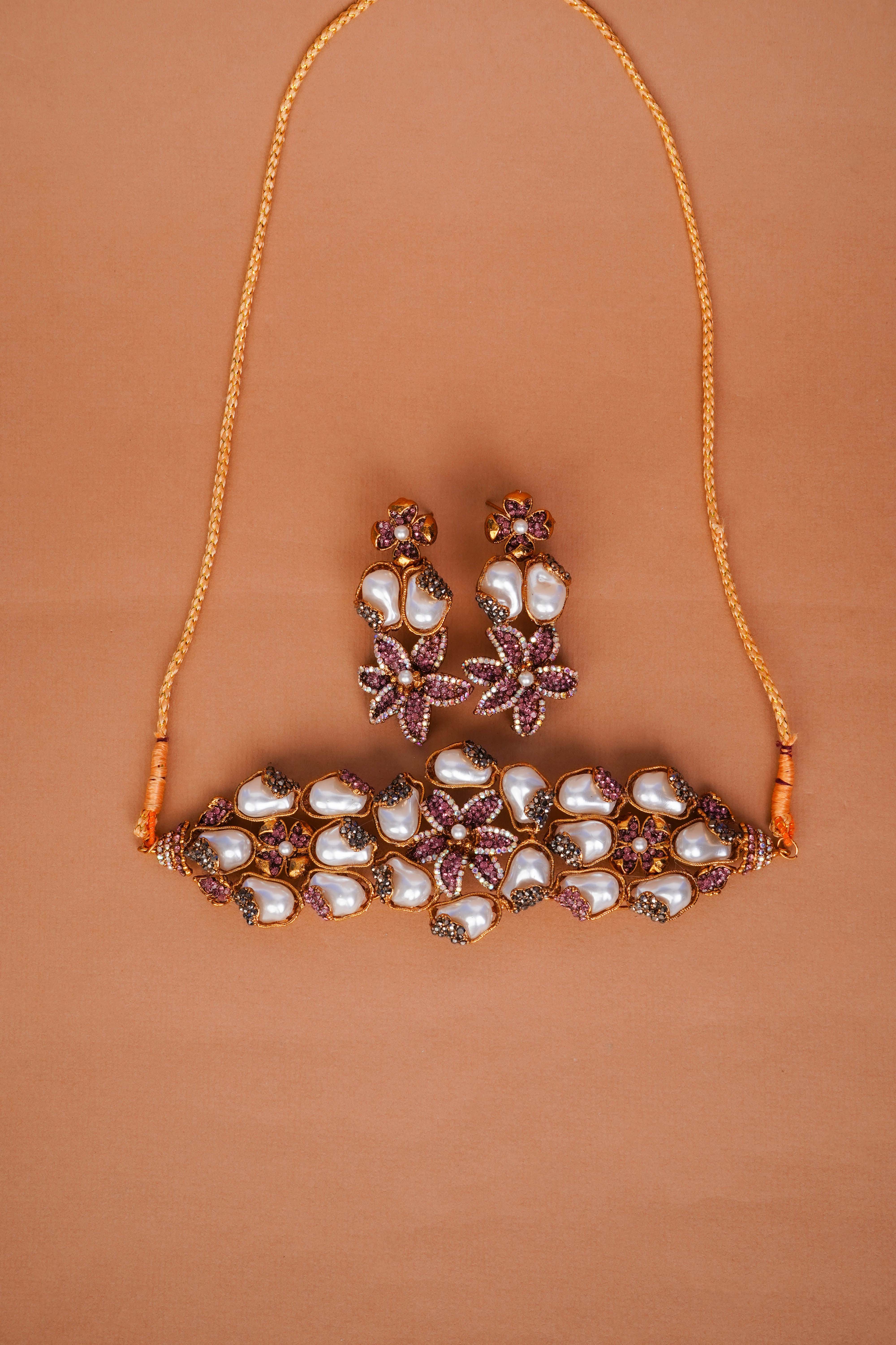 Gracefully crafted with a blend of floral charm and pearl opulence, the Radiant Pink Petal Pearl Necklace is an enchanting expression of elegance and sophistication. Featuring hand-set teardrop pearls and a dazzling flower motif at its heart, this piece is designed to be the highlight of your festive and bridal look.