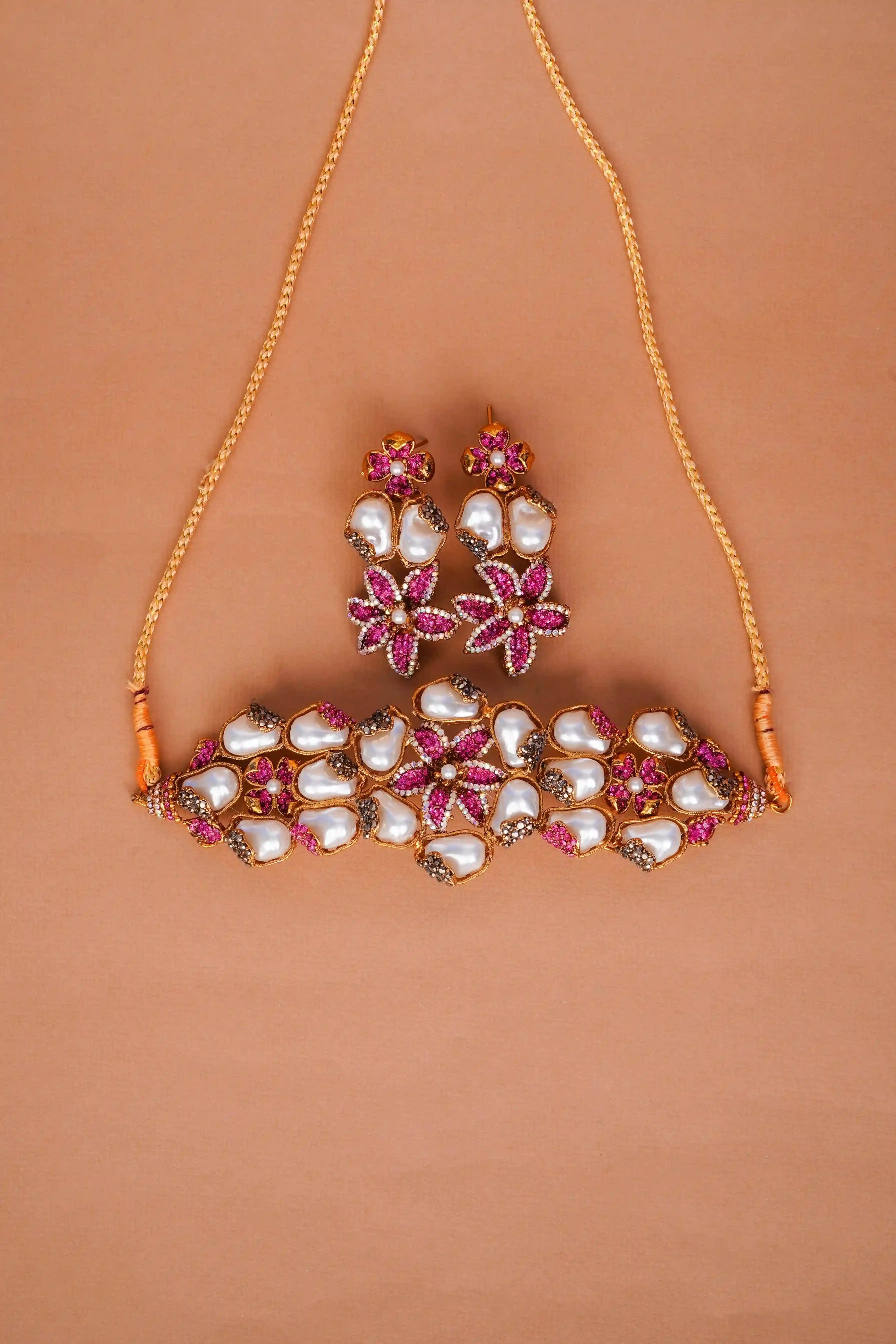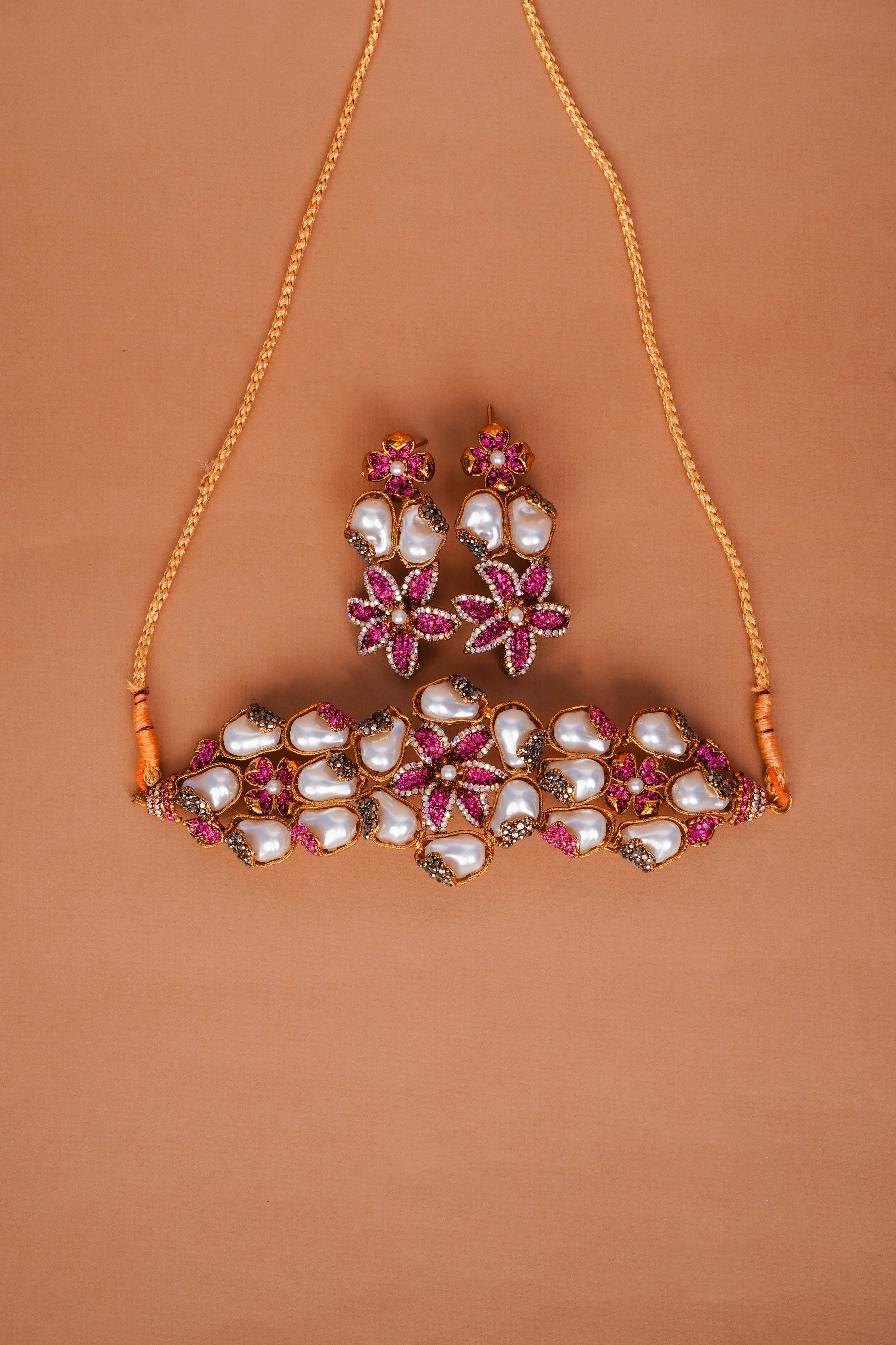 Delicate, dazzling, and utterly divine — the Rosy Bloom Pearl Necklace Set brings an air of refined floral charm to your festive wardrobe. Crafted with shimmering pink stone flowers, radiant pearls, and sparkling embellishments, this handcrafted set is perfect for weddings, mehendi functions, and cultural celebrations.