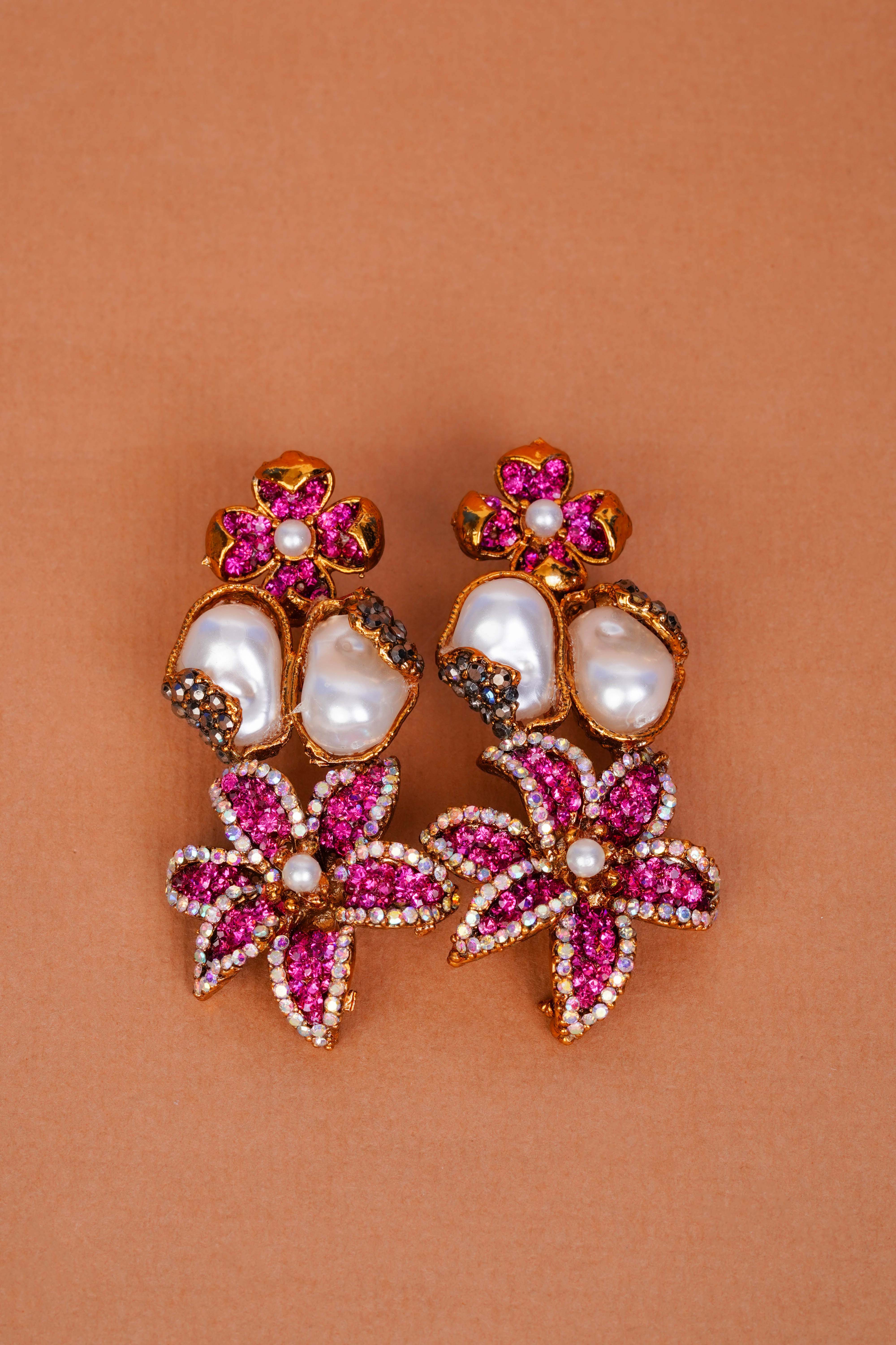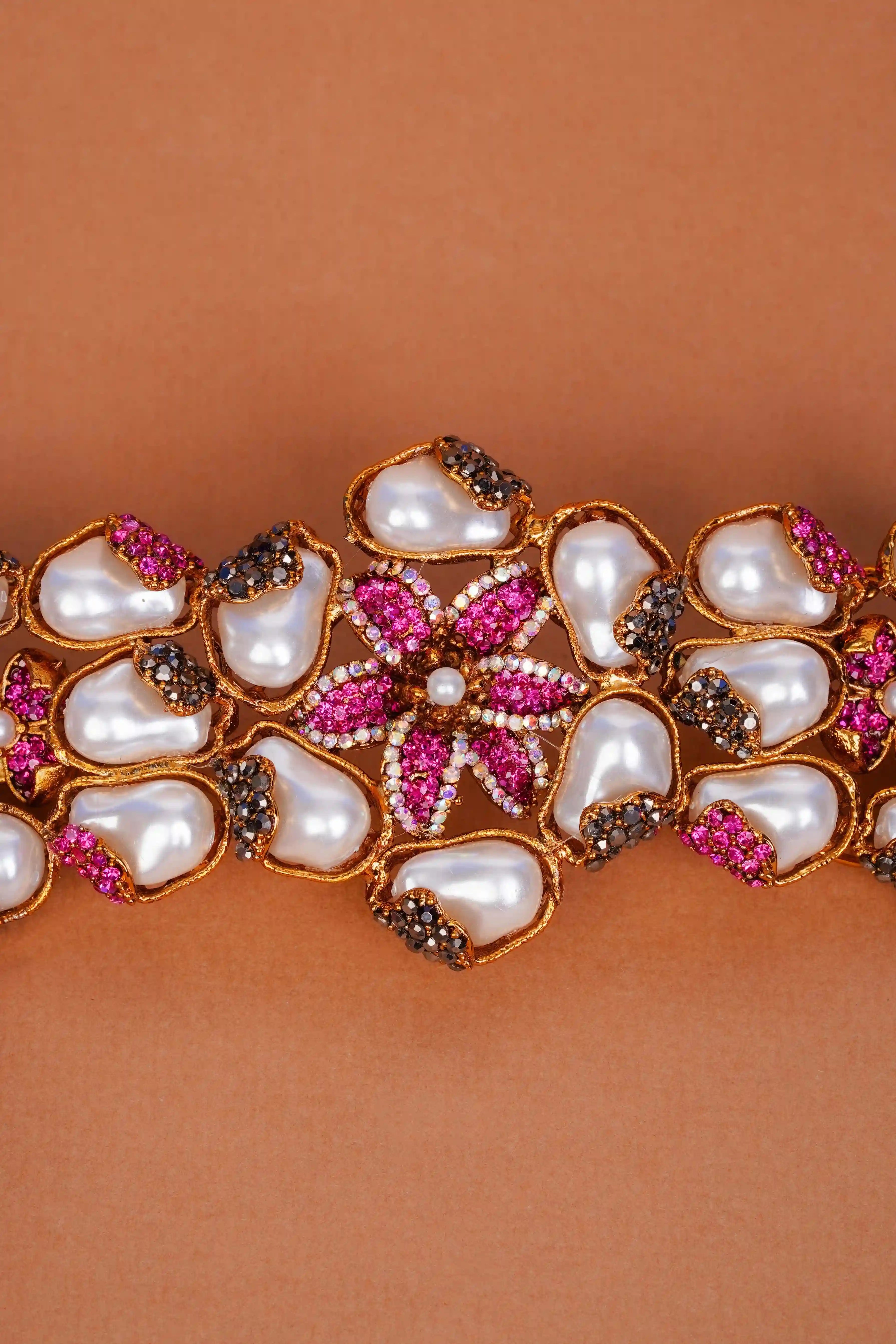Floral Motifs: Eye-catching six-petal flower clusters in bright pink stones serve as the centerpiece of this design, symbolizing grace and celebration.