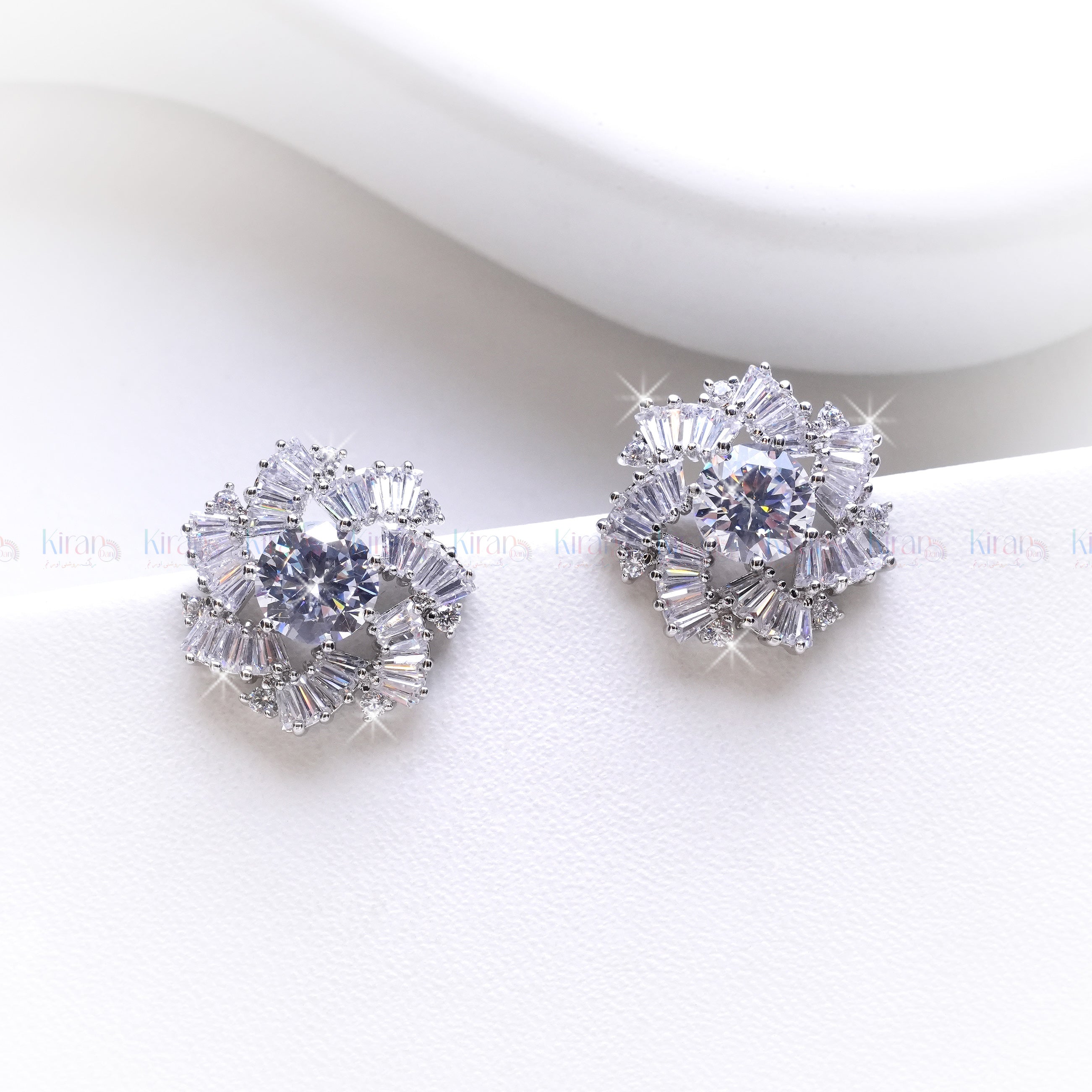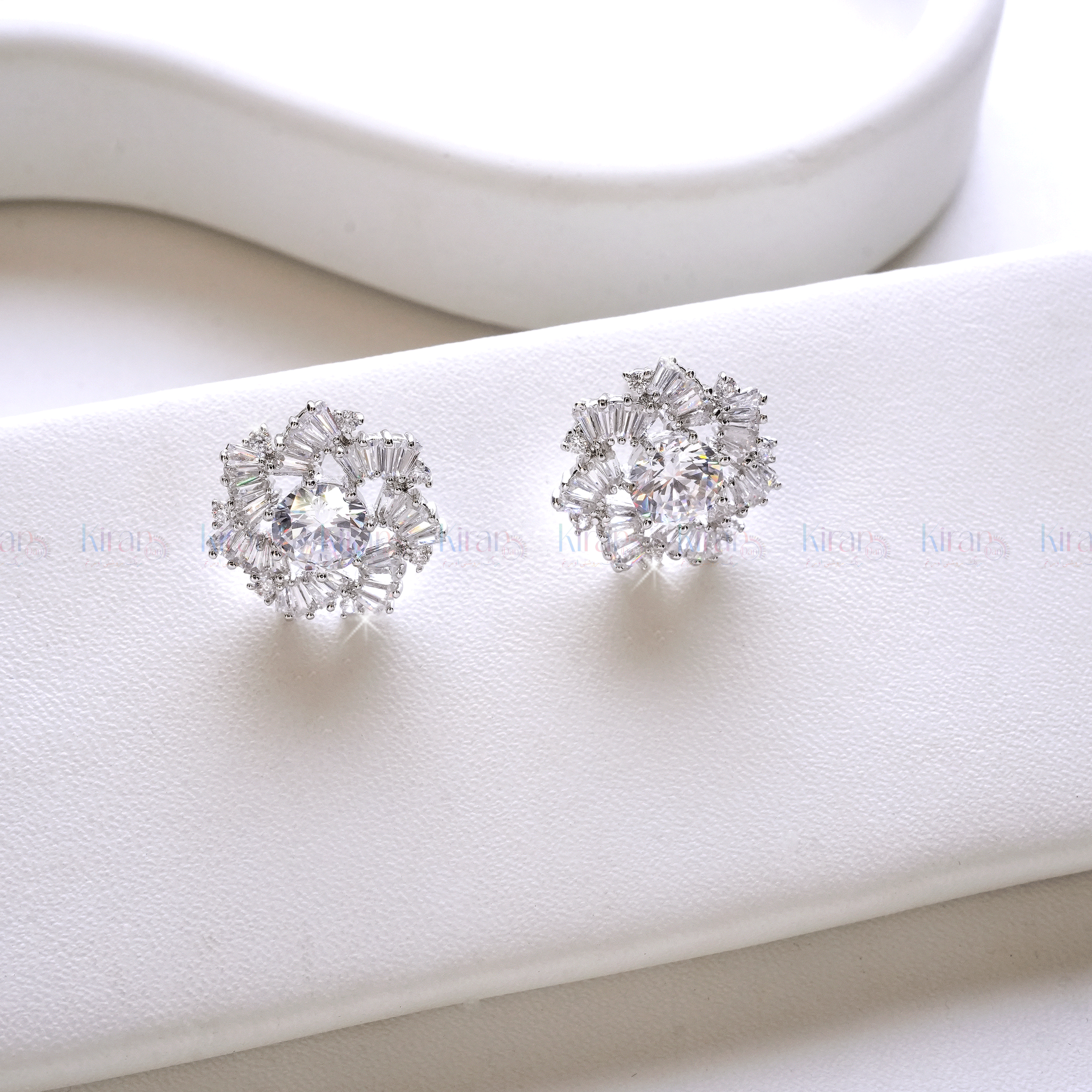 Add a touch of luxury and elegance to your collection with our Silver Bloom Earrings. Featuring a stunning Silver central stone, encircled by brilliant baguette-cut zircons, this exquisite design captures the essence of timeless sophistication. Set in a high-quality silver-toned metal, these earrings sparkle with every movement, making them a perfect statement piece for any occasion.