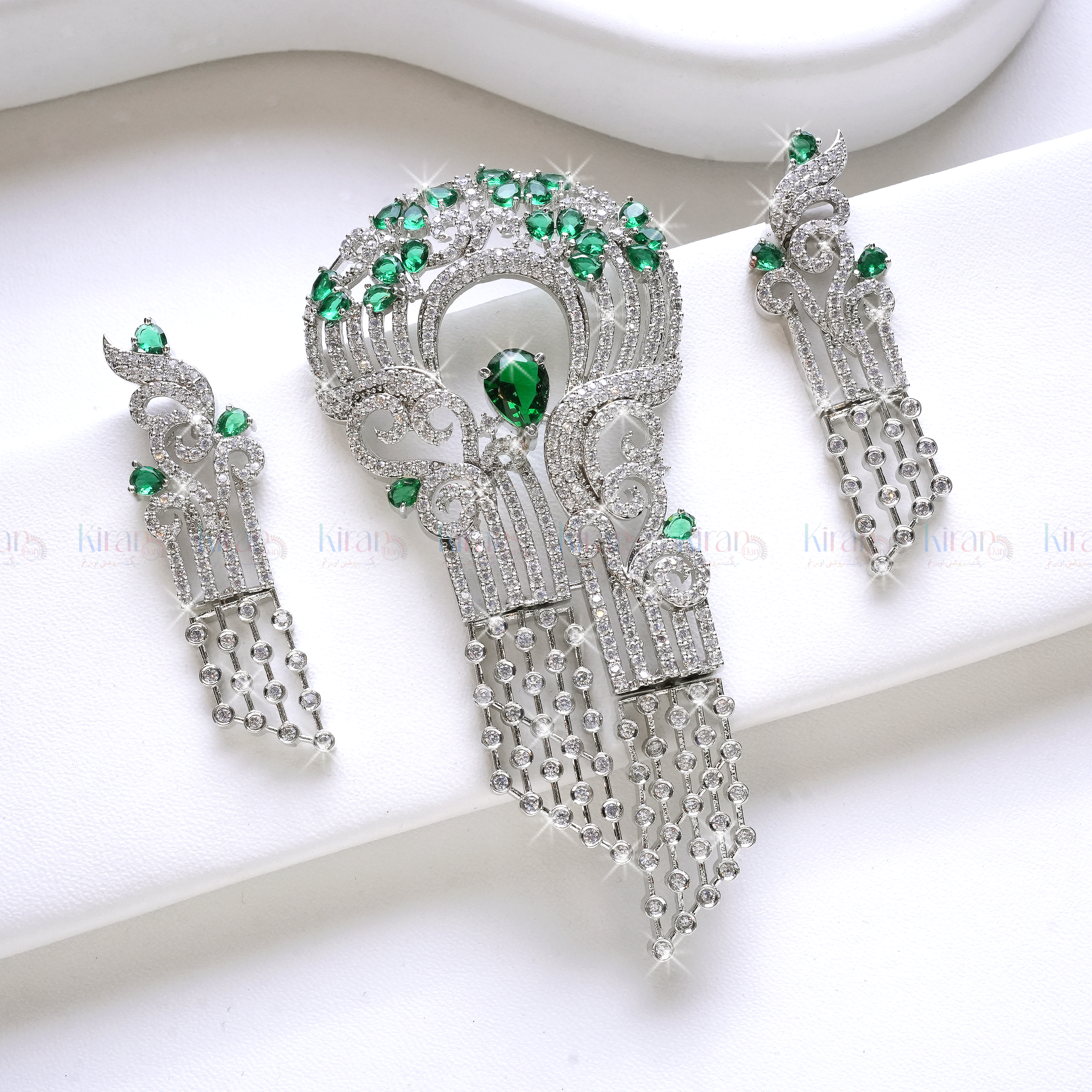 Elevate your elegance with our Emerald Radiance Set, a breathtaking combination of brooch and earrings that exudes sophistication, opulence, and timeless artistry. Intricately designed and masterfully adorned with shimmering crystals and deep blue accents, this set is the epitome of royal glamour.