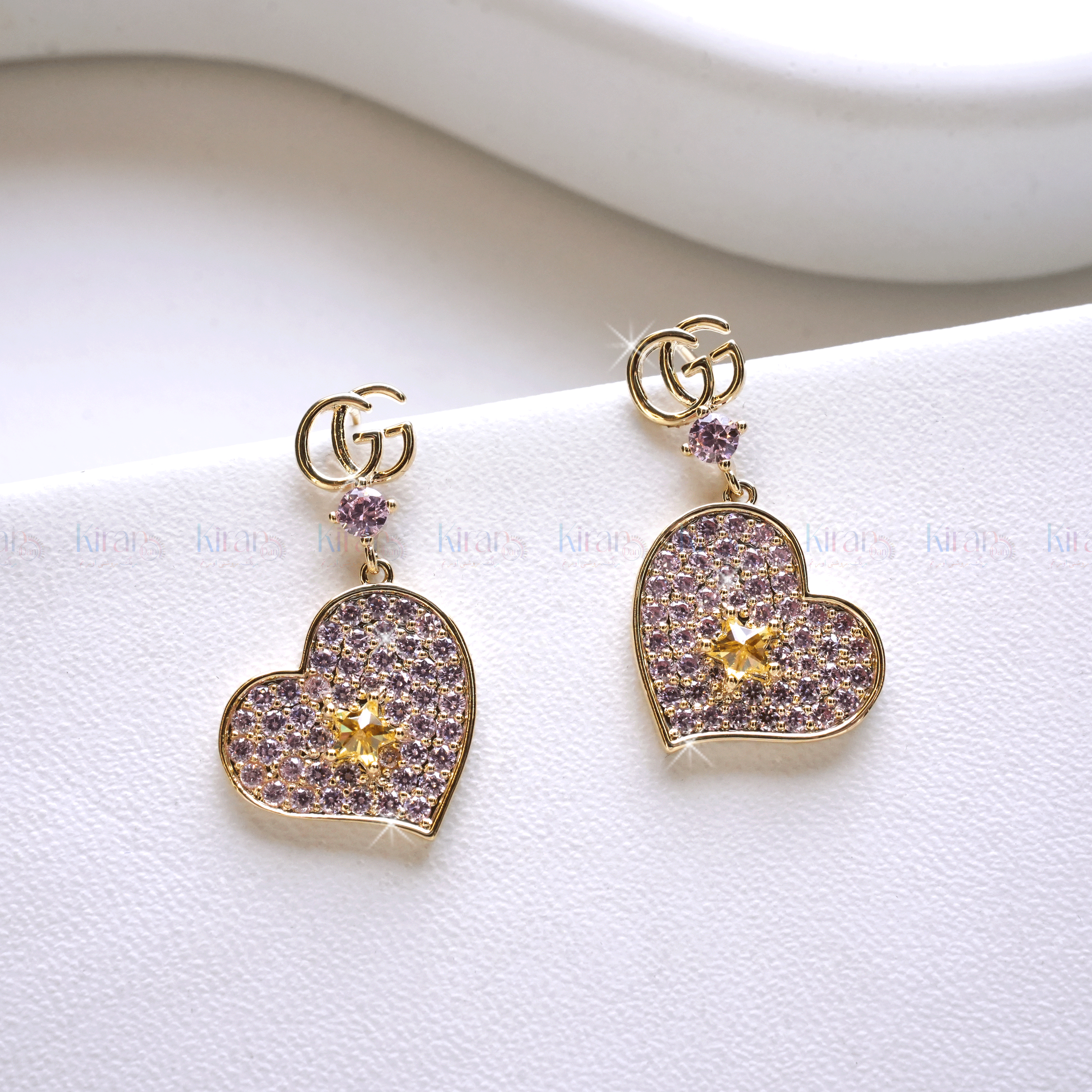 Fall in love with the dreamy sparkle of our Starlit Heart Drops. These romantic earrings feature a heart-shaped charm encrusted with soft lavender stones and a radiant golden star at the center. Accented with a glimmering stud and golden double-G detail, they add the perfect blend of playful charm and elegance to any outfit. Whether it's a casual day out or a special evening, these earrings are sure to make you feel absolutely stunning.