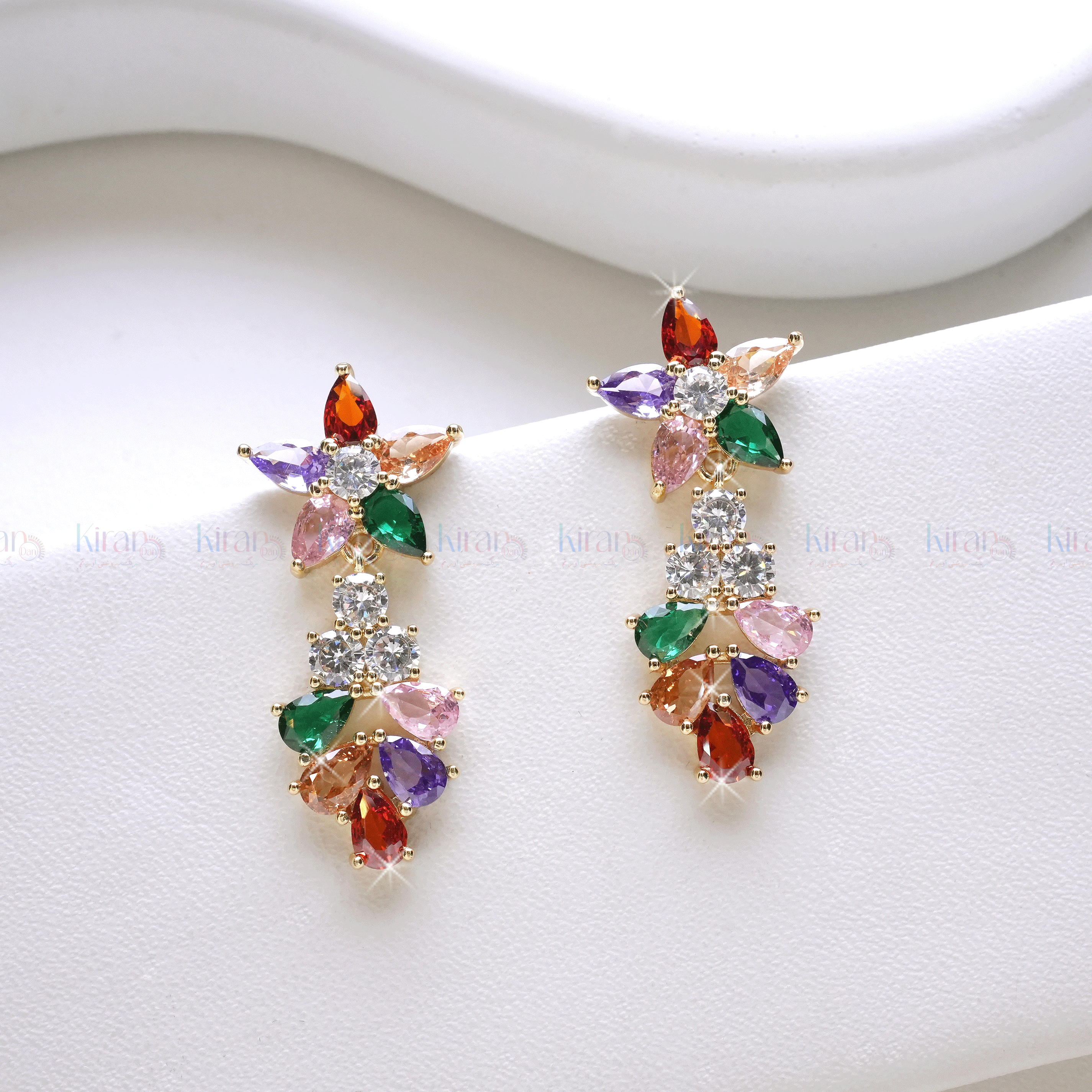 Add a burst of color and elegance to your jewelry collection with the Stellar Multi-Stone Earrings. These dazzling earrings feature an intricate floral design, adorned with a stunning combination of vibrant gemstones in rich hues of emerald green, amethyst purple, ruby red, blush pink, and champagne gold. The sparkling cubic zirconia accents add a touch of brilliance, making these earrings a perfect blend of glamour and sophistication.