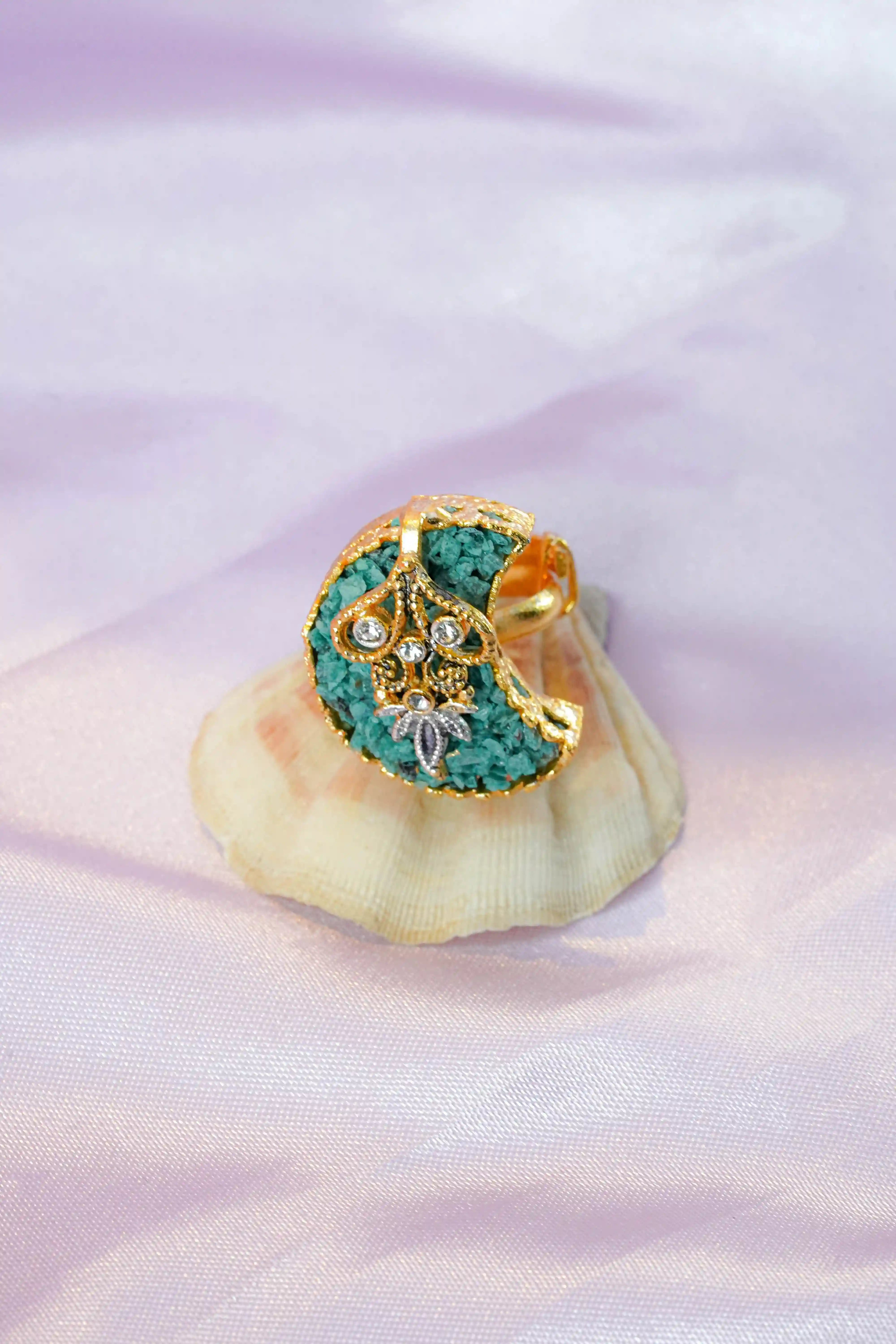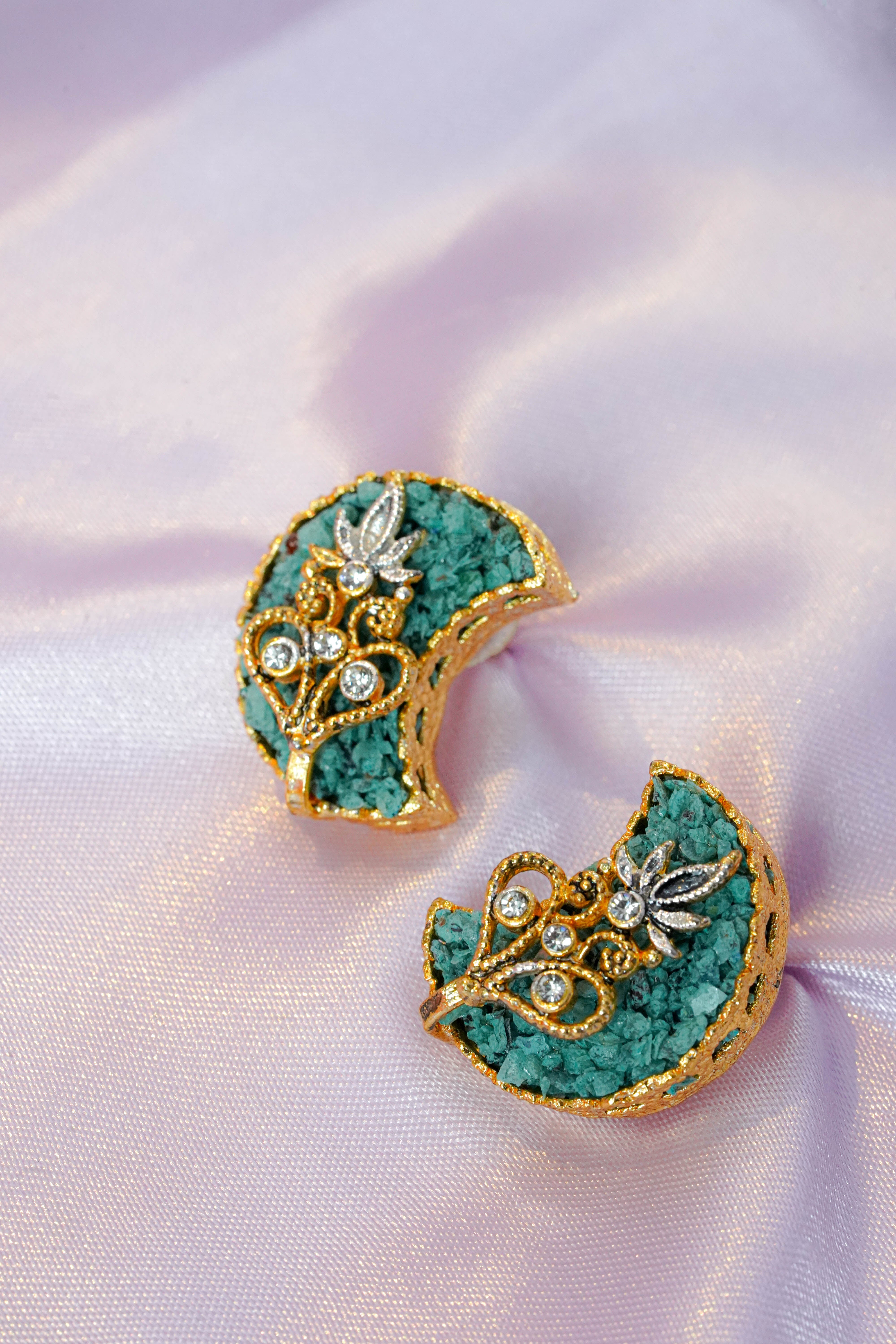 This jewelry set draws inspiration from celestial beauty, featuring a crescent moon motif adorned with floral patterns. The turquoise texture adds a touch of uniqueness, while the gold detailing enhances its luxury appeal. Perfect for both traditional attire and contemporary fashion, this set exudes charm and elegance.