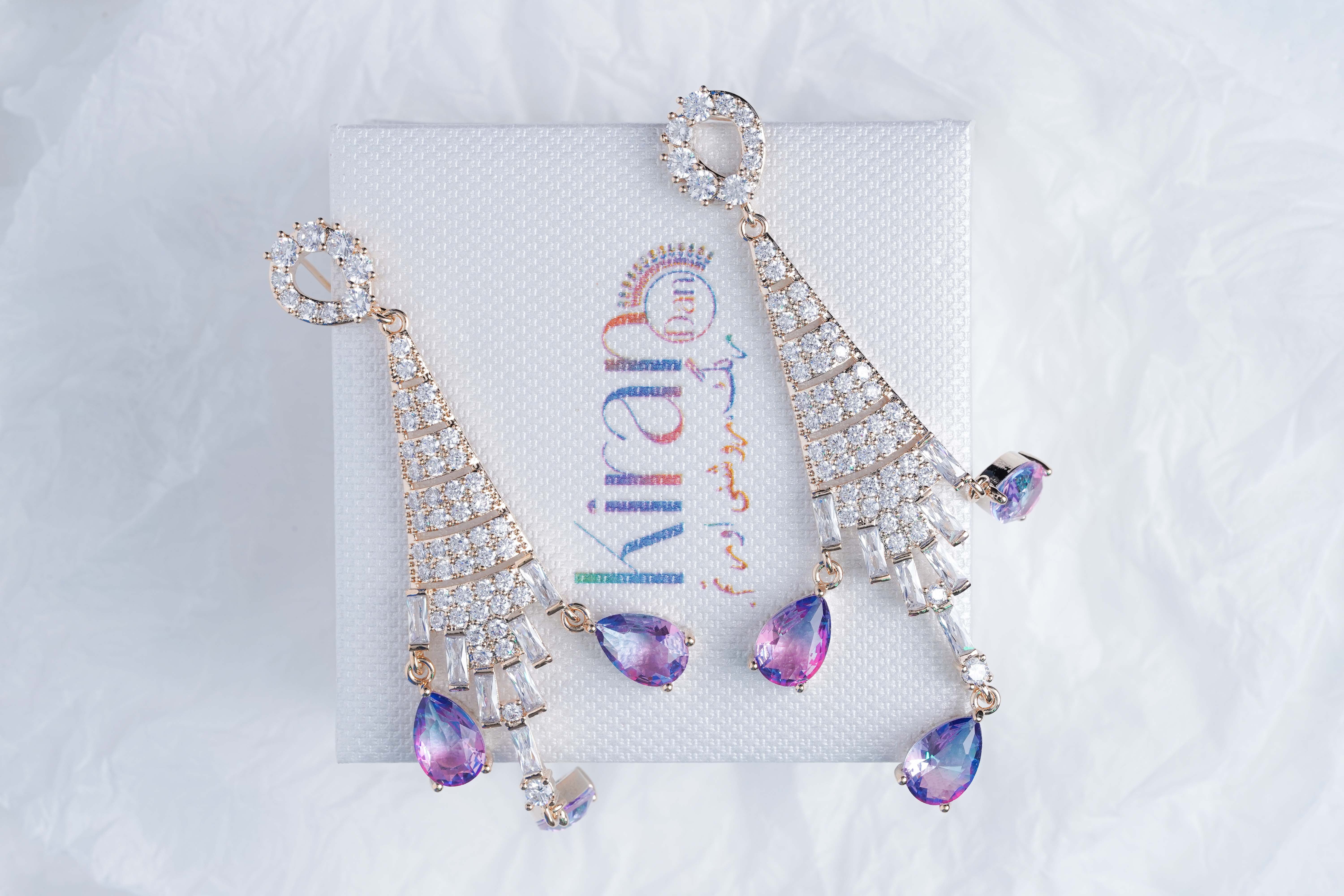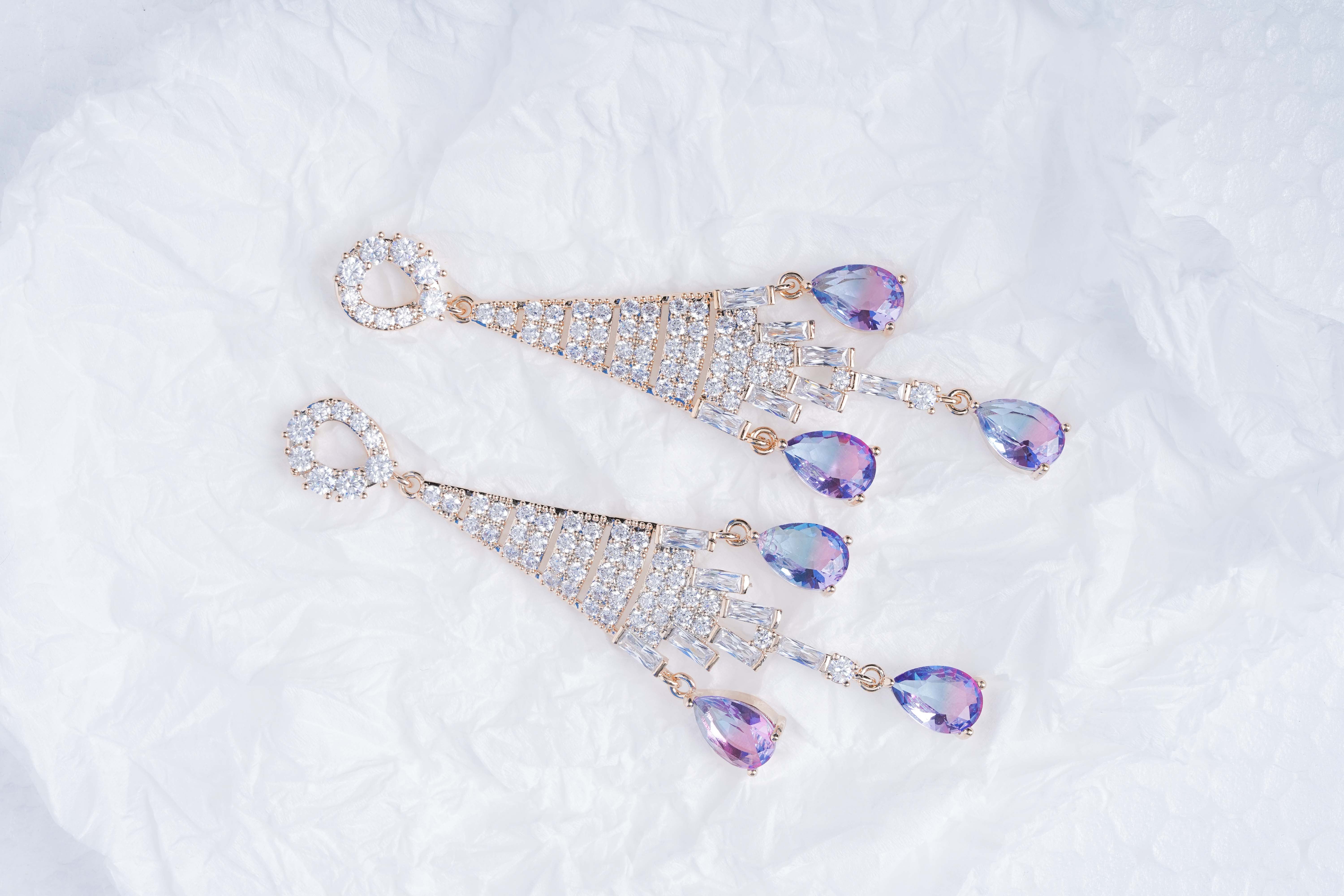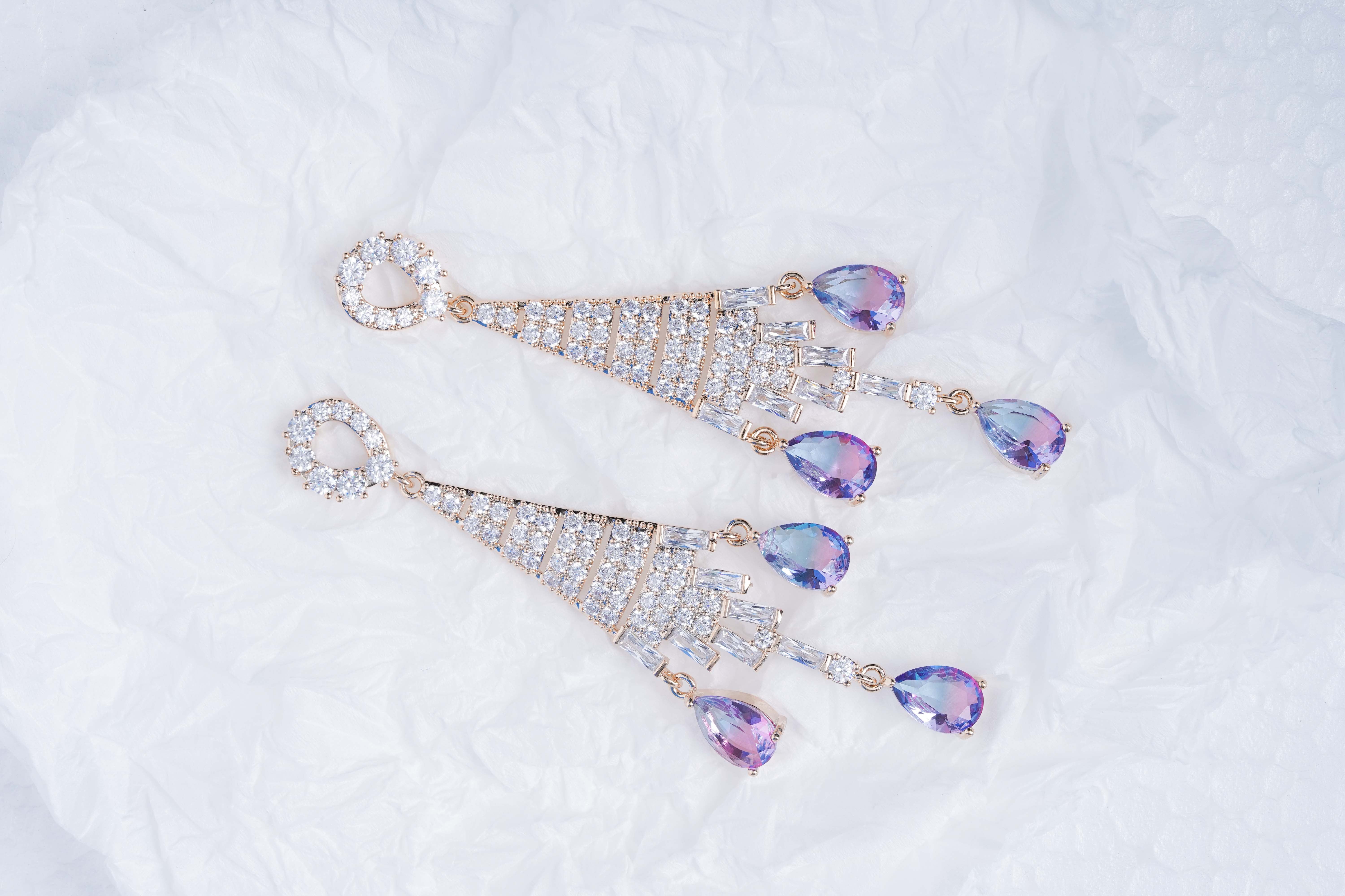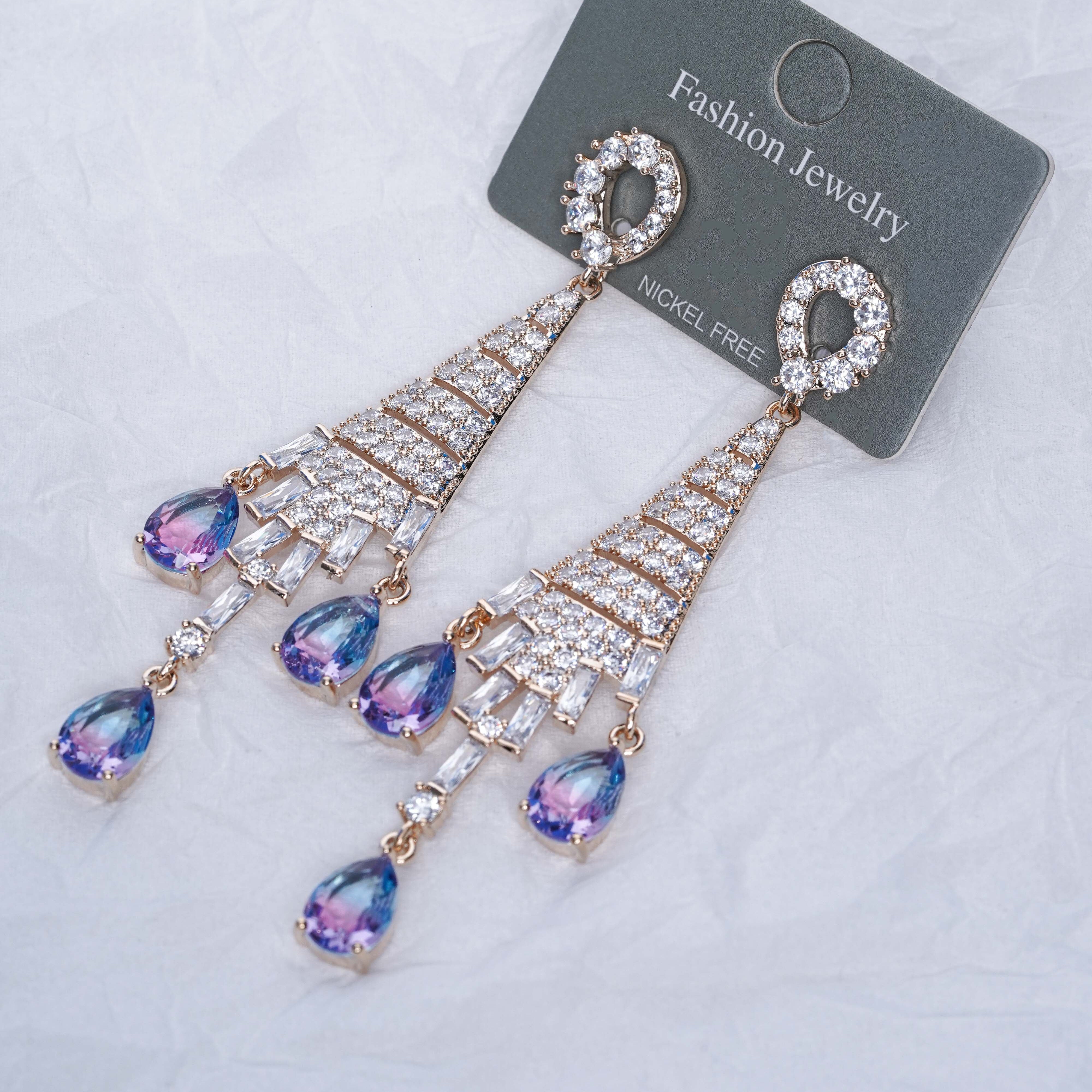 Delicate lavender-blue teardrops sway gracefully at the base, reflecting hues of twilight that shift with every movement. The cascading design, paired with a sleek gold finish, evokes the grandeur of evening elegance — perfect for modern brides, festive soirées, and glamorous nights out.