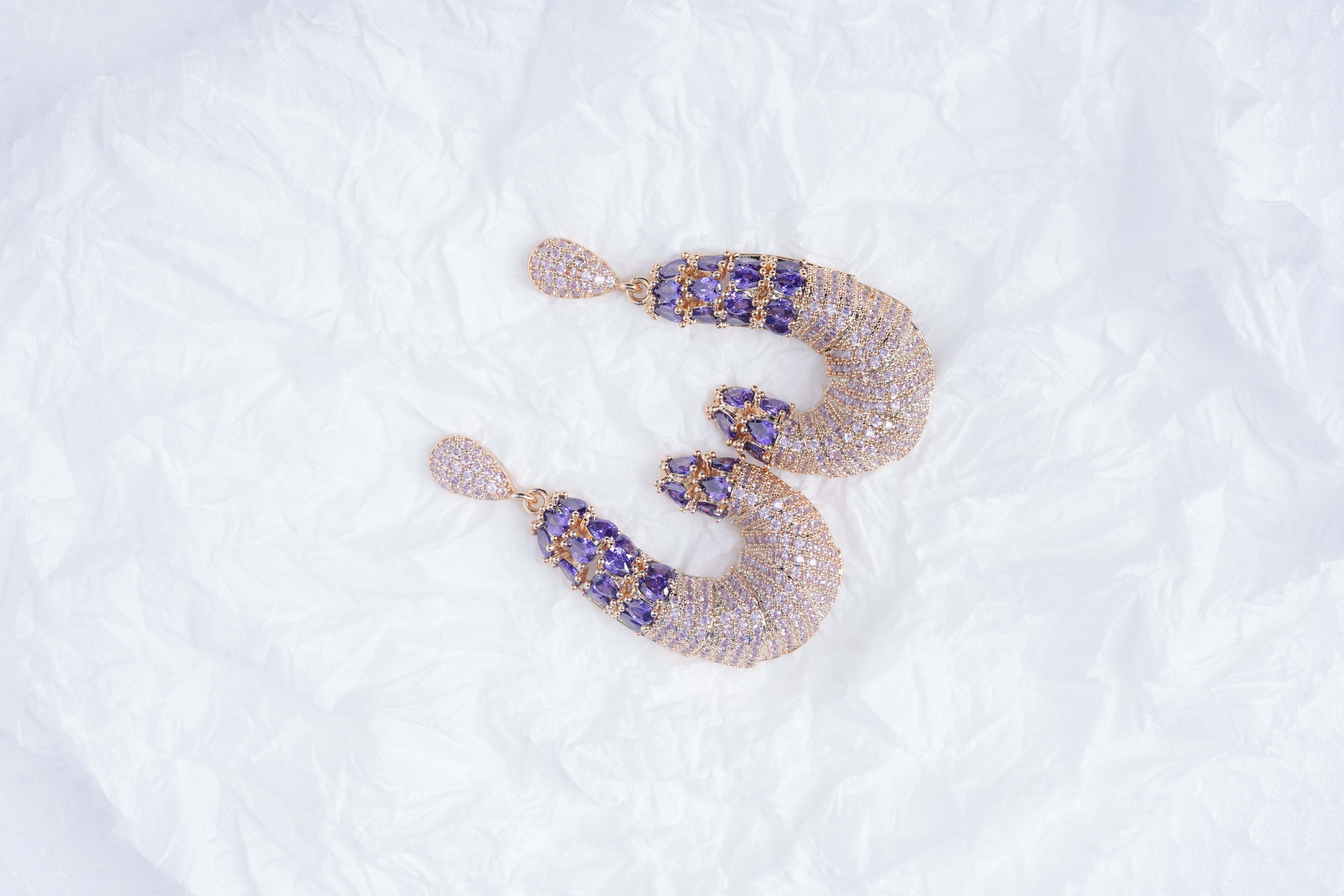 The delicate gradient of lilac and violet stones captures light beautifully, reflecting a mesmerizing play of color that feels both luxurious and enchanting. Designed for the confident woman who adores a touch of drama, these earrings are perfect for festive nights, weddings, or any moment meant to shine