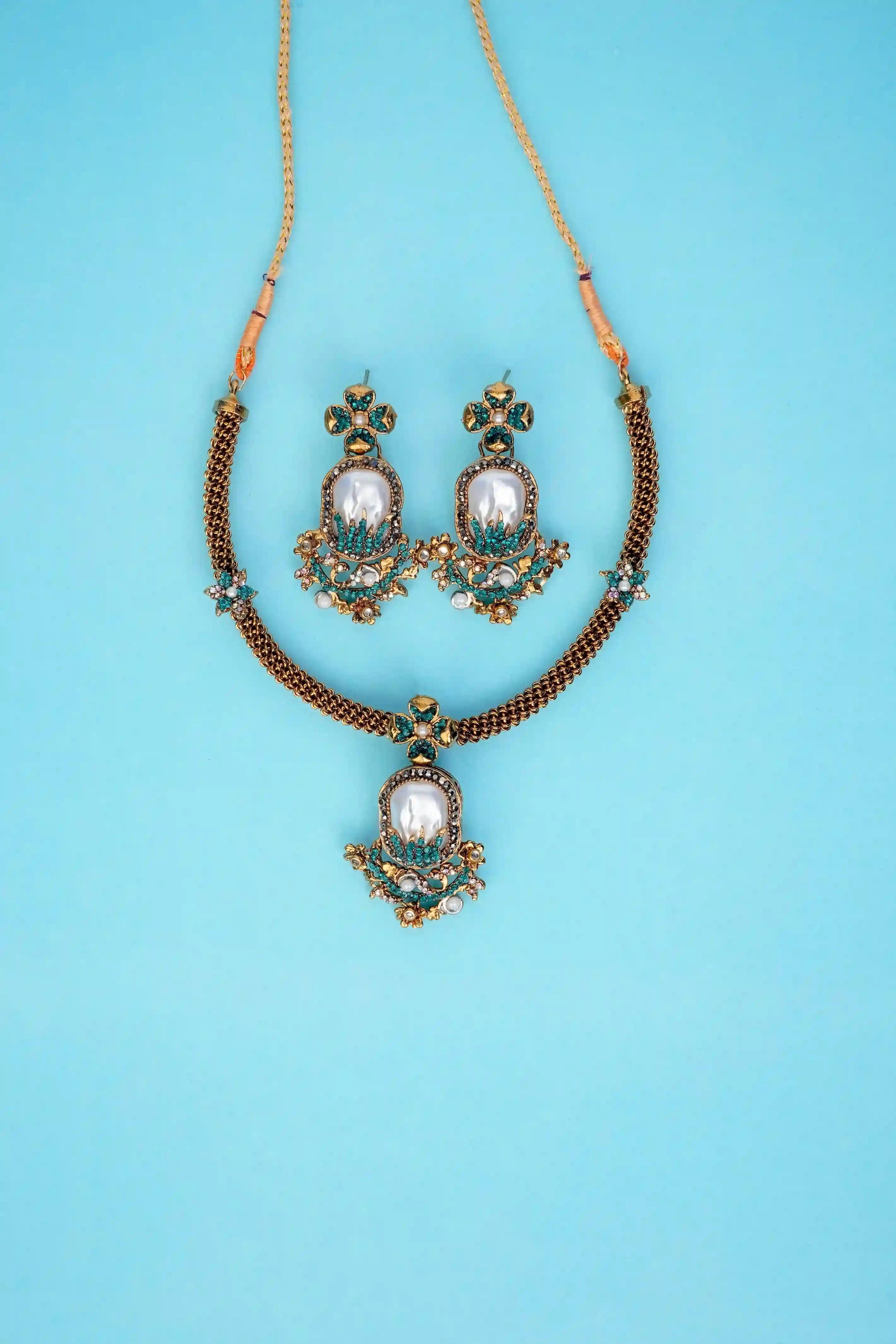 Unveil timeless elegance with the Neel Tara Pearl Necklace Set, a magnificent fusion of baroque pearls, sparkling teal crystals, and vintage gold artistry. Crafted with intricate floral motifs and ornate hand-set embellishments, this jewelry piece reflects the richness of South Asian tradition with a contemporary twist — perfect for festive, bridal, or evening occasions.