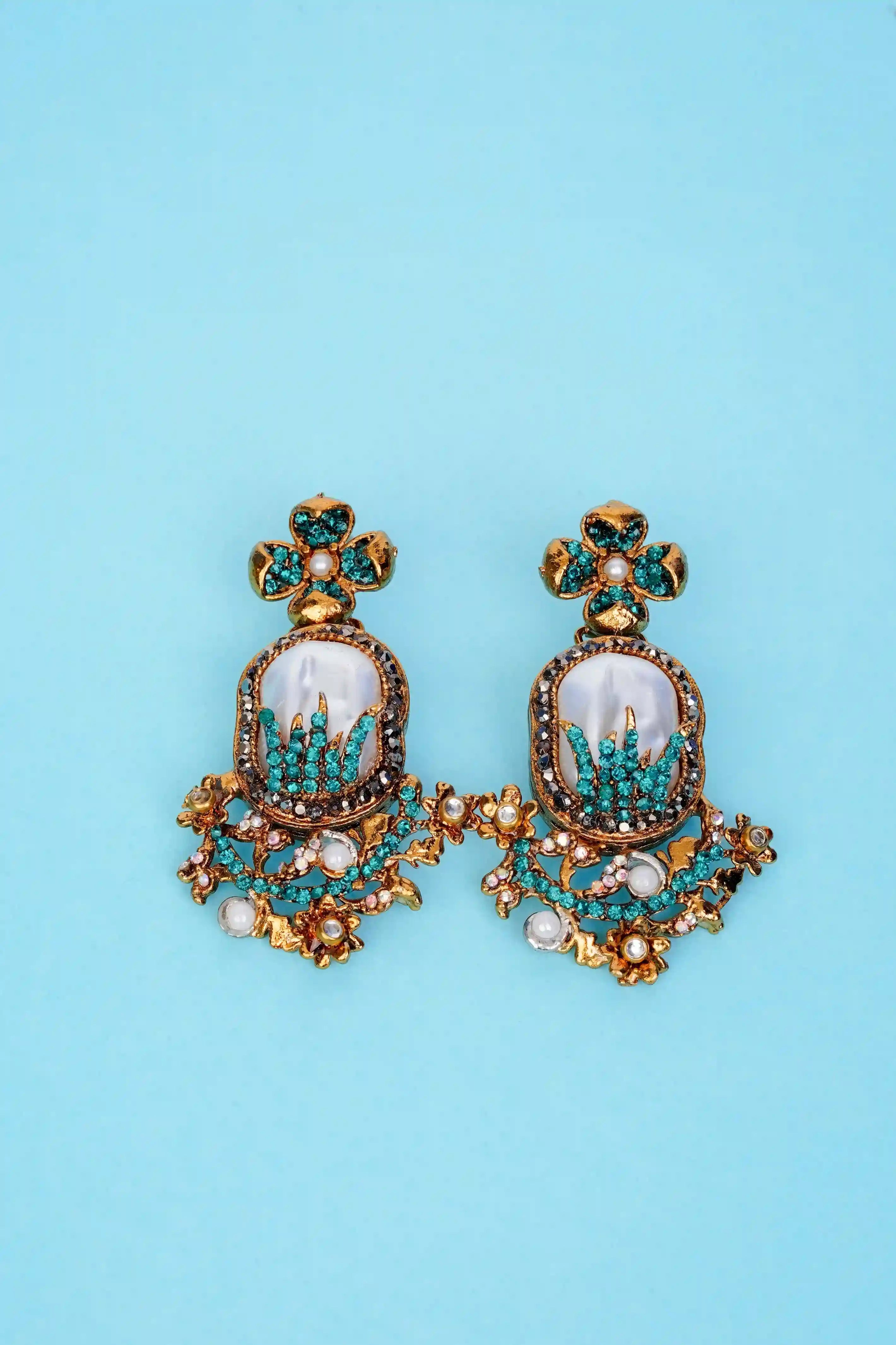 Centerpiece Motif: Oval-shaped baroque pearls are cradled in an intricate floral vine design, with teal crystal "petals" reaching upward like lotus leaves in bloom.