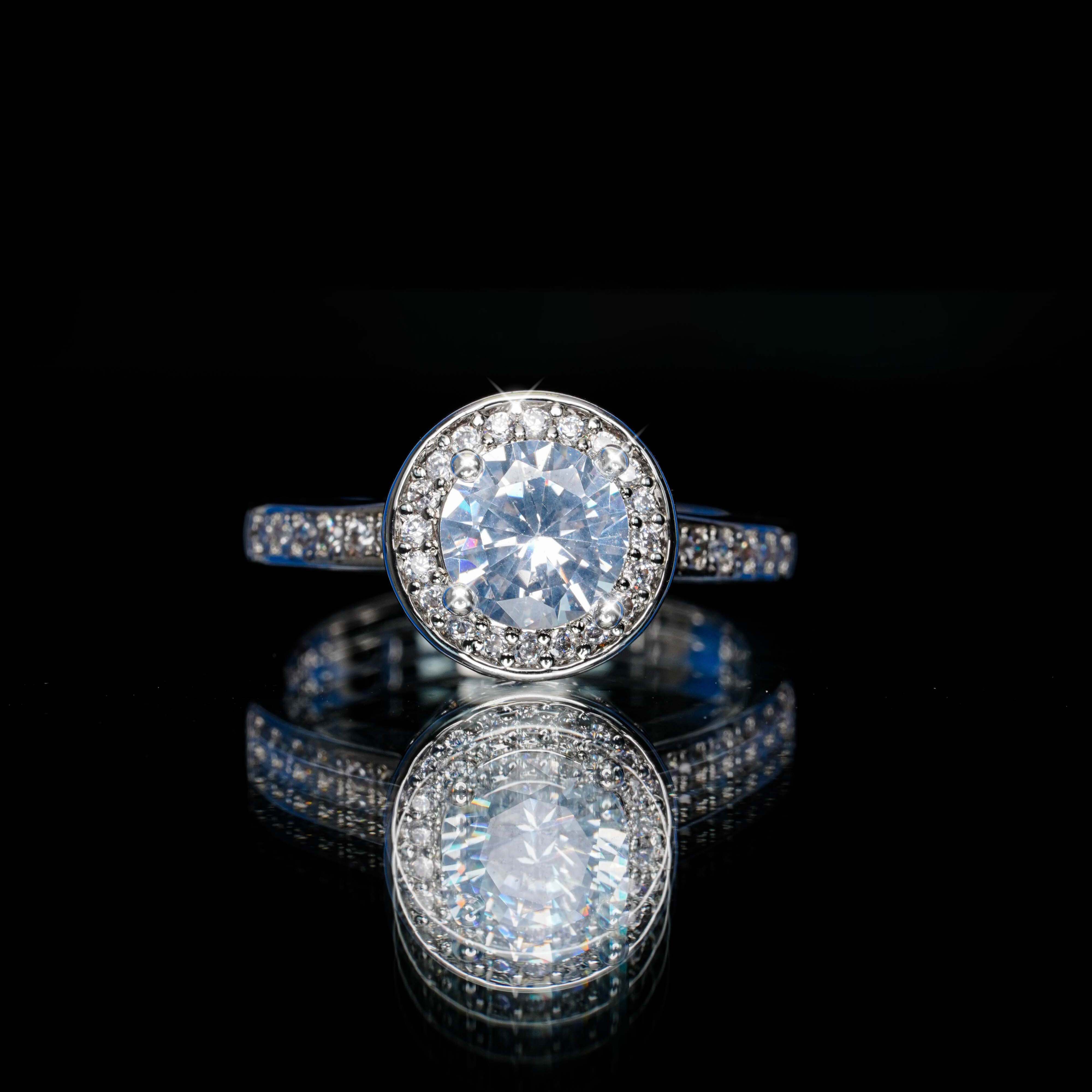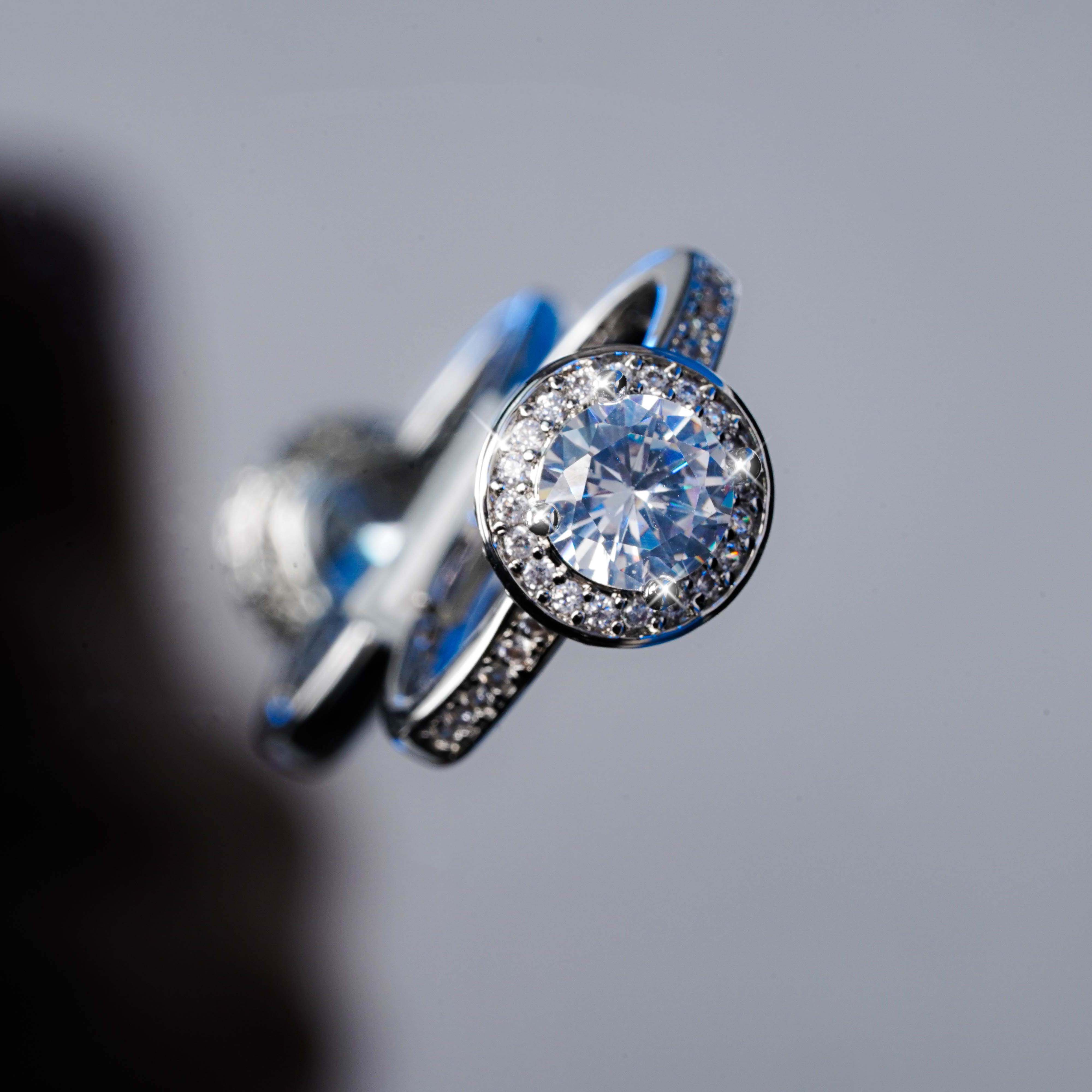 Stone Setting: Classic halo design, with a circle of dazzling accent stones amplifying the brilliance of the centerpiece.