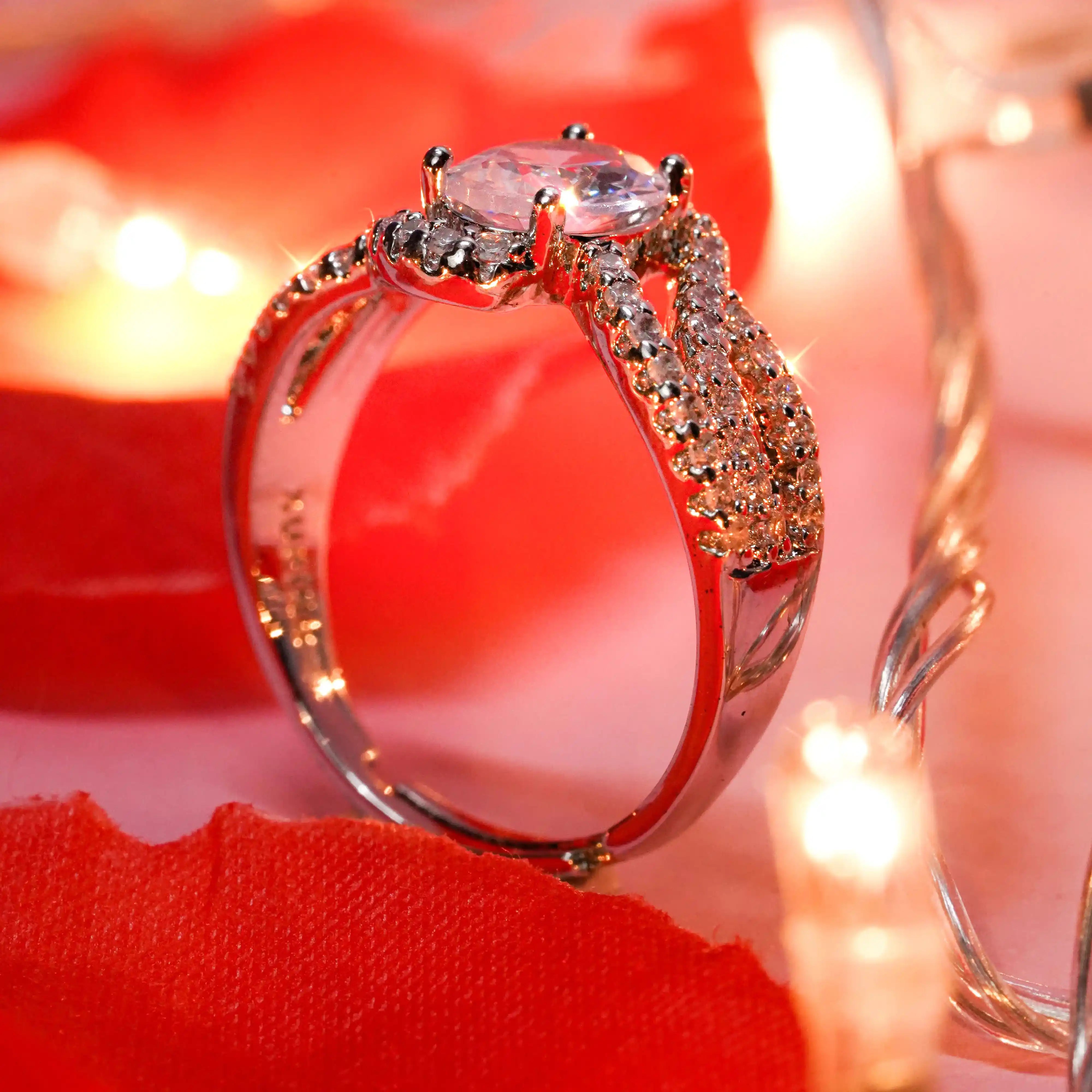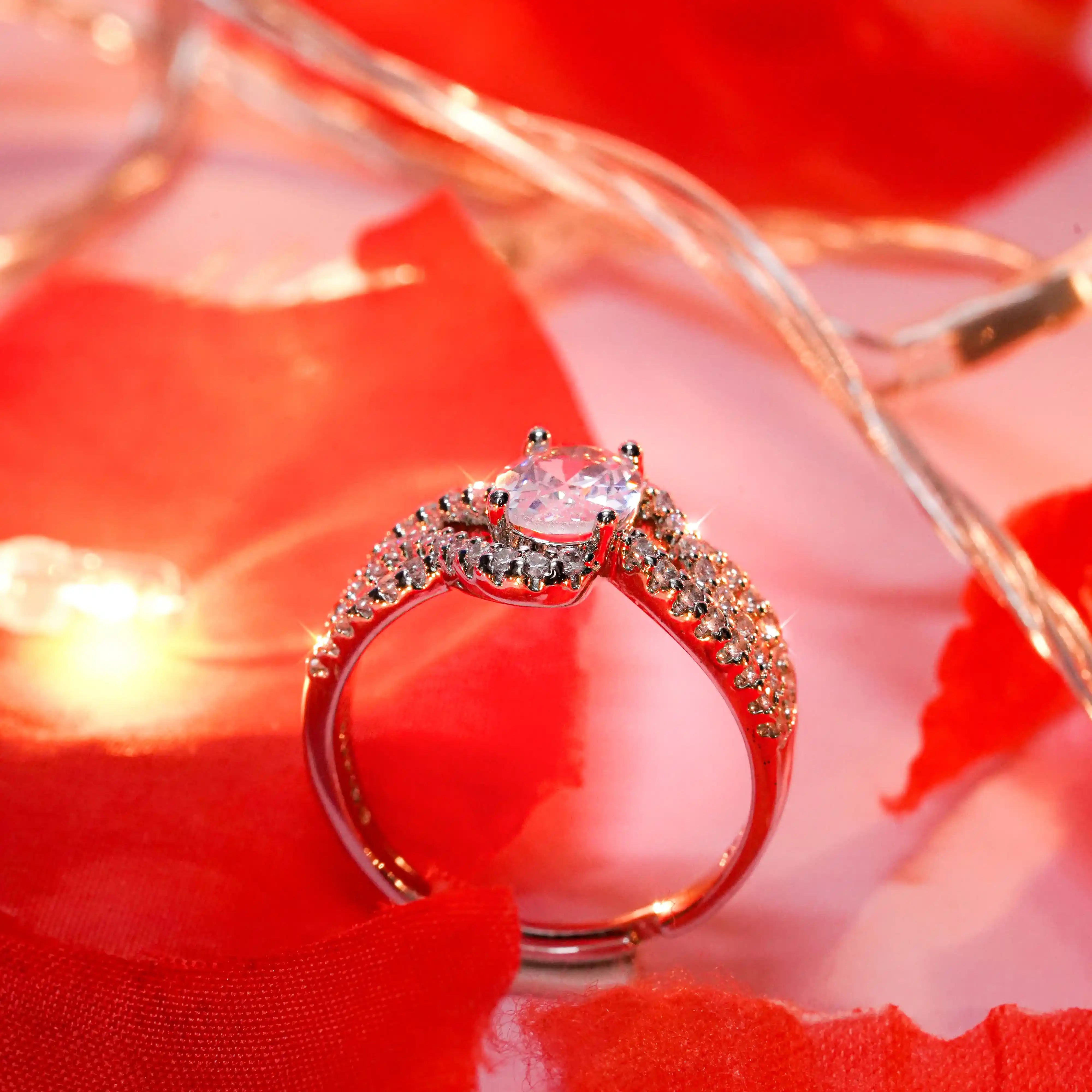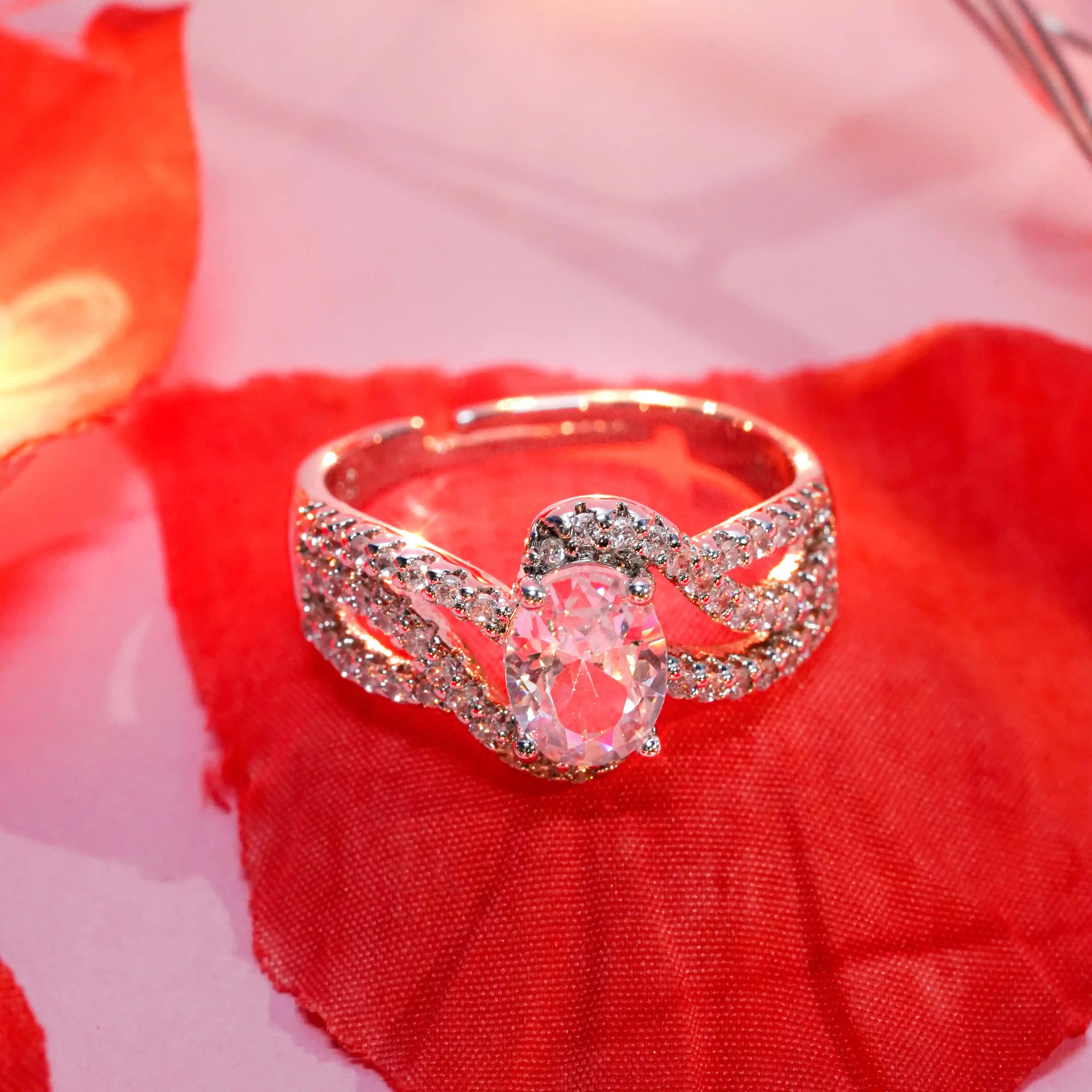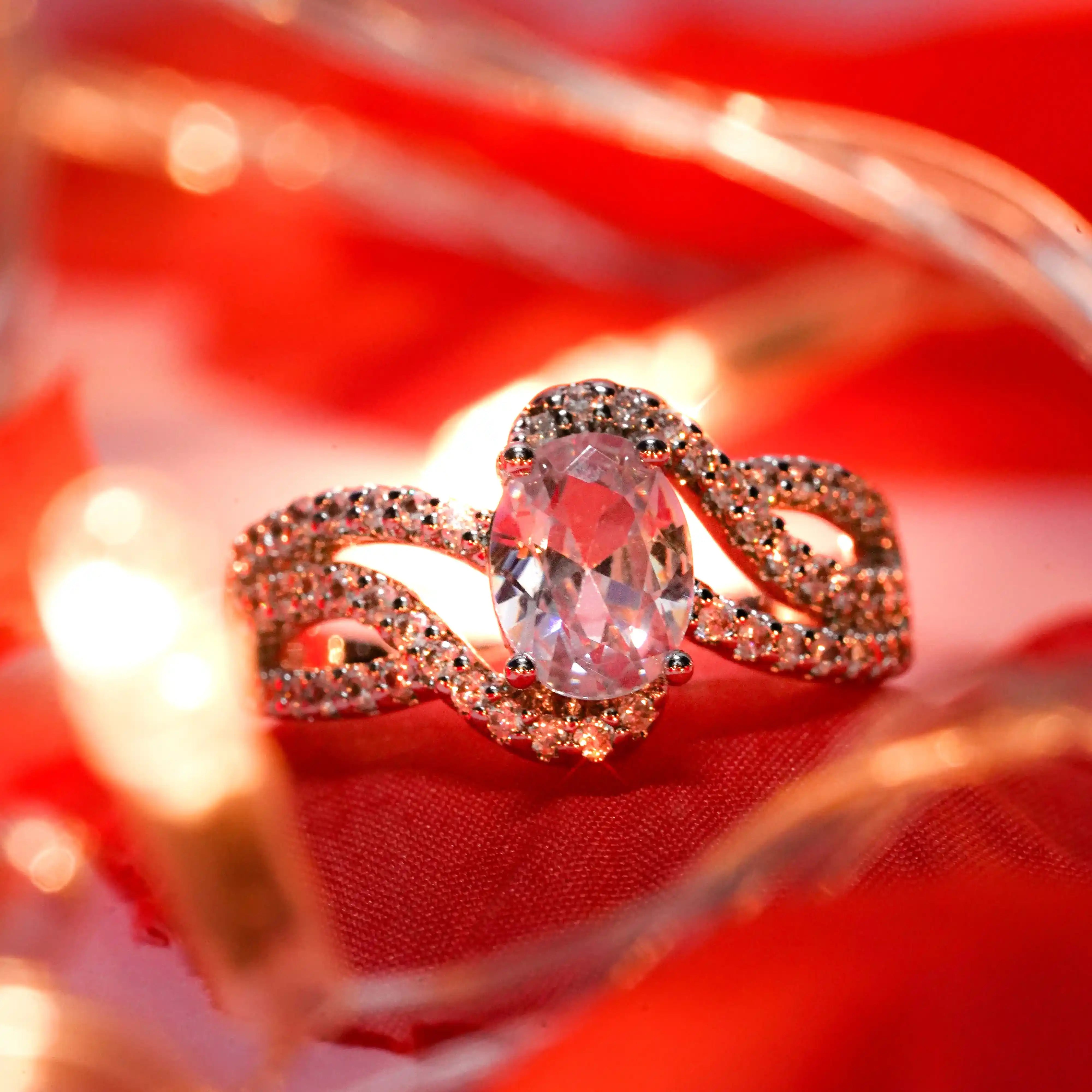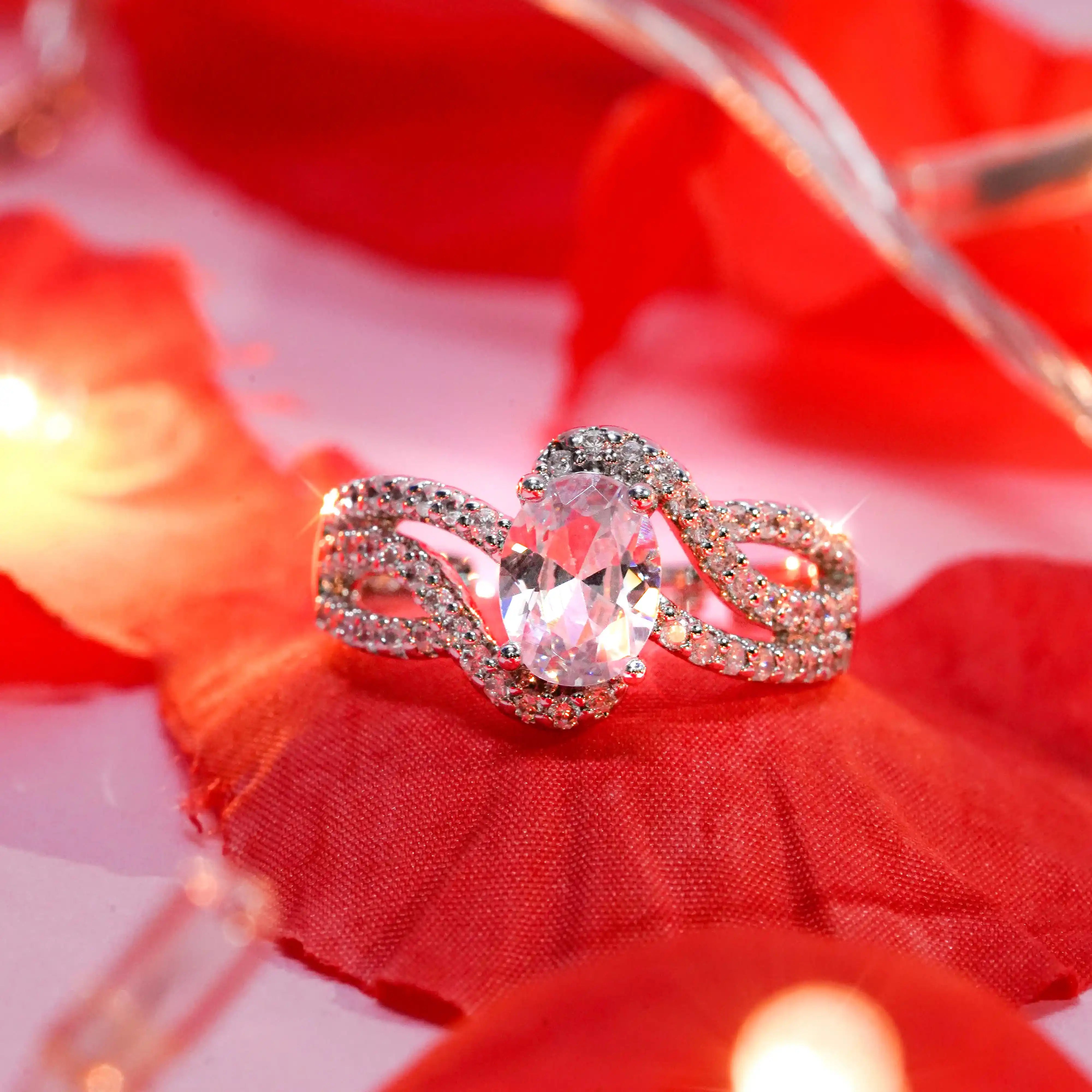 This exquisite ring features a brilliant oval-cut White gemstone at its heart, cradled by a graceful band adorned with shimmering pavé-set crystals. The intertwining design of the band adds a touch of elegance and fluidity, symbolizing unity and timeless beauty. Crafted with precision, it captures light beautifully, radiating sophistication and charm with every movement.